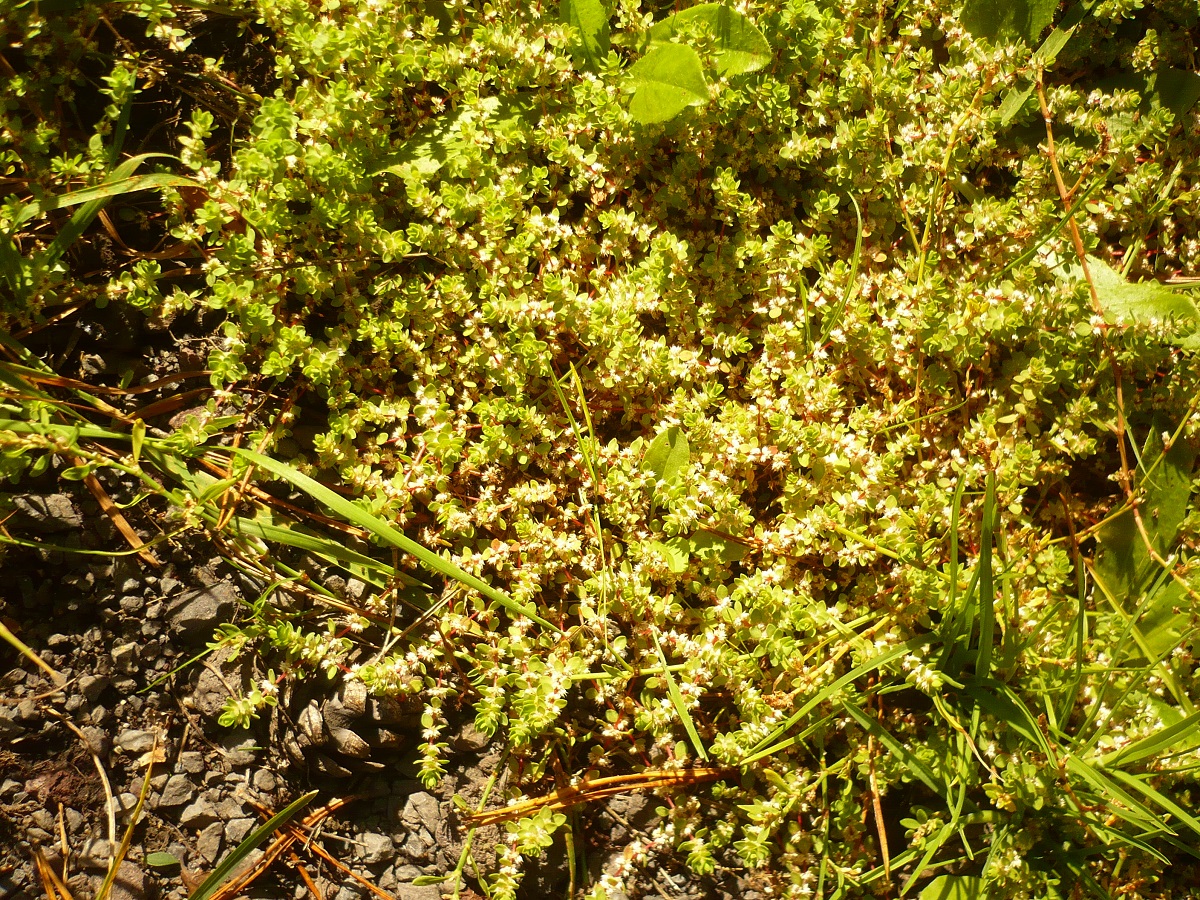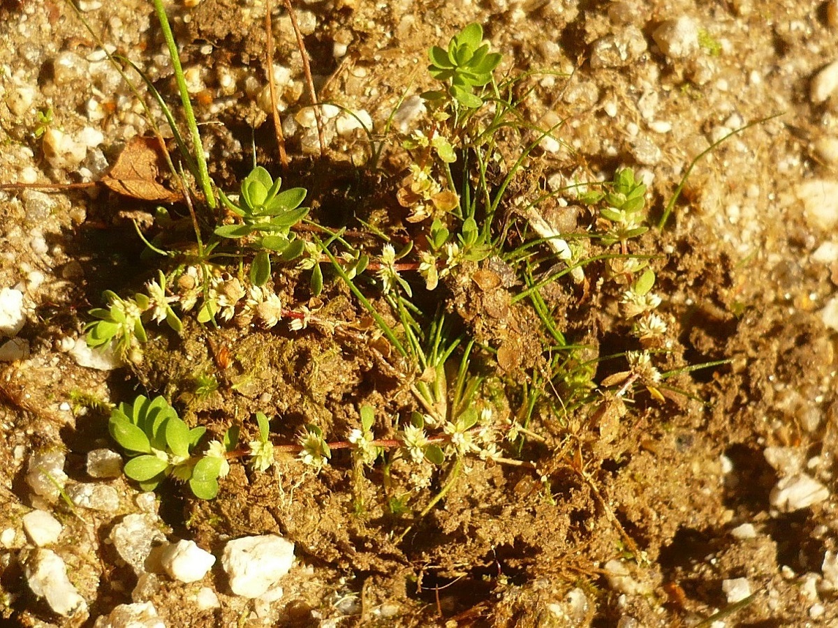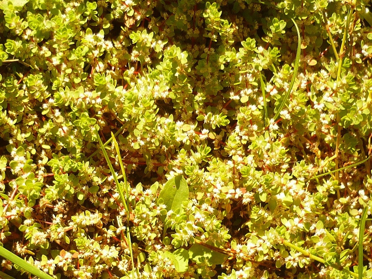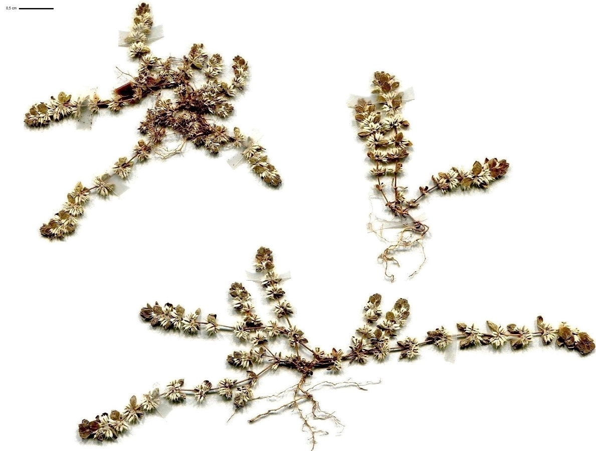 Th – 1-3 dm – Plante prostrée glabre, petites feuilles ovales opposées – Fleurs en pseudoverticilles axillaires, à sépales blancs en capuchon terminé en pointe effilée