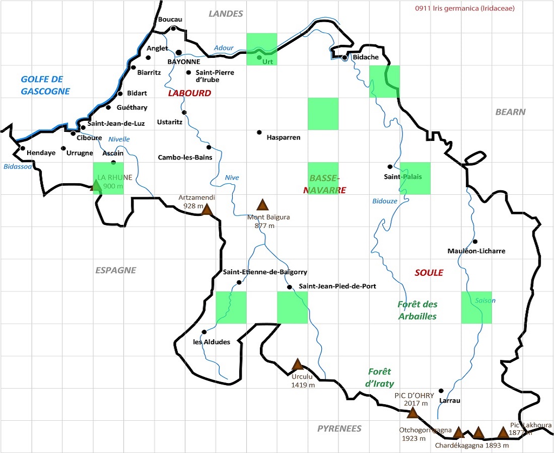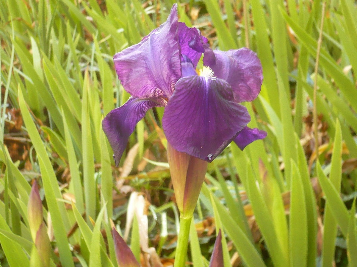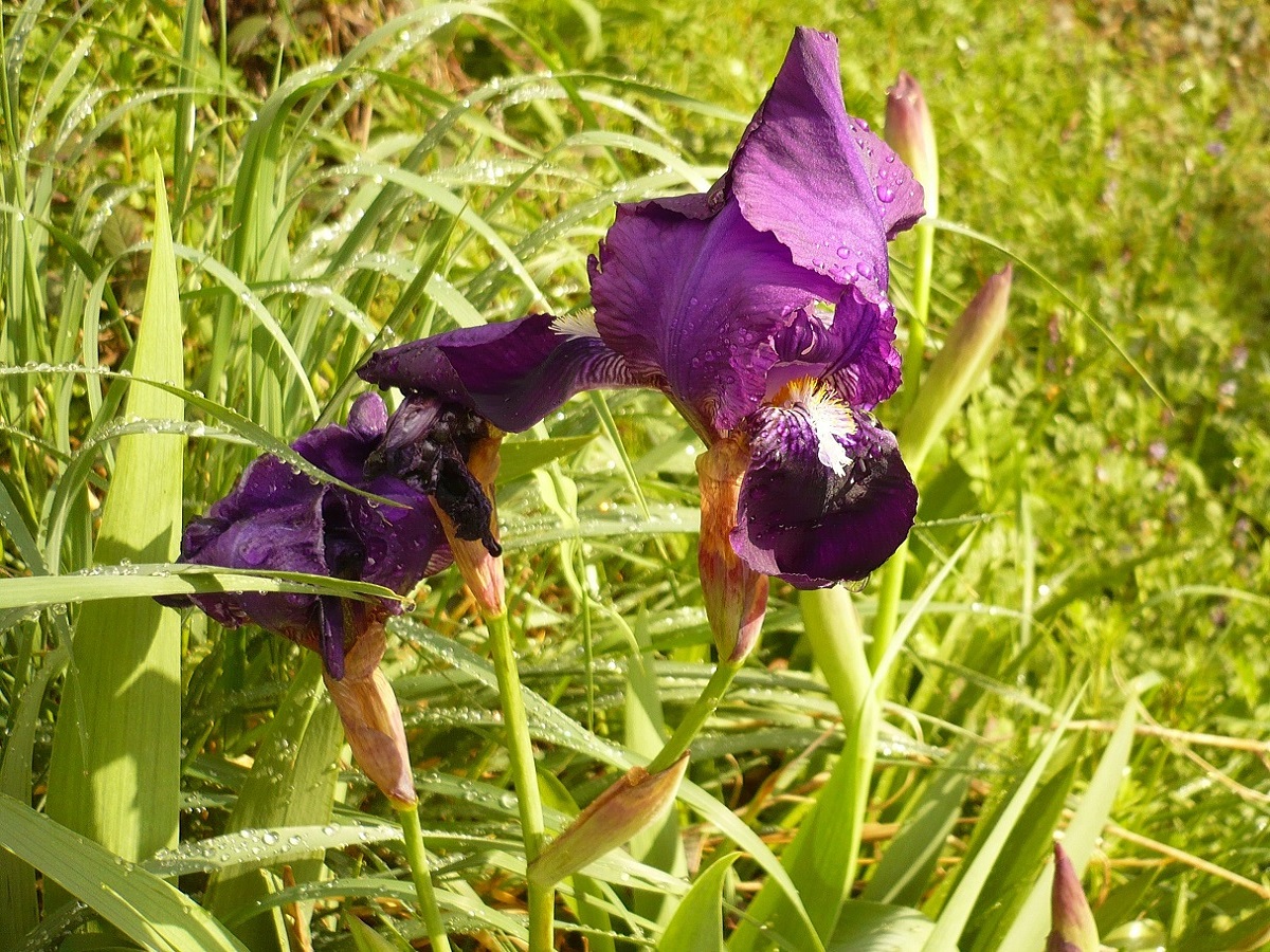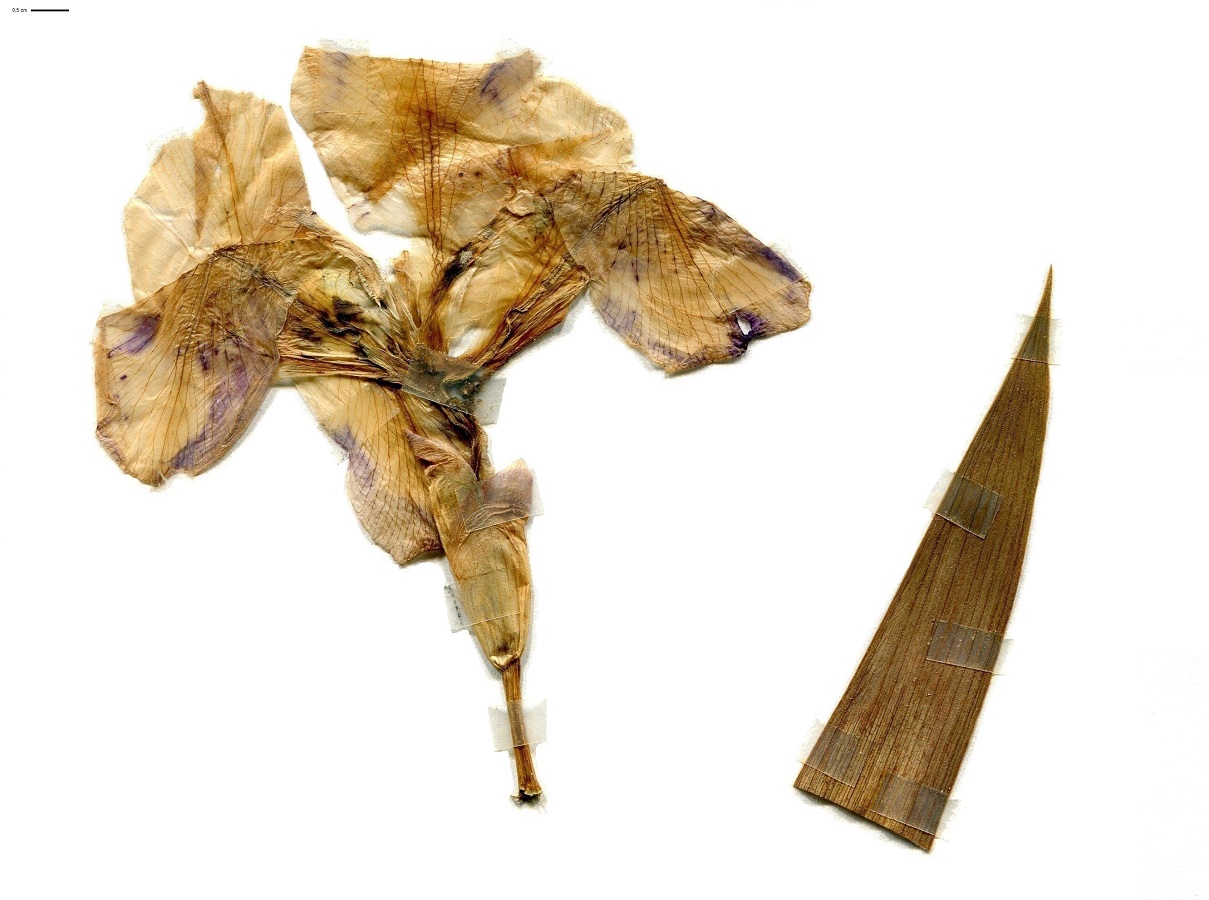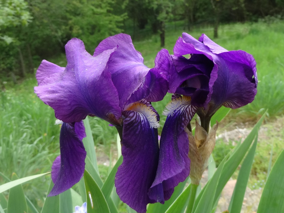 G à rhizome – 4-8 dm – Tige ramifiée, feuilles larges, ensiformes – Fleurs bleu-violet foncé, à tépales L de 6-9 cm et larges, 3 réfléchis barbus et 3 dressés, spathe ± pourprée