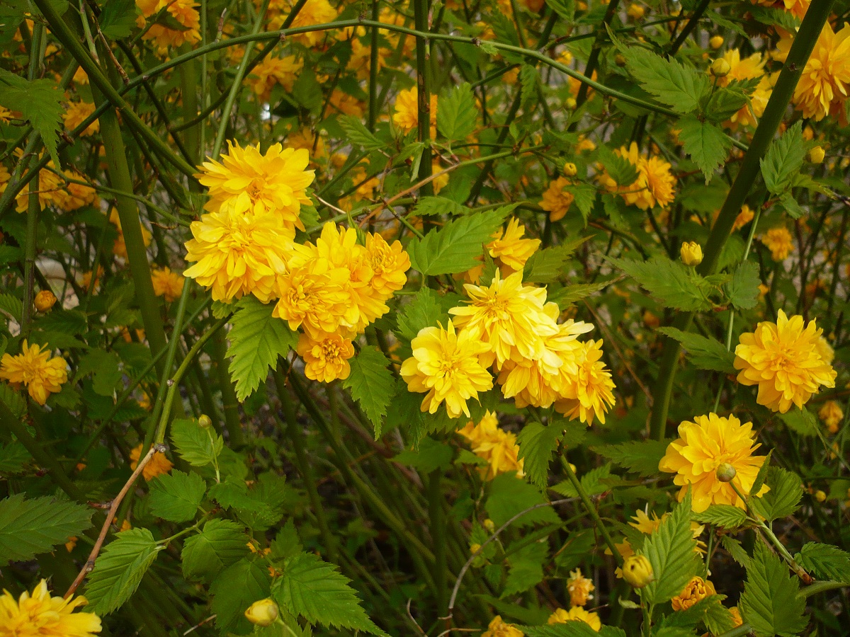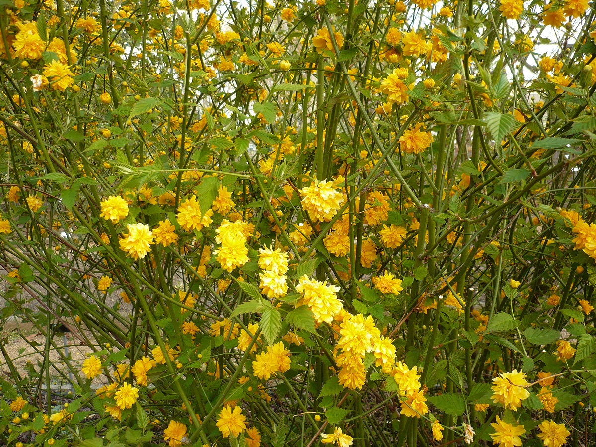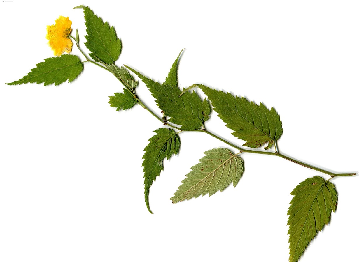 NPh – 1-3 m – Tiges vertes, feuilles ovales acuminées doublement dentées, pubescentes dessous – Fleurs de type 5 généralement doubles en têtes jaunes de Ø 3-4 cm