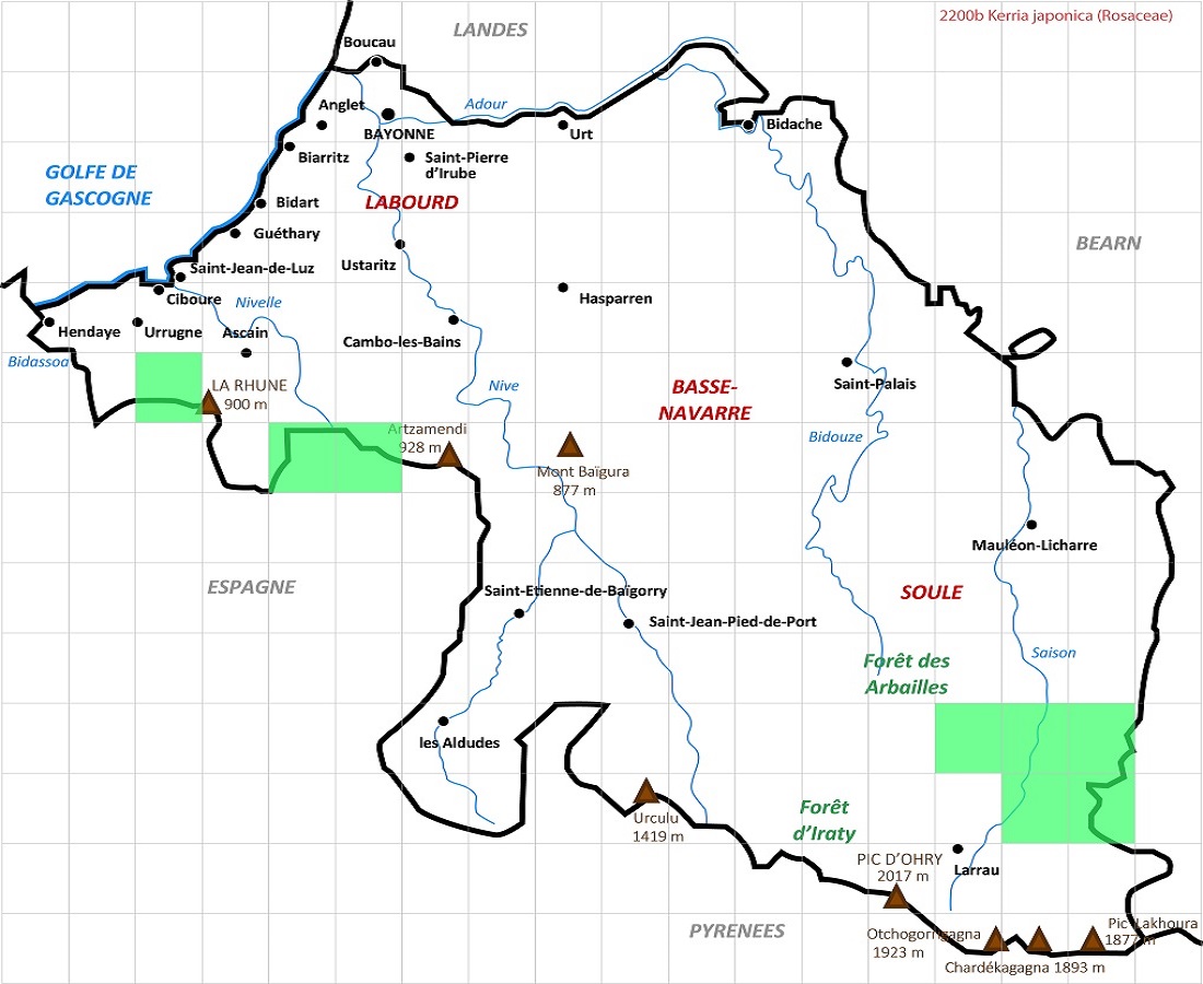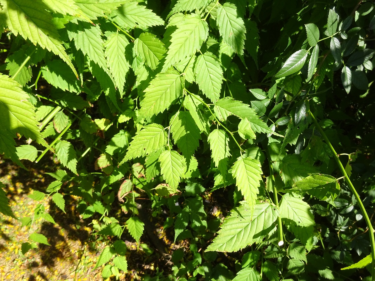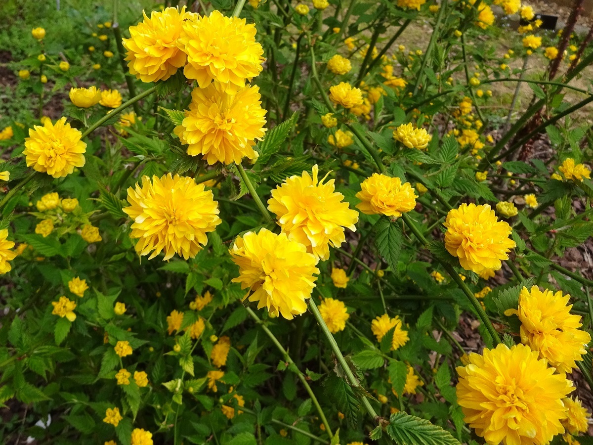 NPh – 1-3 m – Tiges vertes, feuilles ovales acuminées doublement dentées, pubescentes dessous – Fleurs de type 5 généralement doubles en têtes jaunes de Ø 3-4 cm