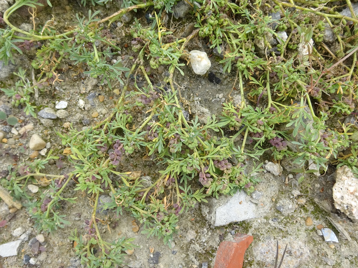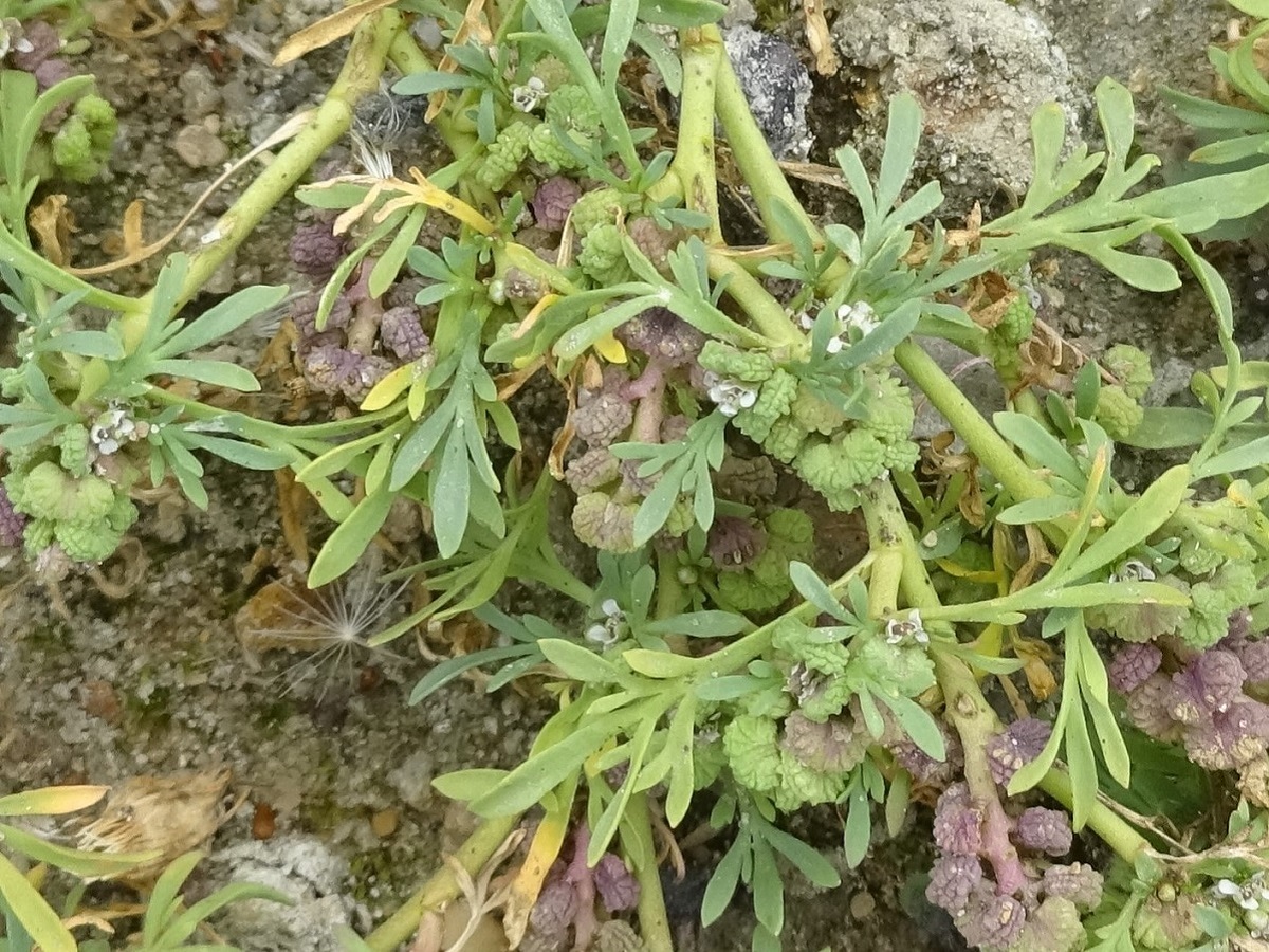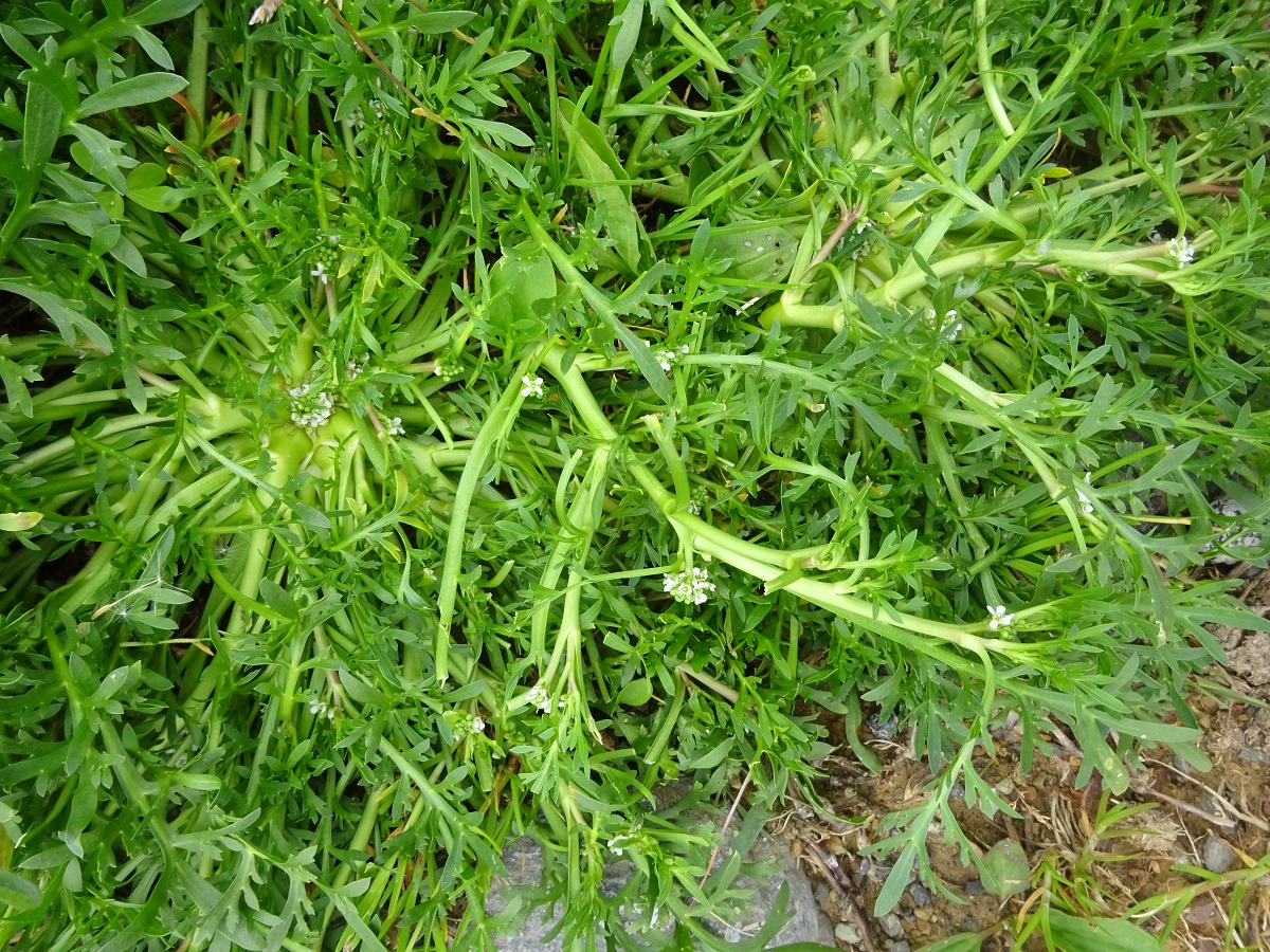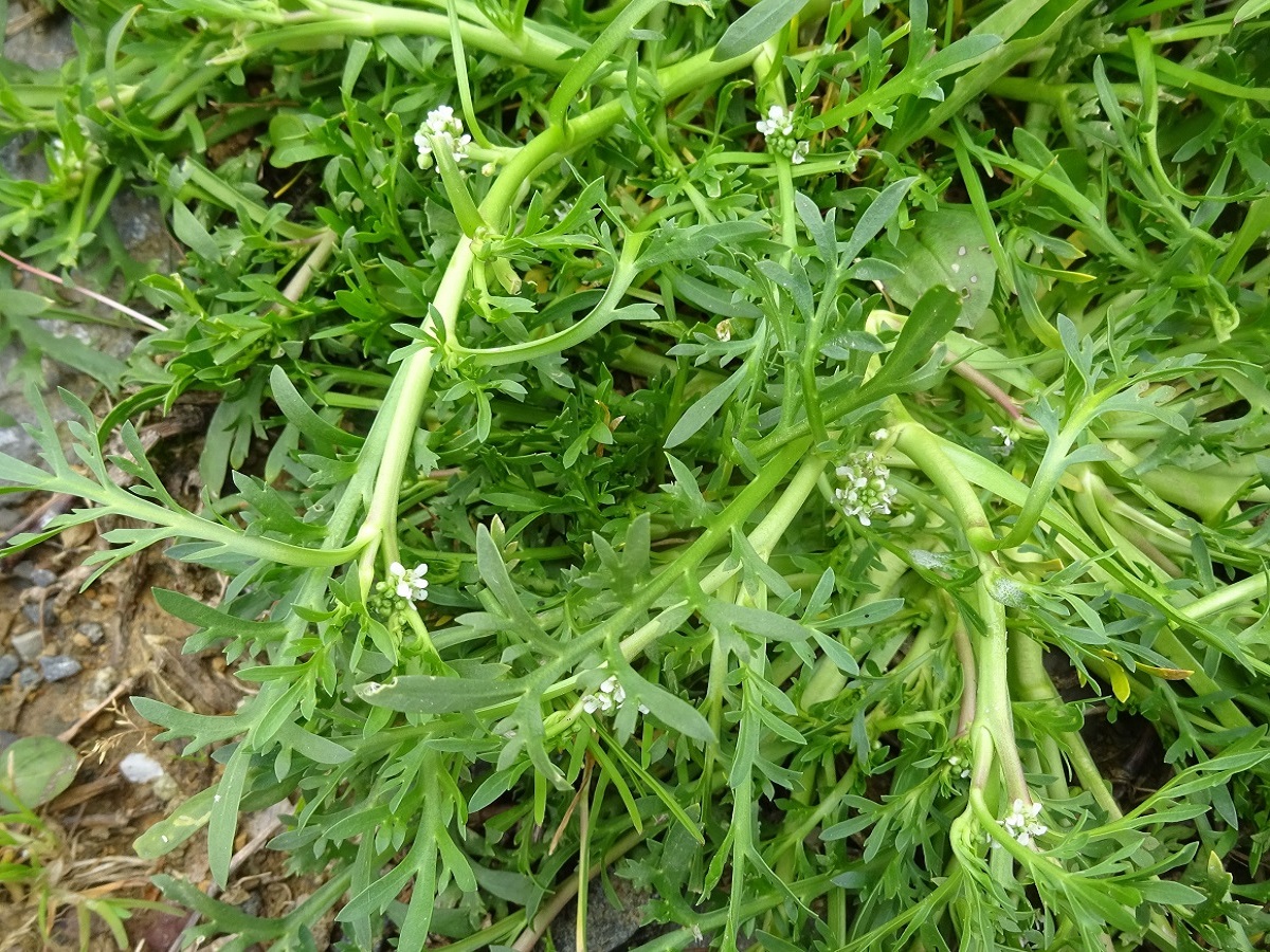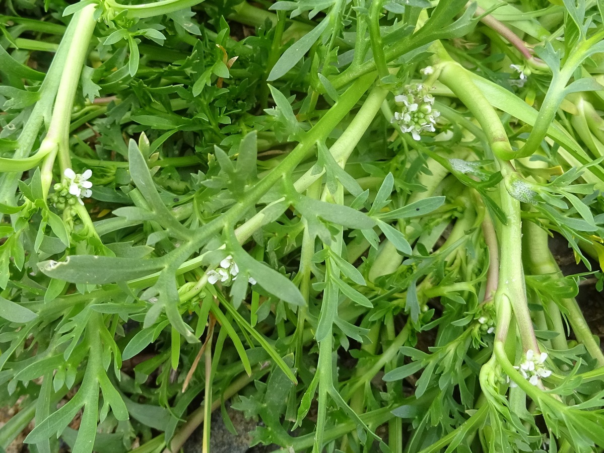 Th – 0,5-2 dm – Trapue et prostrée, feuilles pennatifides – Grappes denses axillaires de petites fleurs à 4 pétales blancs > sépales – Silicules réniformes épaisses, verruqueuses