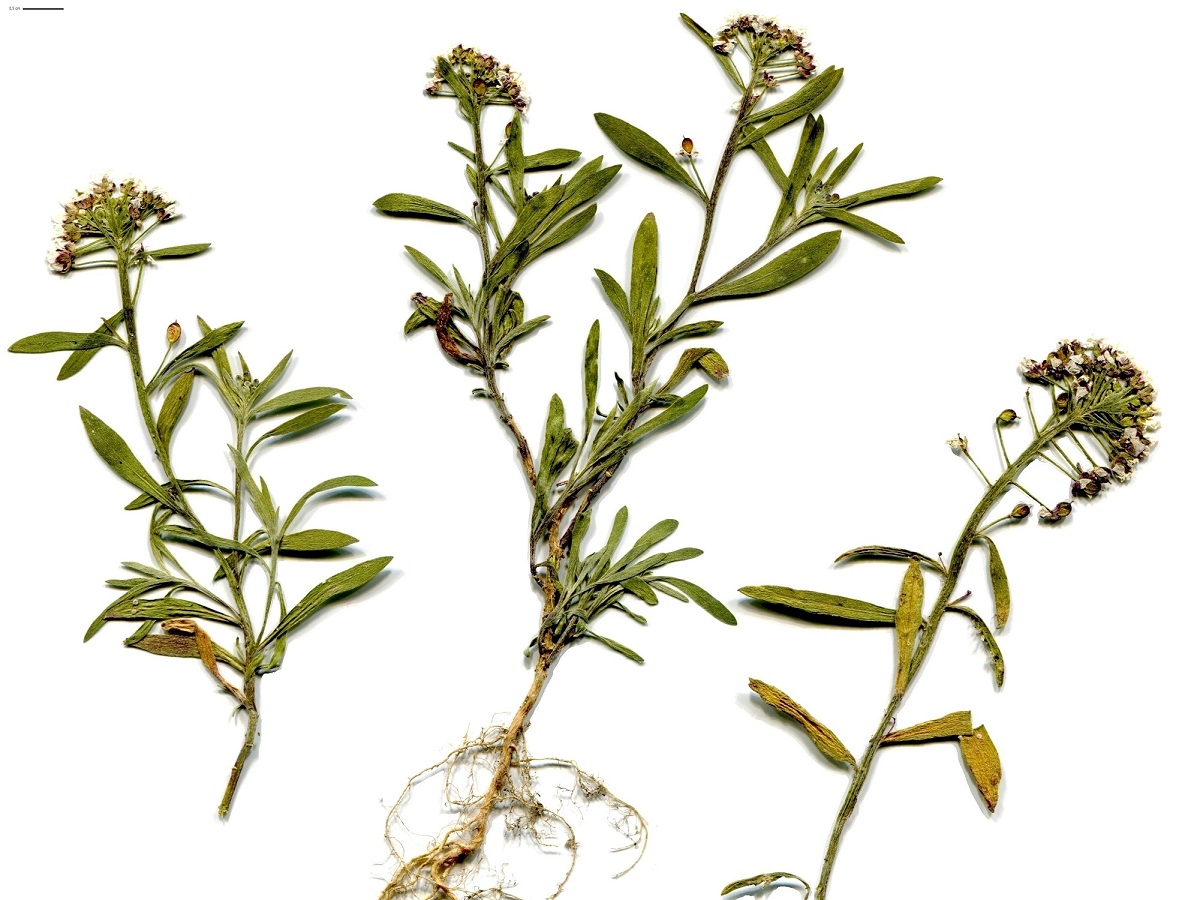 Hc/Ch – 1-3 dm – Feuilles oblongues à linéaires, grisâtres – Grappe dense en dôme de petites fleurs odorantes à 4 pétales blancs – Silicules elliptiques, velues, à fin pédicelle