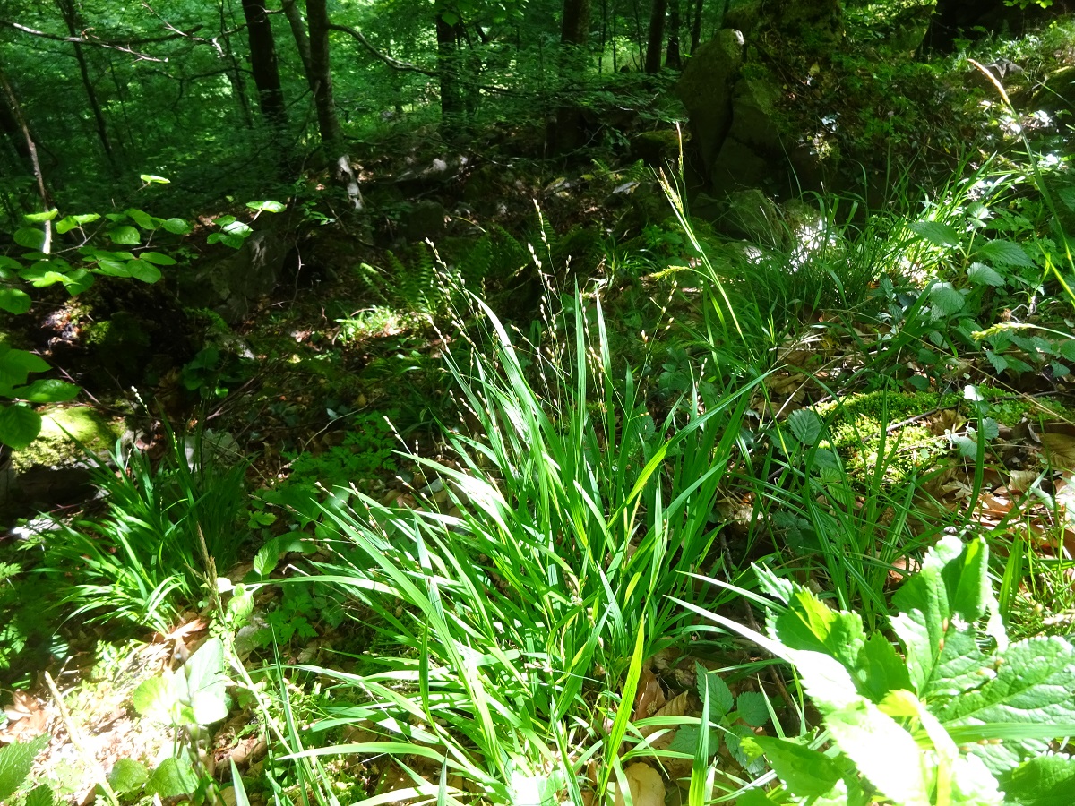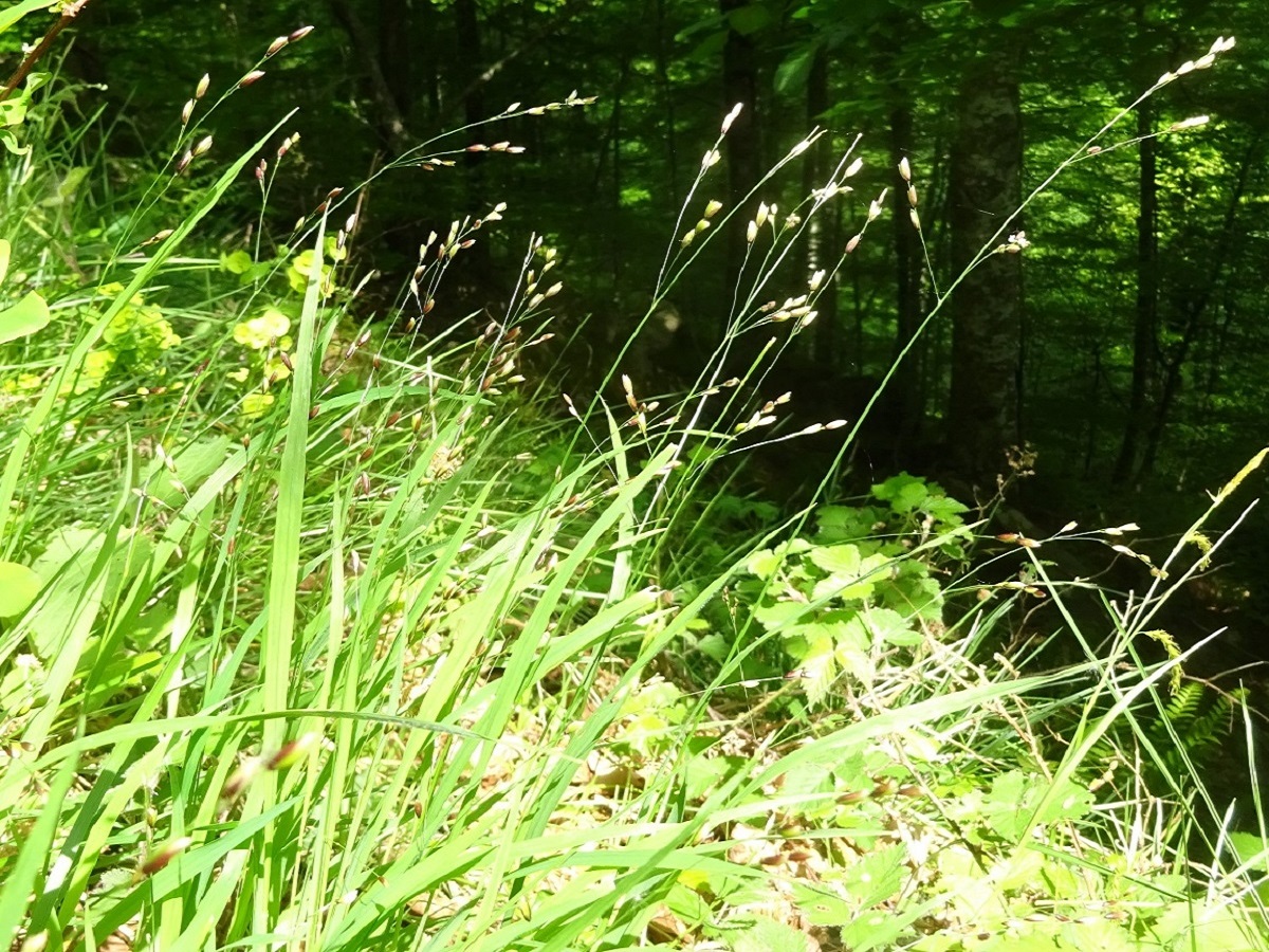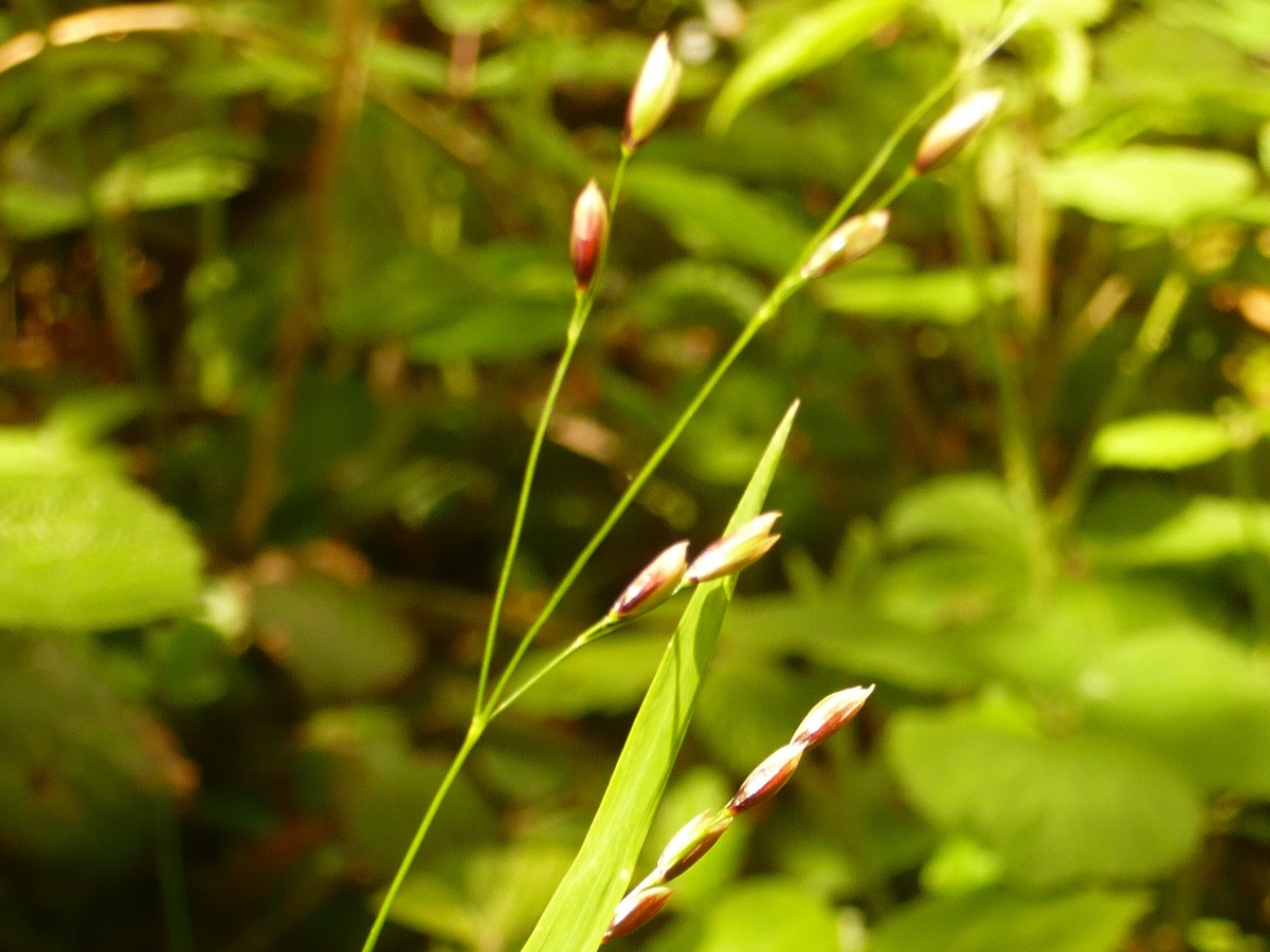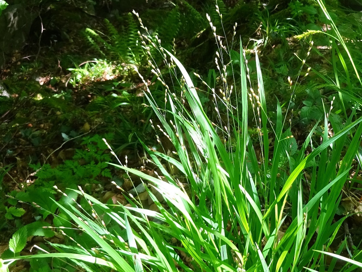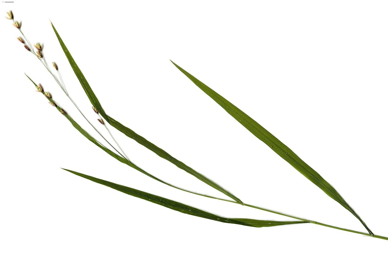 G à rhizome – 3-6 dm – Feuilles planes, aiguës – Panicule dressée ± arquée peu ramifiée, à très fins rameaux, à quelques épillets (L 5-7 mm) isolés, érigés, lavés de pourpre