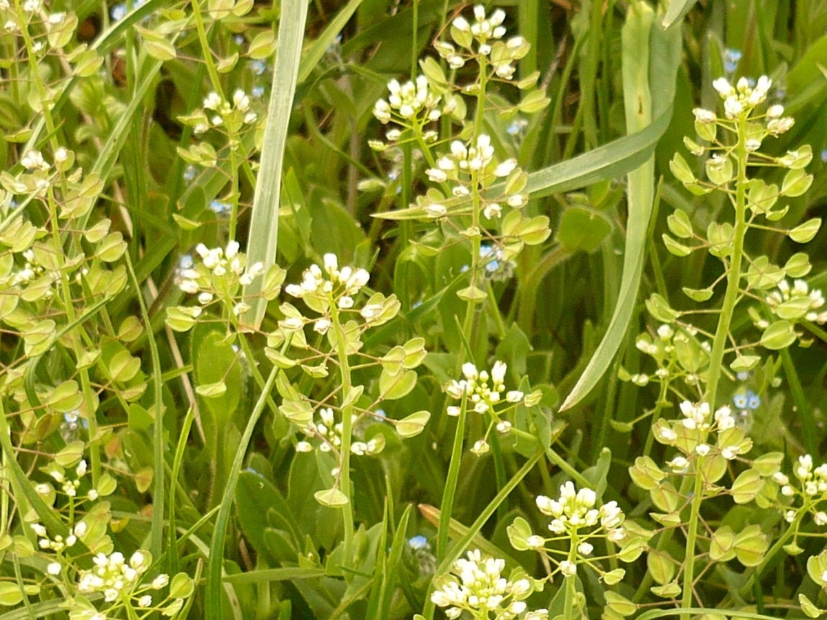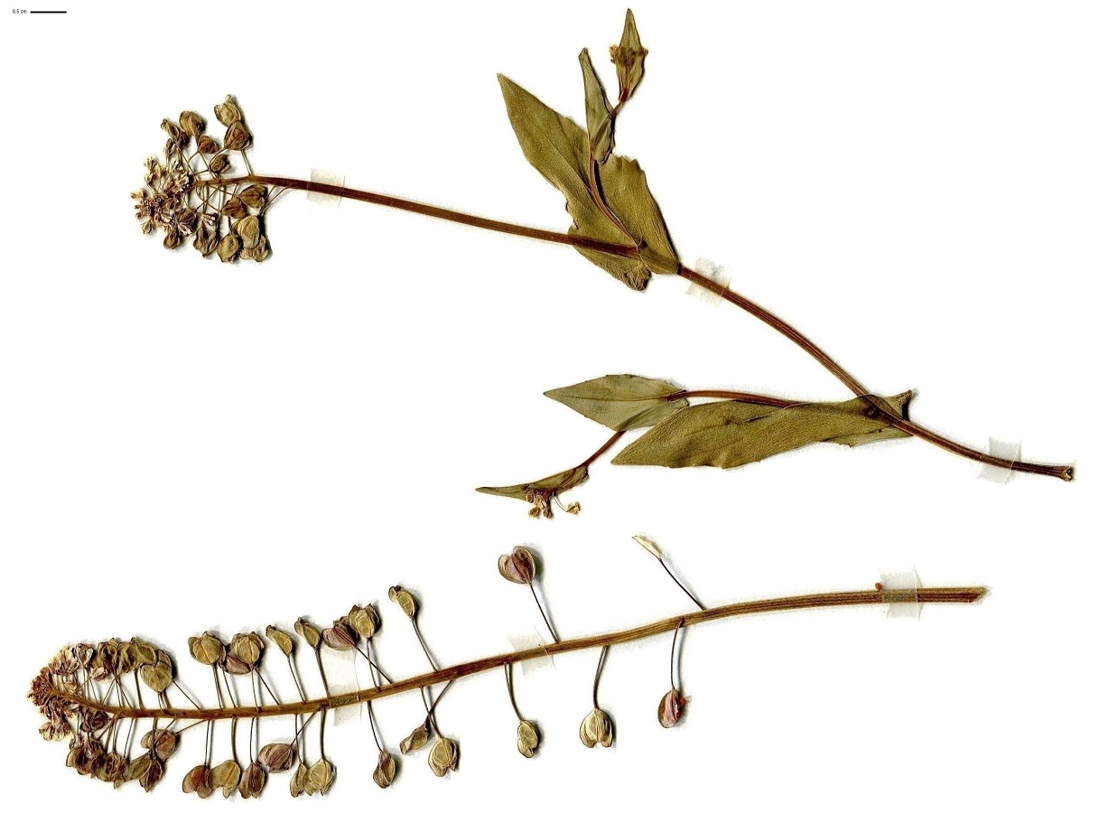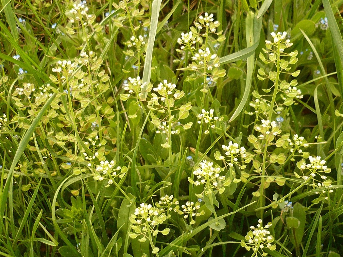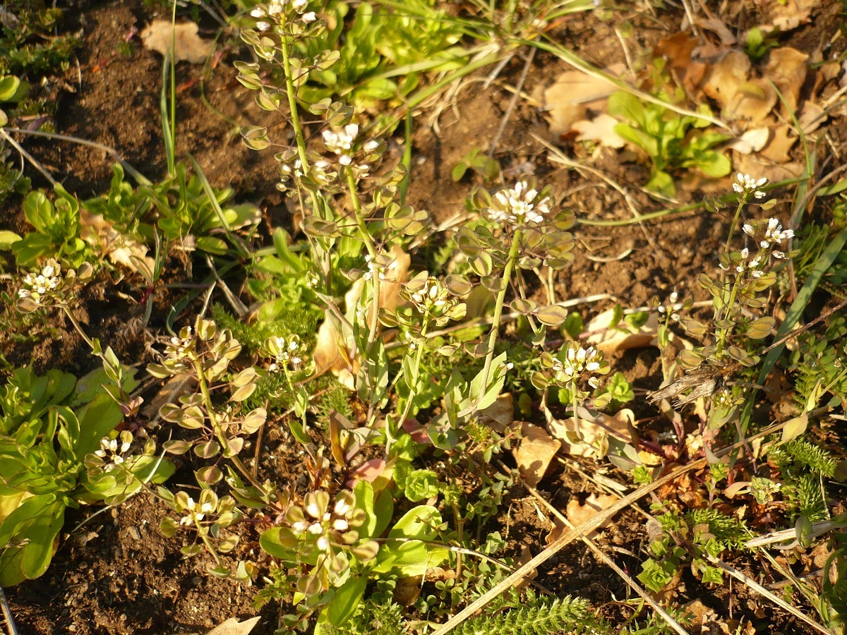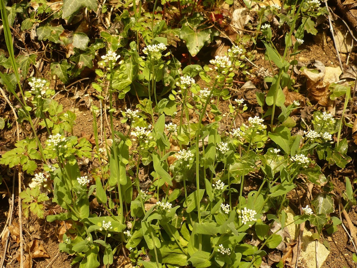 Th – 1-2 dm – Feuilles > ovales-lancéolées, amplexicaules, glauques – Grappe de petites fleurs à 4 pétales blancs – Silicules ailées, échancrées en cœur, à pédicelle étalé