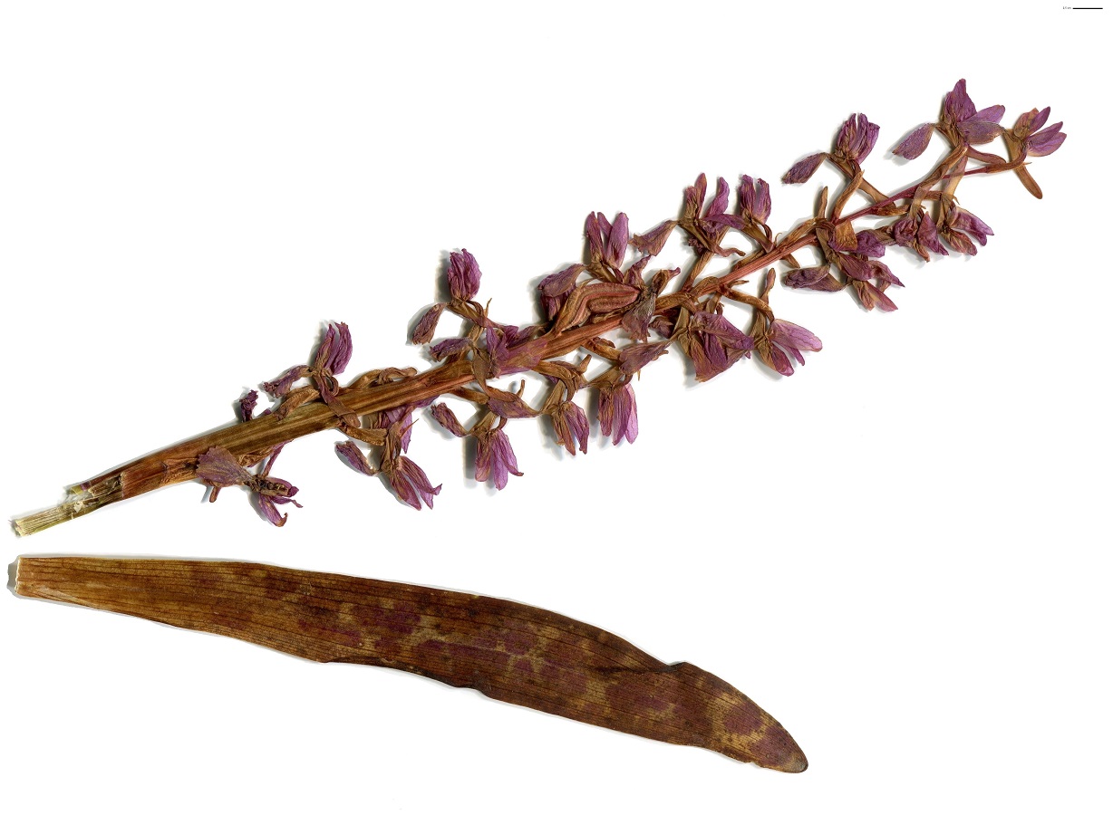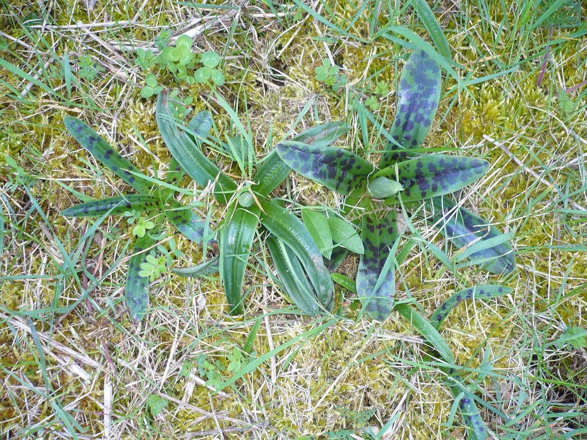 G à tubercule – 2-6 dm – Feuilles allongées-oblongues, ± maculées de noir – Fleurs pourpres, à large labelle de 8-15 mm ponctué, trilobé, tépales en casque, éperon assez long
