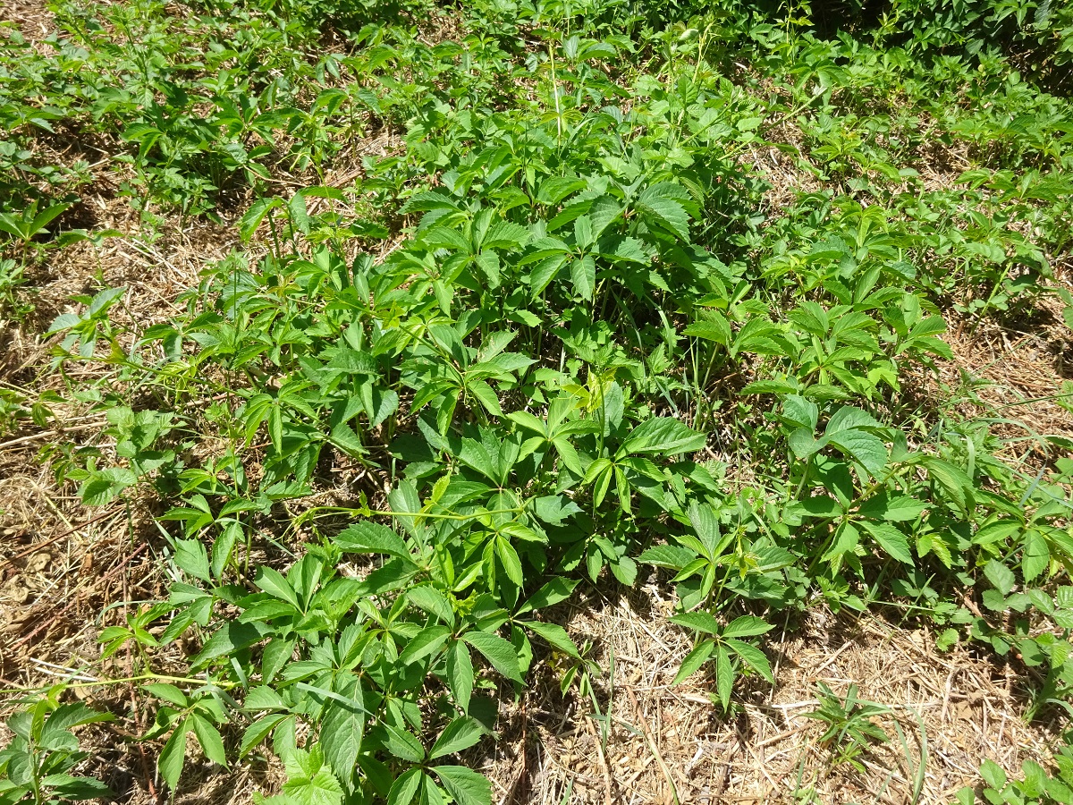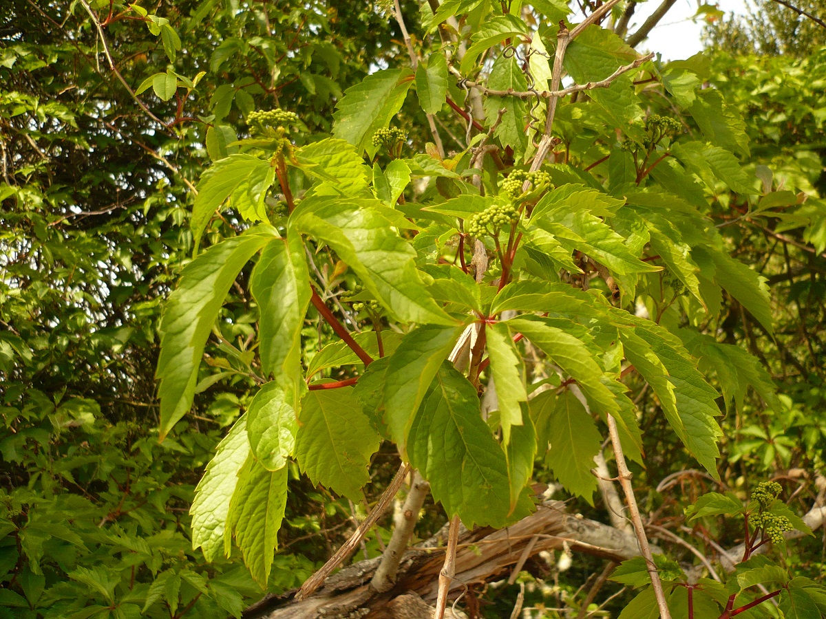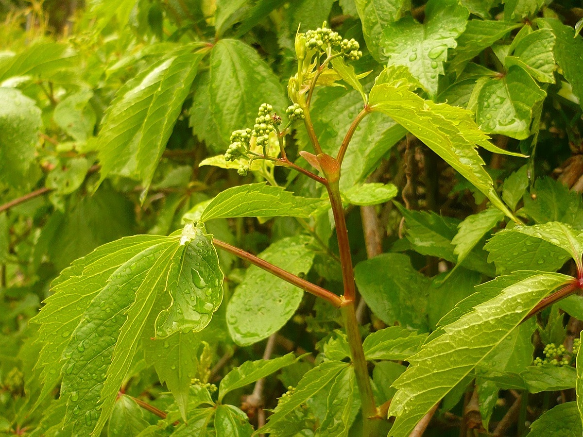 NPh/Ph L – 5-30 m – Liane, feuilles palmatiséquées, 5 folioles ovales aiguës, dentées, rougissantes, à vrilles filiformes – Grappe courte de fleurs verdâtres – Fruit petit noir violacé