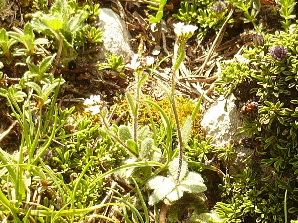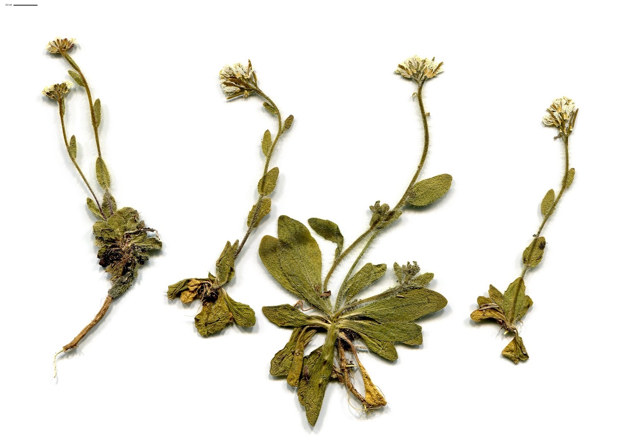 Hc – 0,5-2,5 dm – Tige simple dressée, rigide, feuilles velues-ciliées, celles en rosette spatulées, les > sessiles – Petites fleurs à 4 pétales blancs – Siliques assez courtes dressées