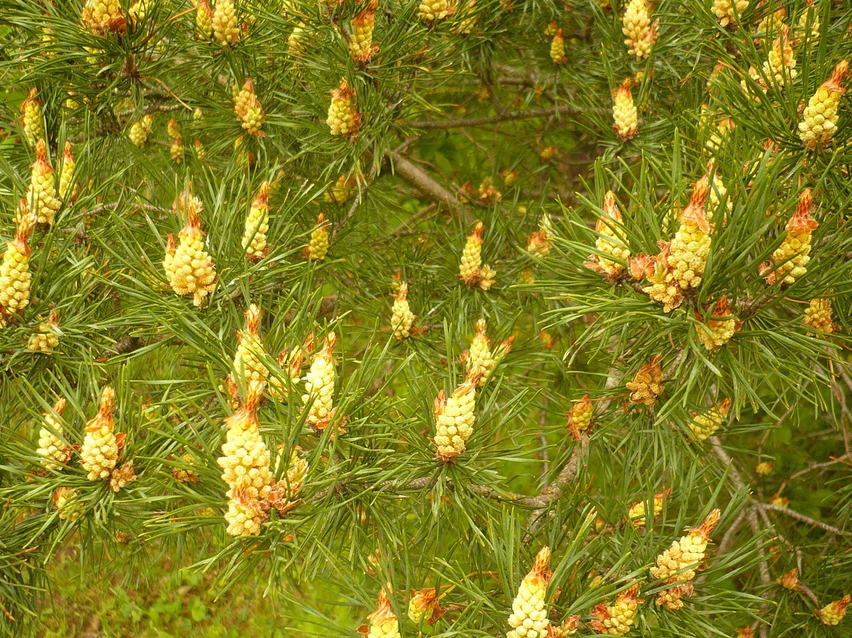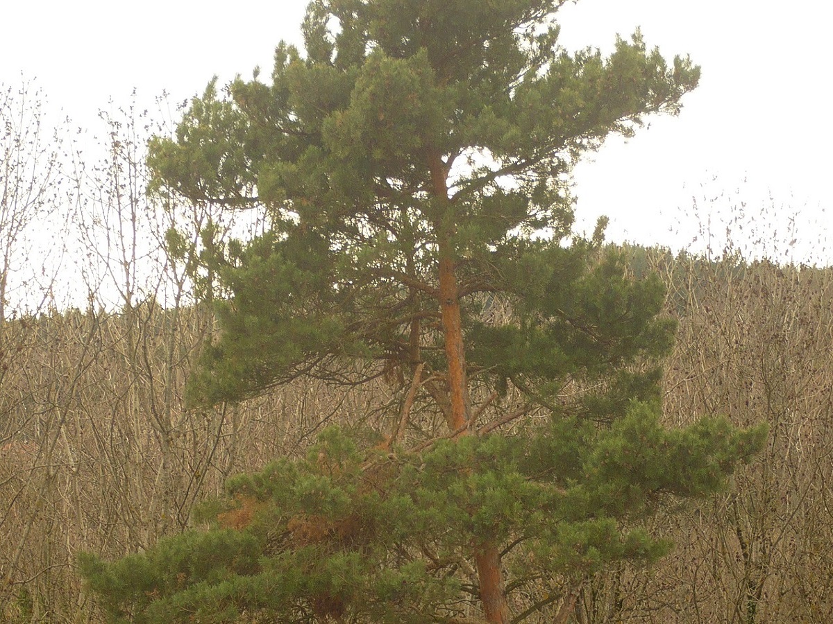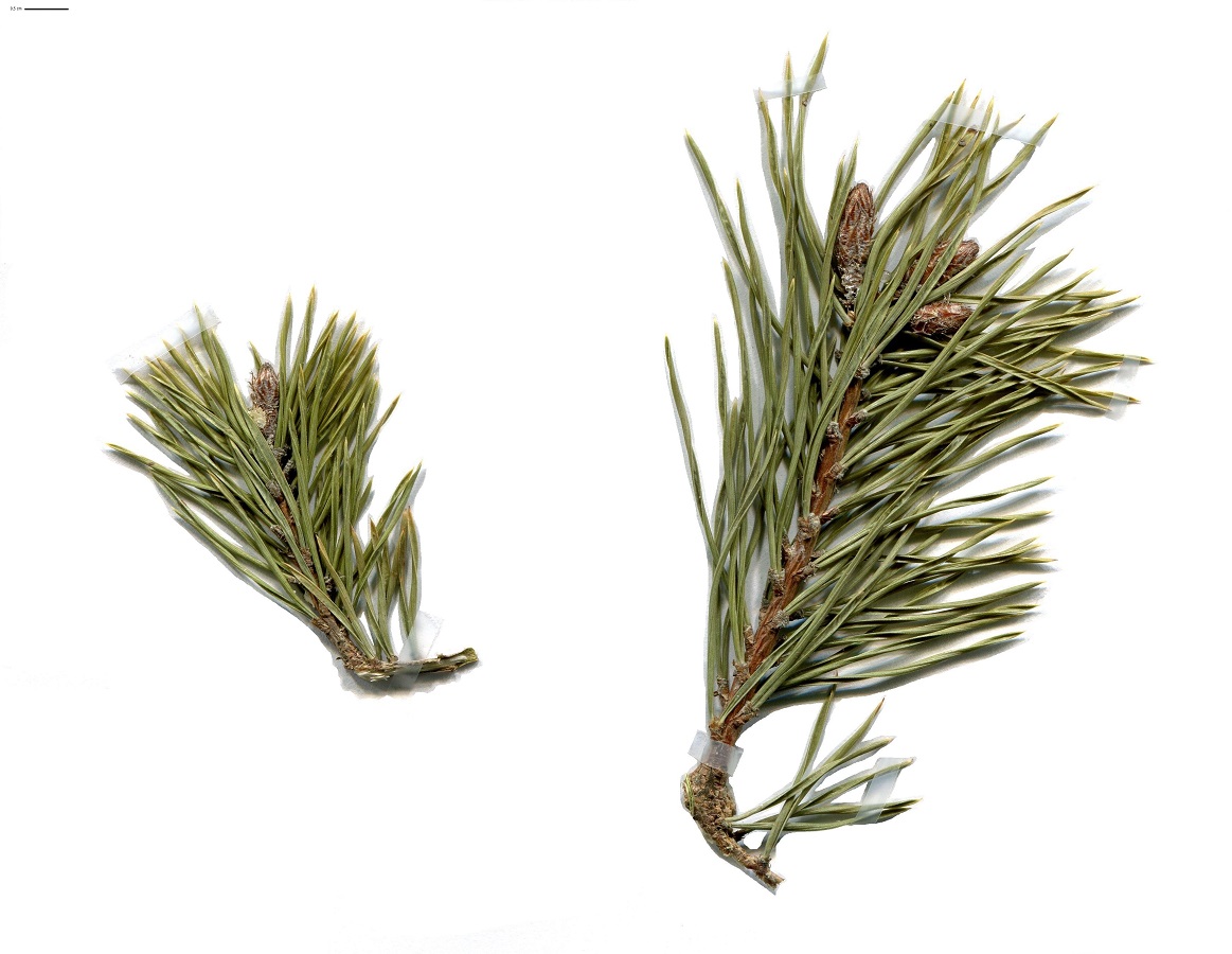 Ph – 15-30 m – Écorce fissurée brun rougeâtre, feuillage persistant à aiguilles ± courtes, rigides, fasciculées par 2 – Cônes petits, écailles à écusson central ± saillant