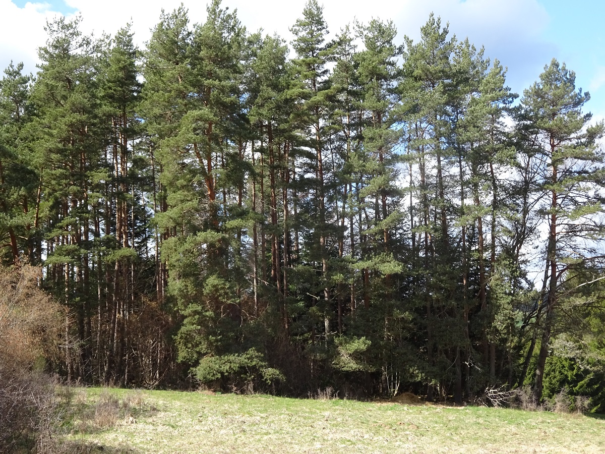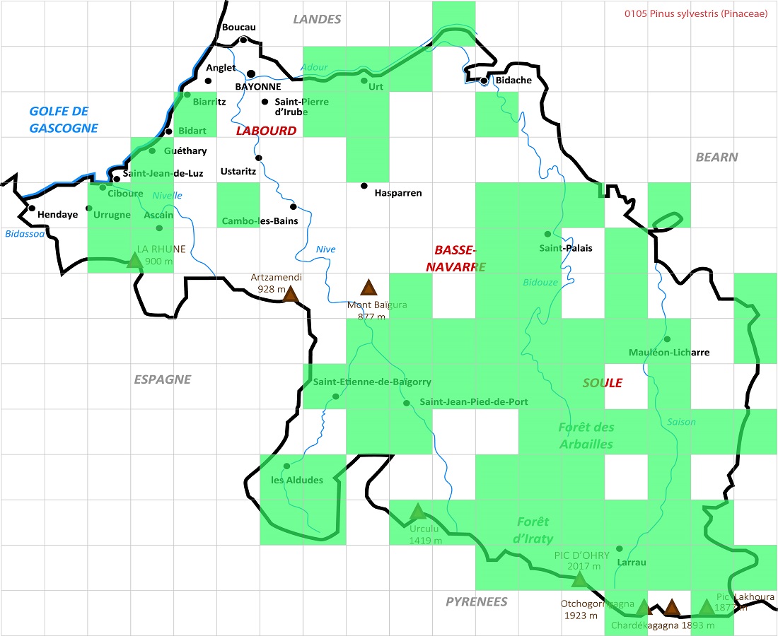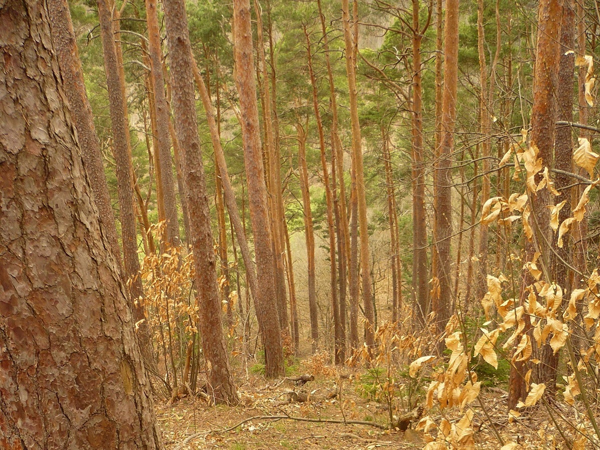 Ph – 15-30 m – Écorce fissurée brun rougeâtre, feuillage persistant à aiguilles ± courtes, rigides, fasciculées par 2 – Cônes petits, écailles à écusson central ± saillant