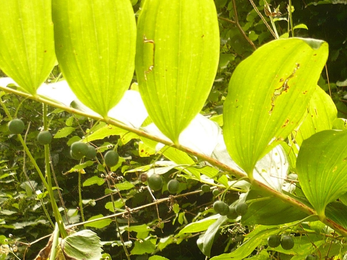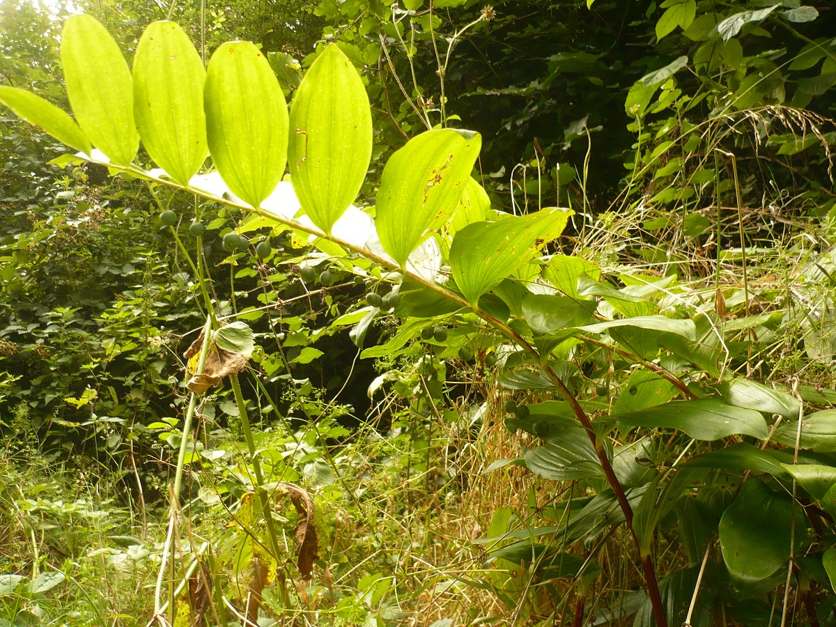 G à rhizome – 5-10 dm – Tiges ± striées arquées, feuilles larges, ovales-aiguës – Fleurs axillaires en cloche étranglée blanche pendante, groupées par 1-4 – Baie noir-bleuté