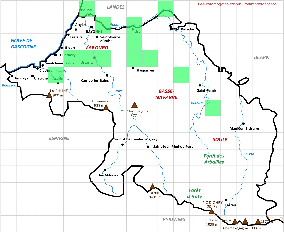 Assez rare – Printemps-Été – Hydrophyte : étangs, mares, fossés, ruisseaux – Dispersé, surtout à basse altitude, au Pays Basque