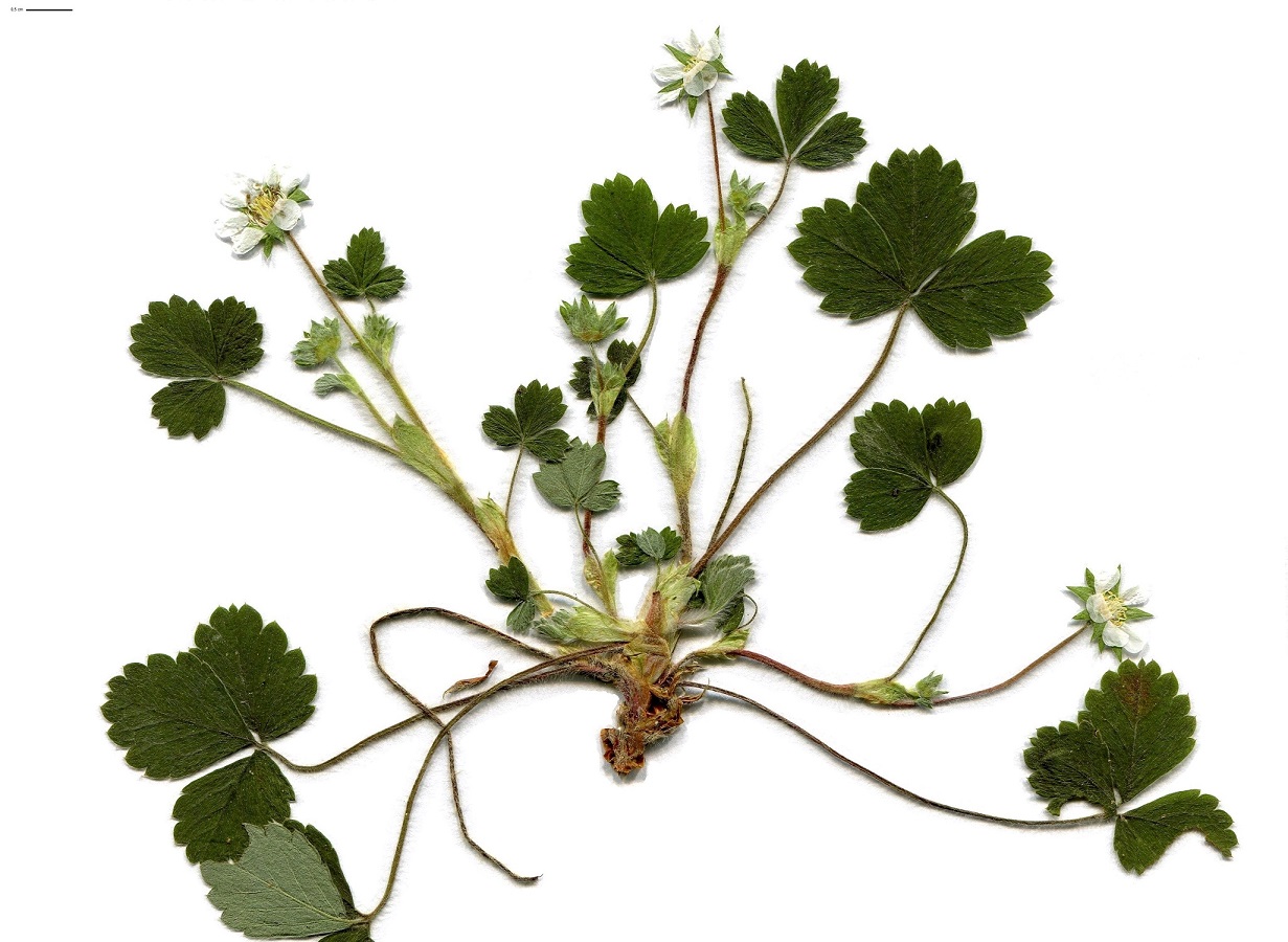Hc – 0,5-1,5 dm – Stolonifère, feuilles à 3 folioles ovales à dents larges, mucronées – Fleurs blanches de Ø ≃ 1 cm, à pétales ± écartés, sépales verts – Akènes velus