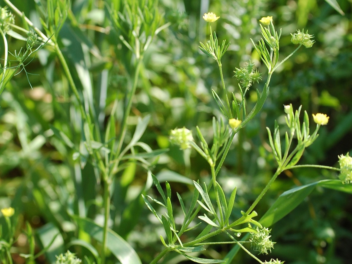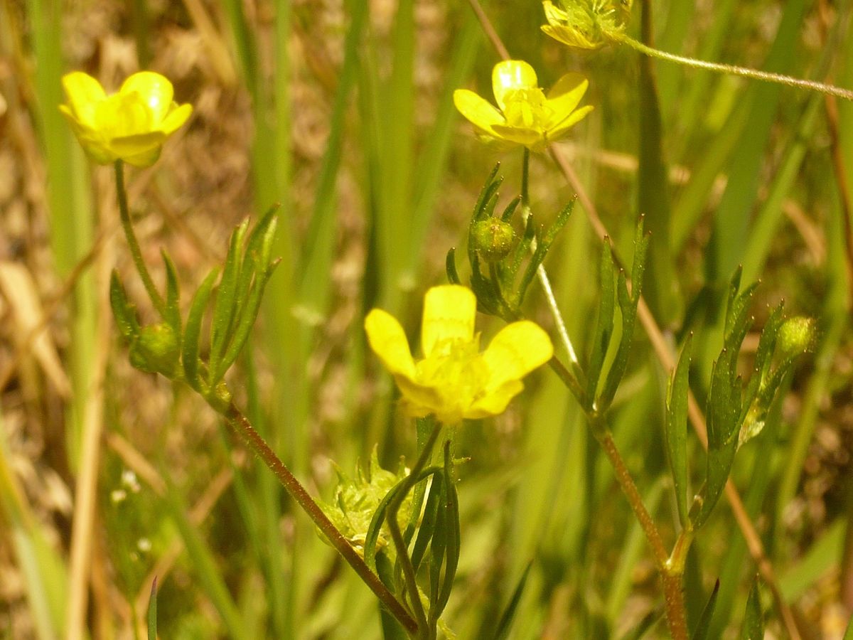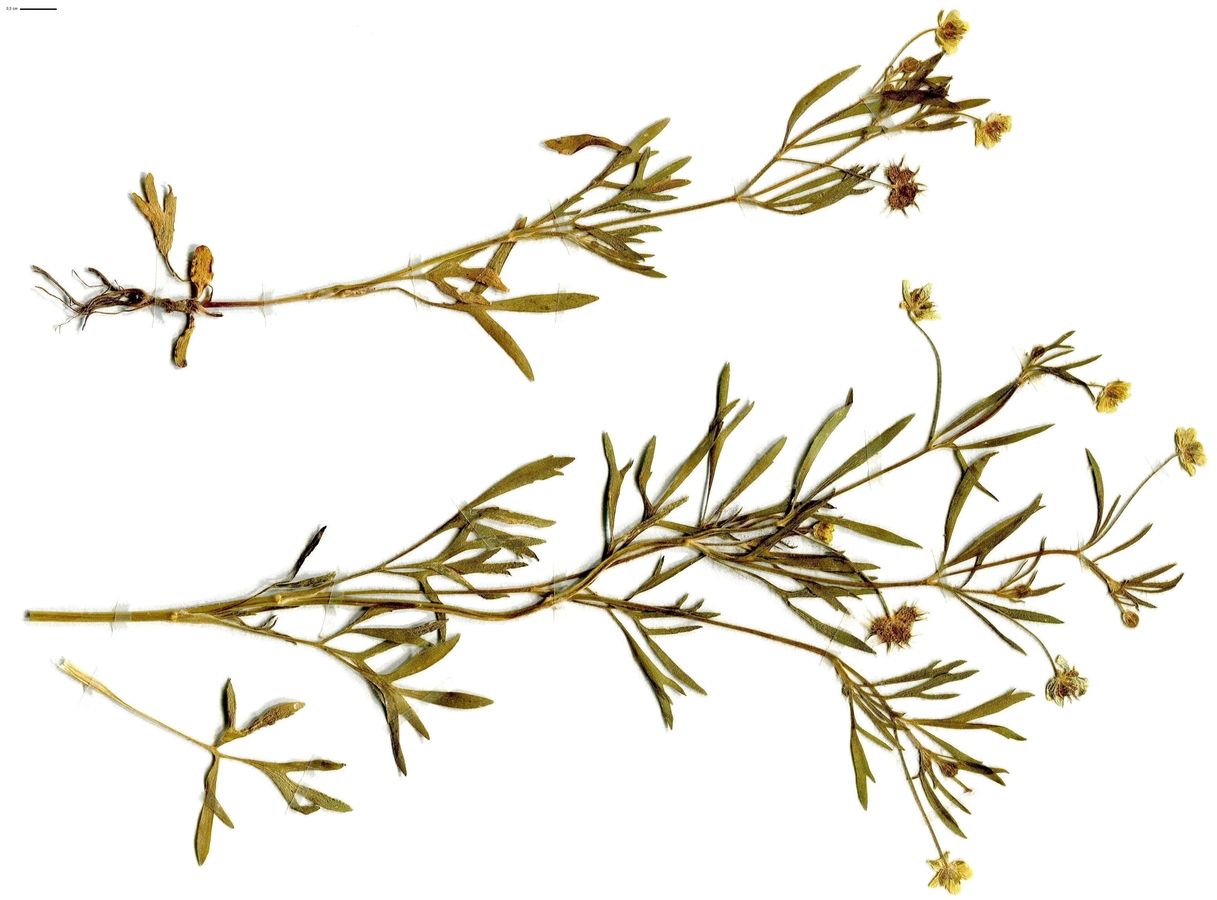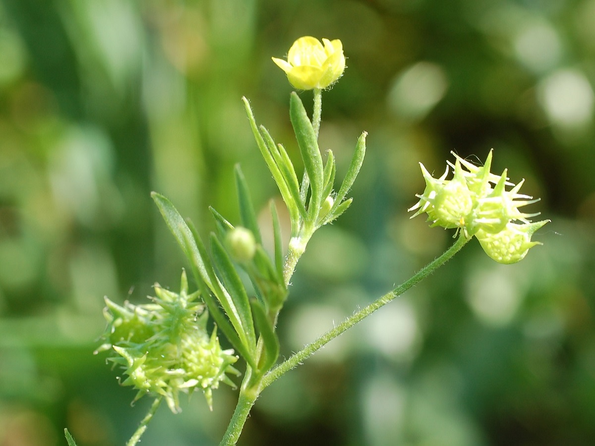 Th – 2-5 dm – Port gracile, feuilles vert clair, triséquées à lobes linéaires – Petites fleurs à 5 pétales jaune soufre, à sépales étalés – Grands akènes épineux