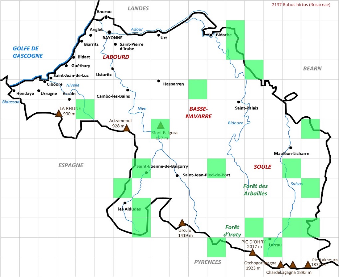 PsPh – 5-10 dm – Tiges grêles, glandes et fins acicules pourpres, feuilles à 3(-5) folioles ovales, la terminale cordée, stipules étroites – Fleurs blanches – Drupéoles noires