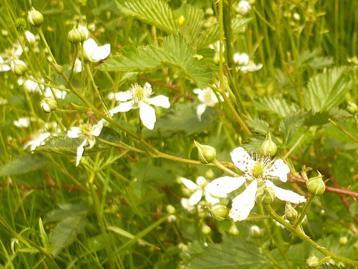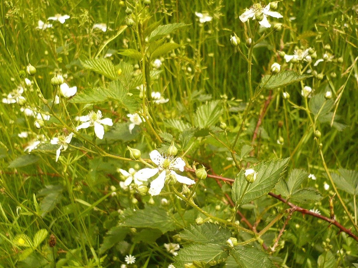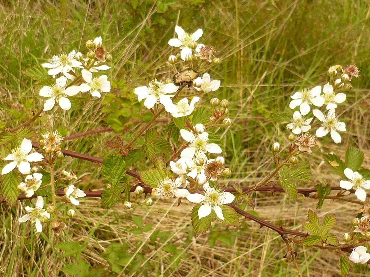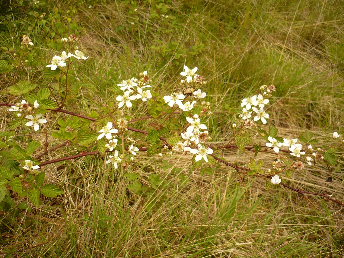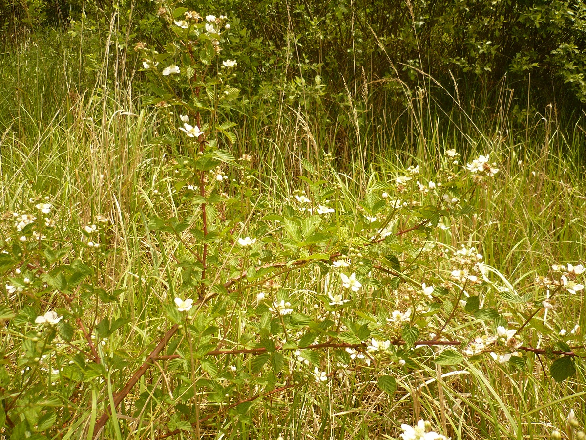 PsPh – 10-25 dm – Tiges élevées ± arquées, sillonnées, à aiguillons courbes rares, feuilles vertes à 5 folioles ovales dentées ± sessiles – Fleurs blanches – Drupéoles noires