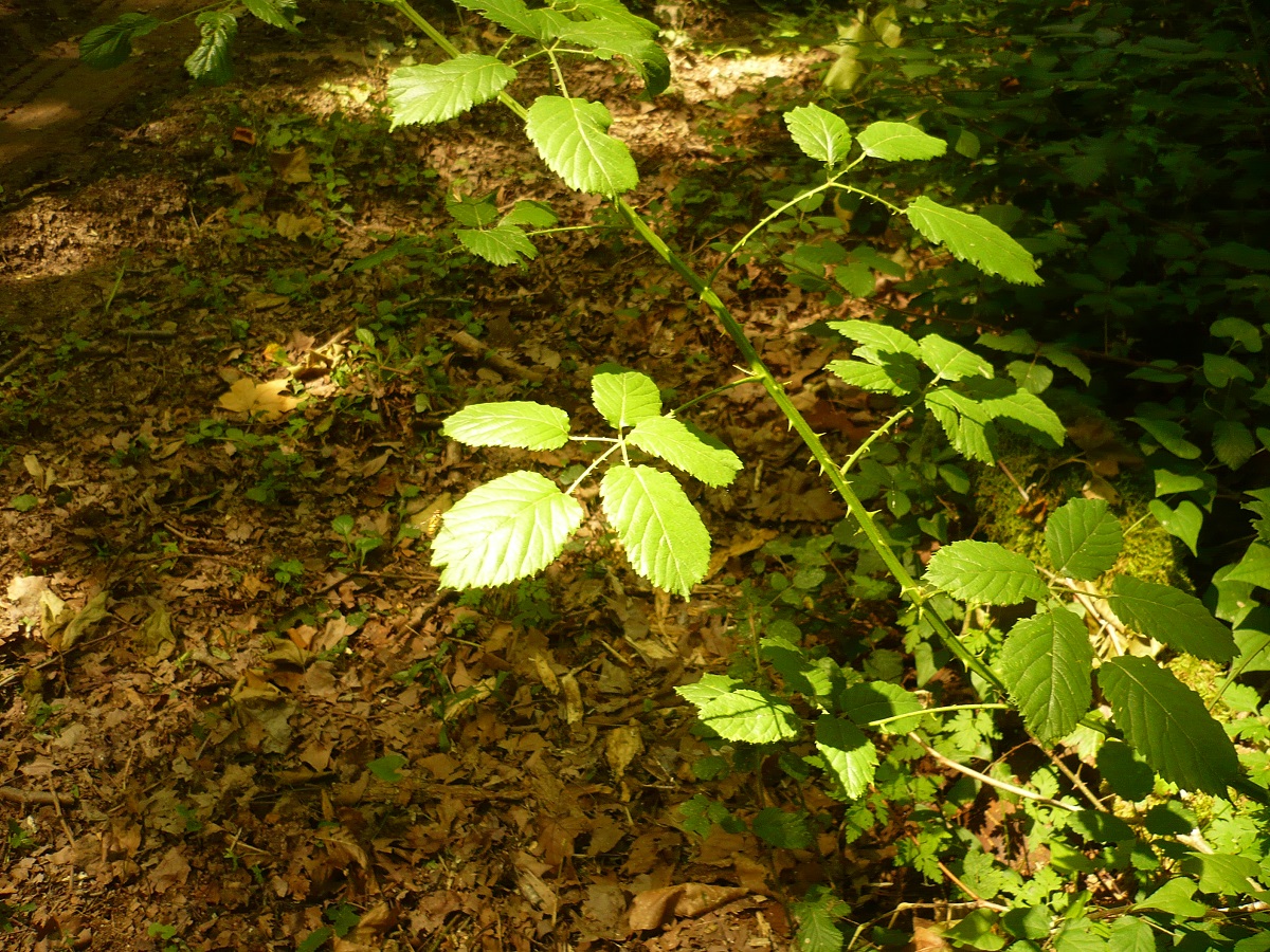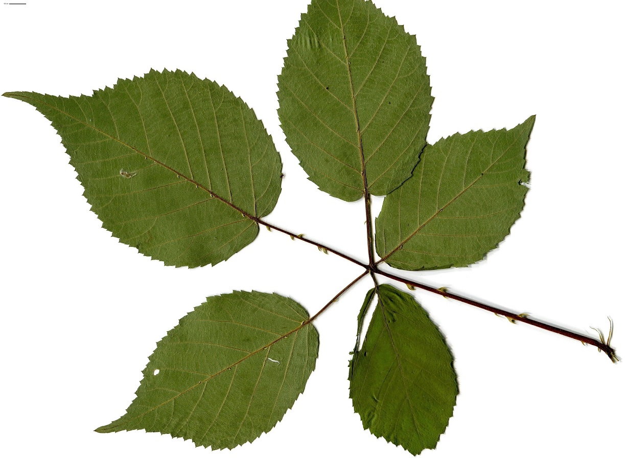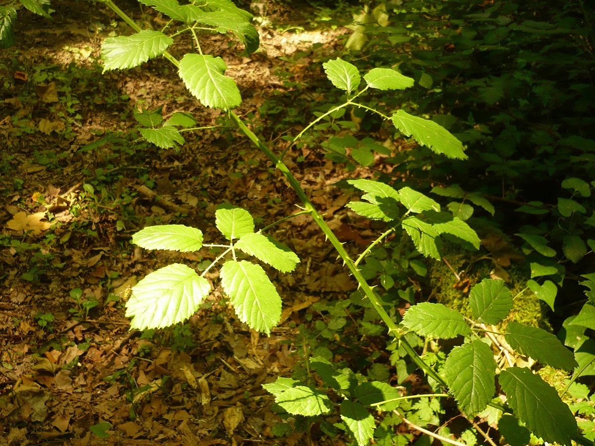 PsPh – 10-30 dm – Tiges glabres à aiguillons arqués, feuilles vertes sur les 2 faces à 5 folioles pétiolulées, ovales dentées, acuminées – Fleurs rosées – Drupéoles noires