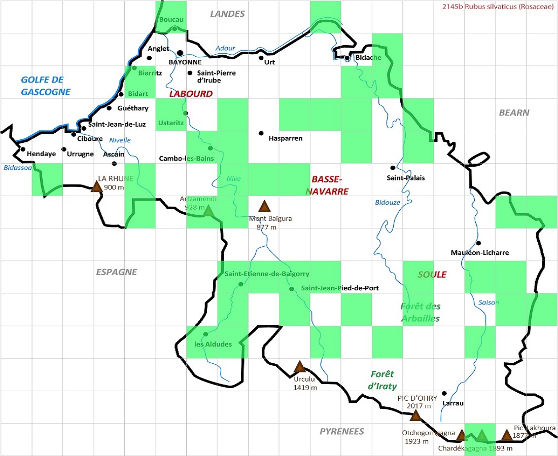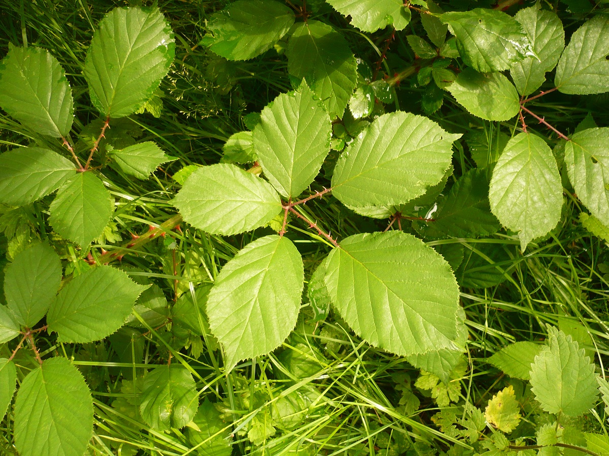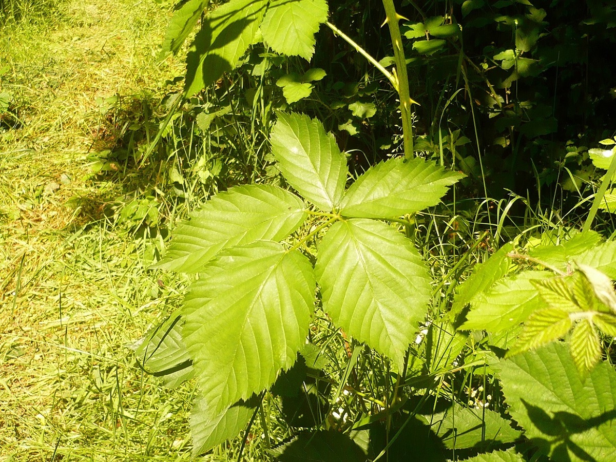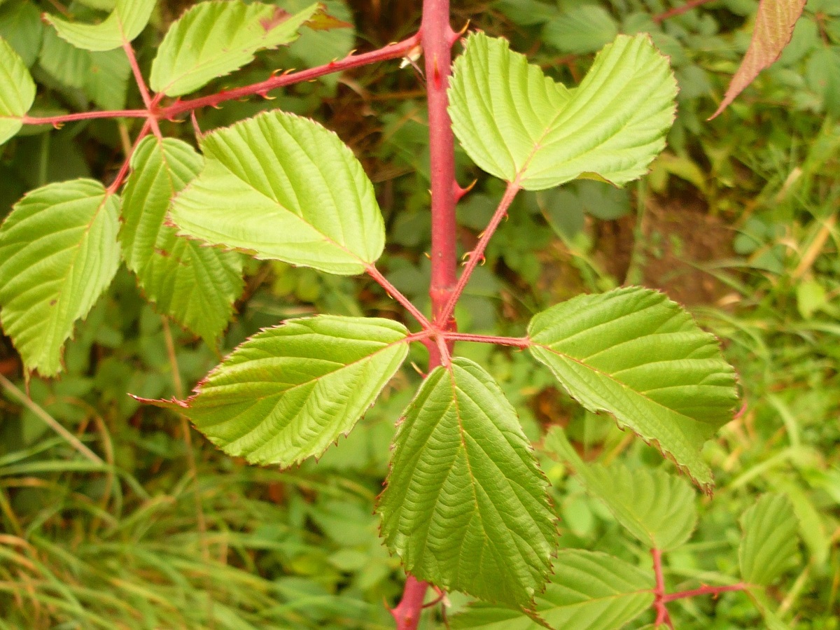 PsPh – 10-30 dm – Tiges glabres à aiguillons arqués, feuilles vertes sur les 2 faces à 5 folioles pétiolulées, ovales dentées, acuminées – Fleurs rosées – Drupéoles noires