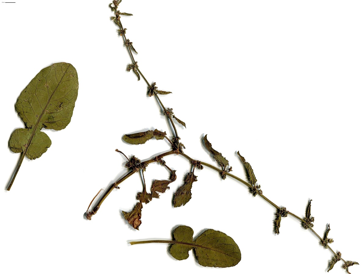 Hc – 3-6 dm – Tiges raides en zig-zag, feuilles basales en forme de violon – Inflorescence lâche, feuillée – Valves triangulaires dentées, à gros granule rugueux ou verruqueux