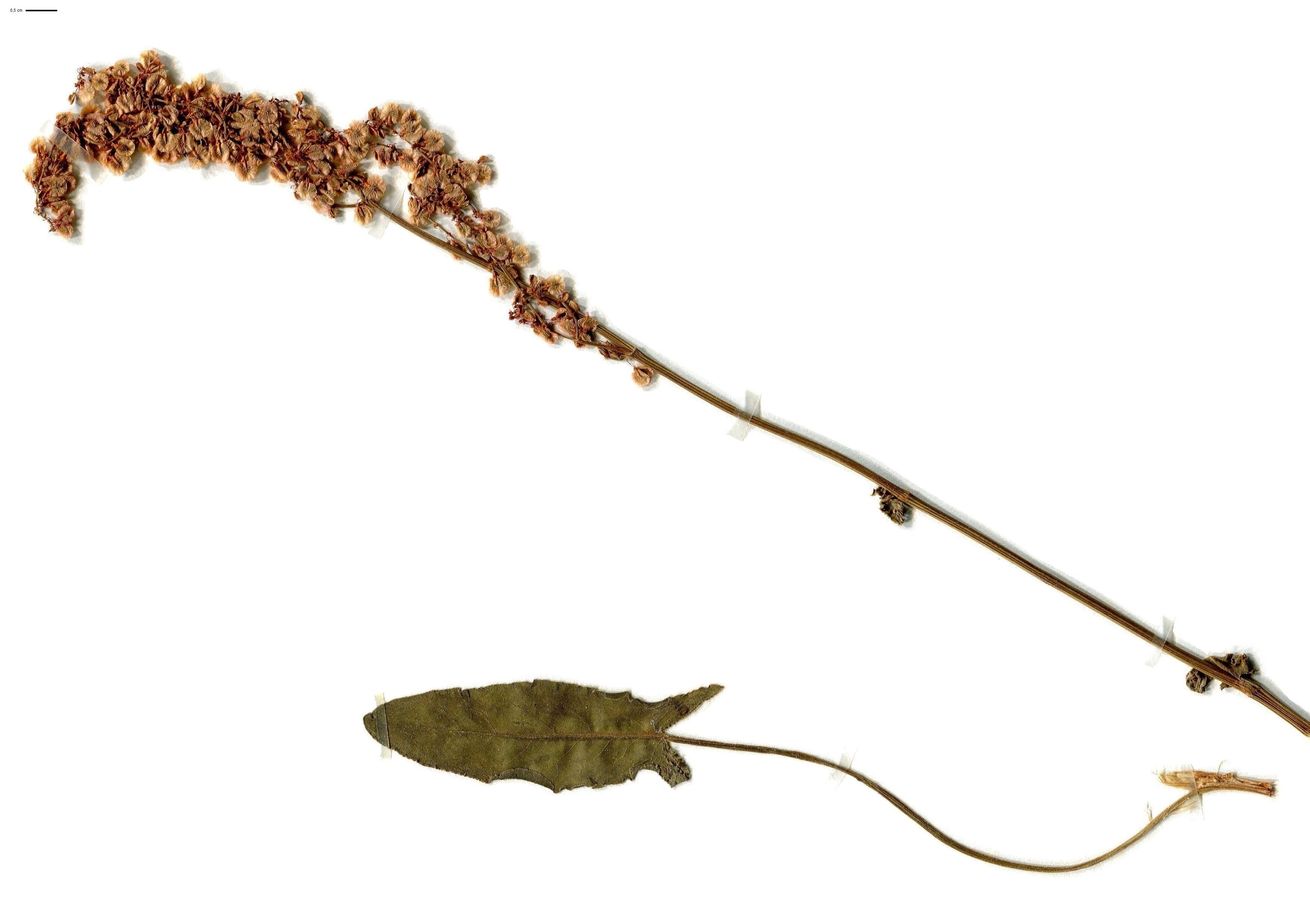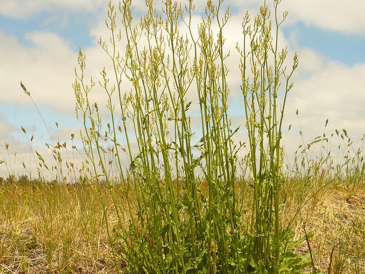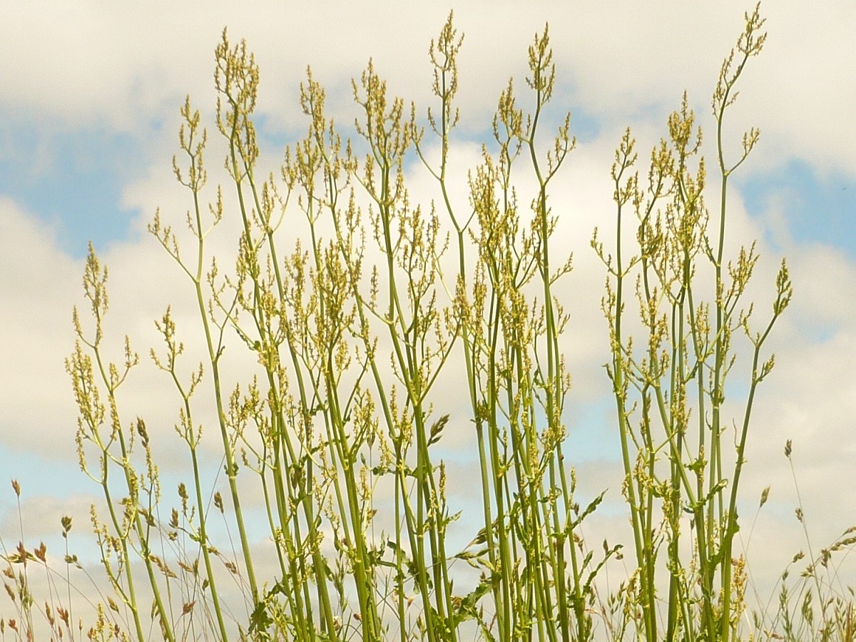 Hc – 5-10 dm – Feuilles basales sagittées, ± allongées et crispées, à long pétiole – Panicule très ramifiée de fleurs jaunâtres à rougeâtres – Valves à fine écaille basale