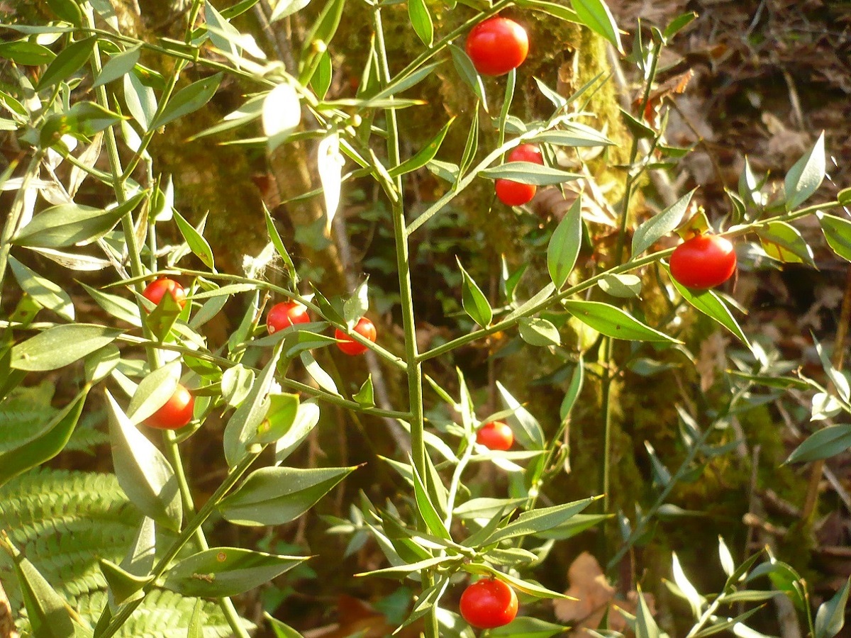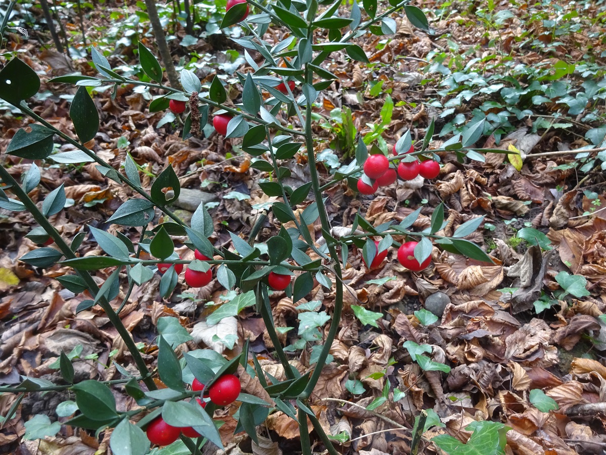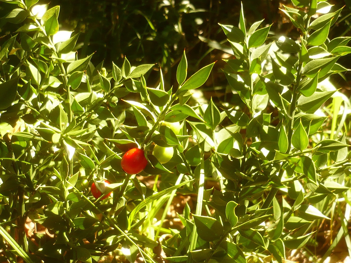 G à rhizome/Ch – 3-8 dm – Cladodes coriaces persistants, ovales-aigus à apex très piquant – Fleurs petites de type 3, blanc-verdâtre, 1 par cladode – Baie rouge globuleuse