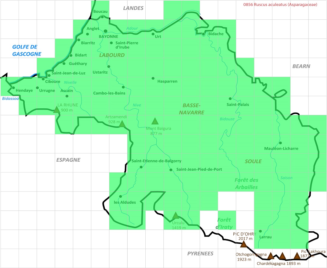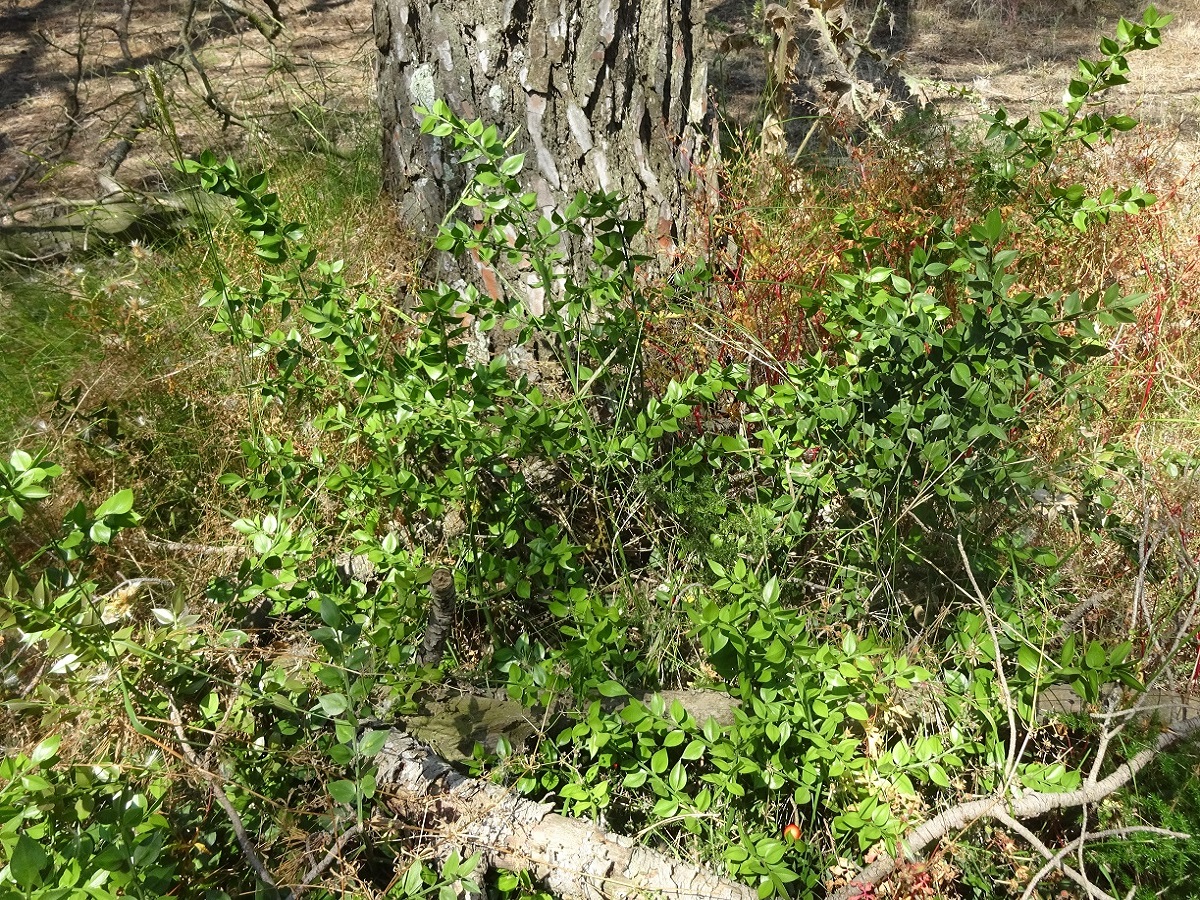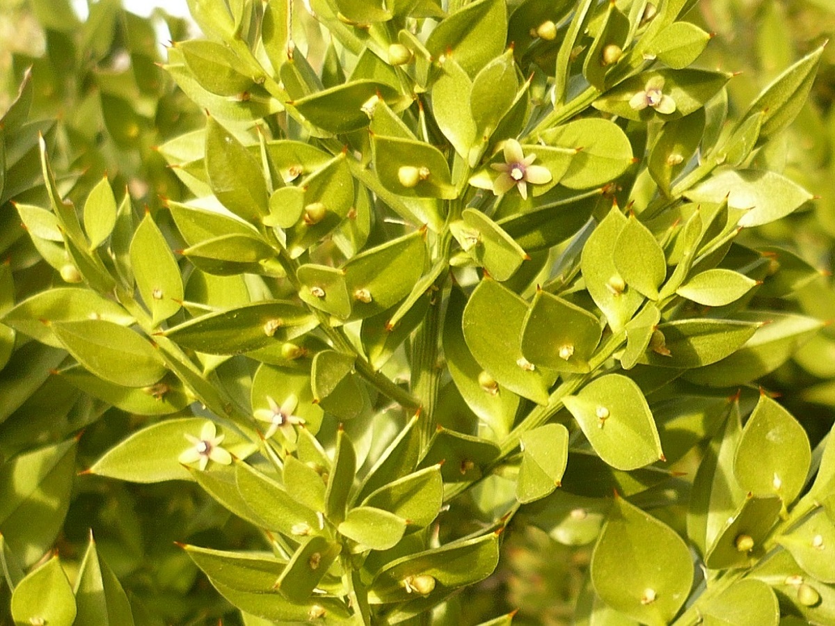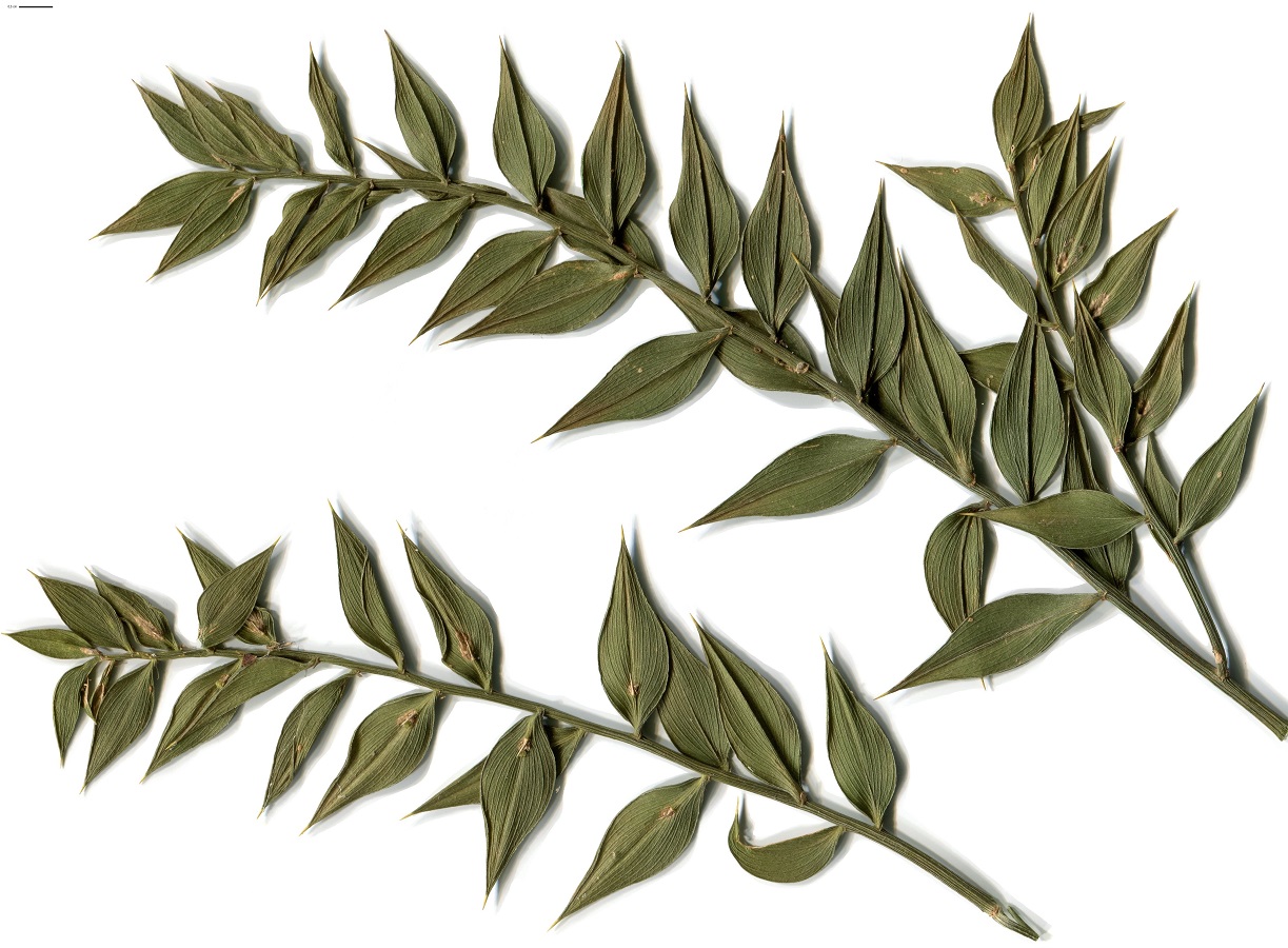 G à rhizome/Ch – 3-8 dm – Cladodes coriaces persistants, ovales-aigus à apex très piquant – Fleurs petites de type 3, blanc-verdâtre, 1 par cladode – Baie rouge globuleuse