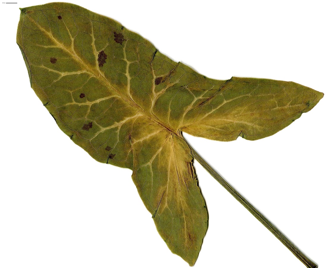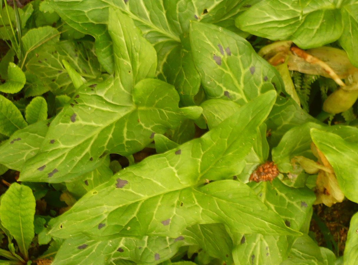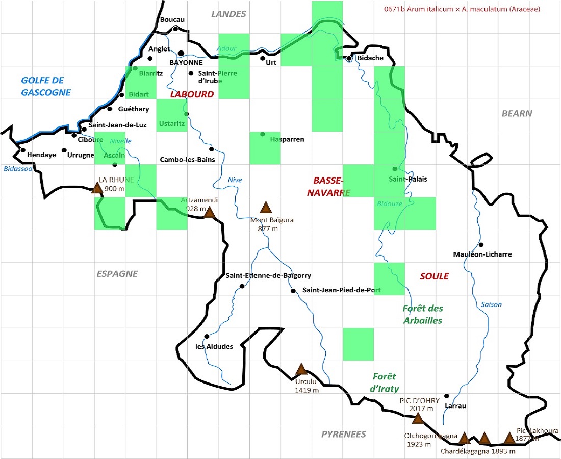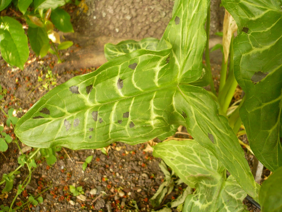 G à tubercule – 3-6 dm – Feuilles hastées, veinées de blanc et maculées de noir – Spathe vert-jaunâtre, spadice panaché – Baies rouges ± conformes, épi dense (si présents)