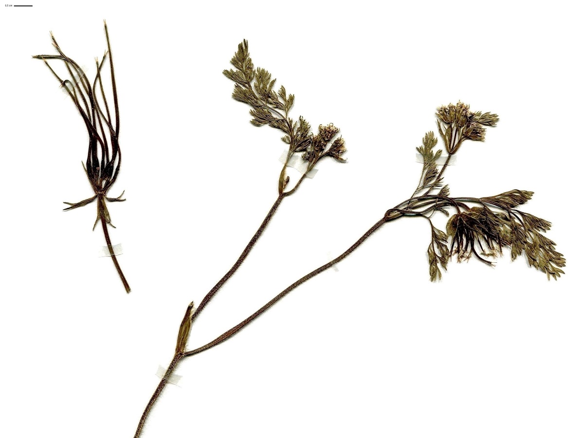 Th – 2-5 dm – Feuilles 2- à 3-pennées à lobes linéaires – Ombelles à 1-3 rayons, 4-9 fleurs blanches, pétales externes grands, bractéoles fines – Fruit à long bec de 4-8 cm aplati