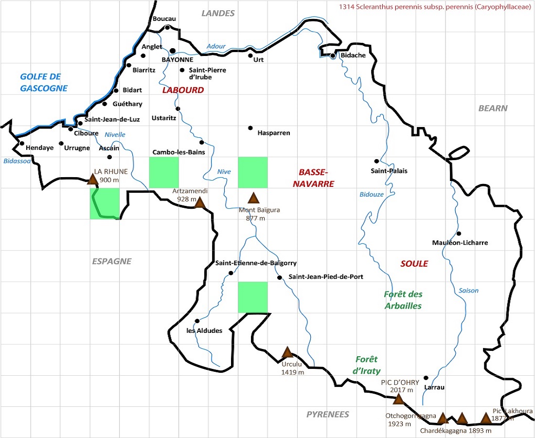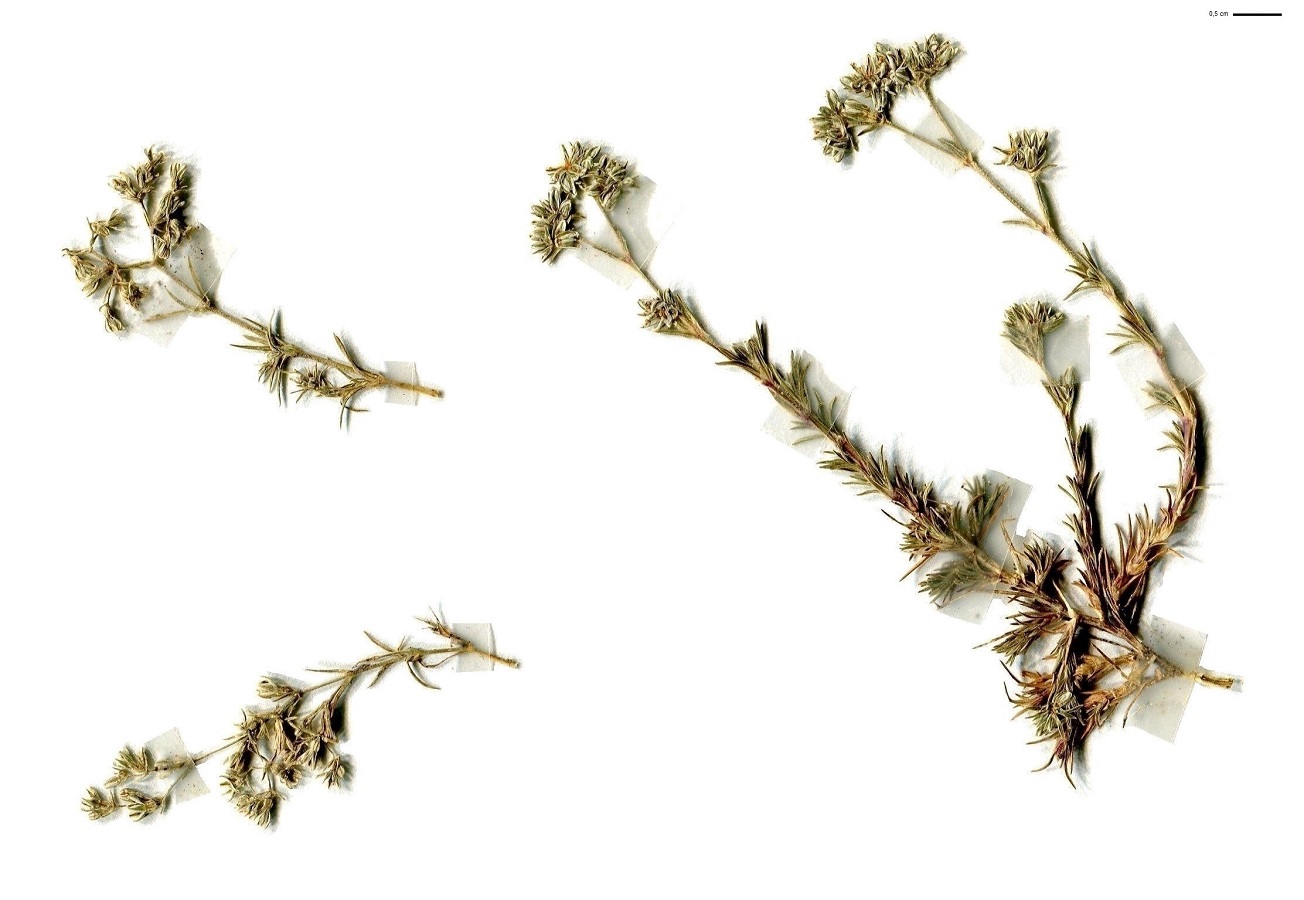 Hc – 0,5-2 dm – Port prostré, feuilles opposées en alêne – Fleurs sans pétales en glomérules terminaux pédonculés lâches, à sépales verts obtus, à bord scarieux large