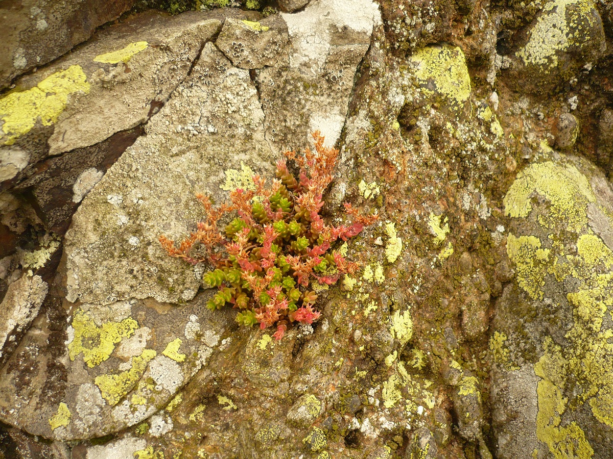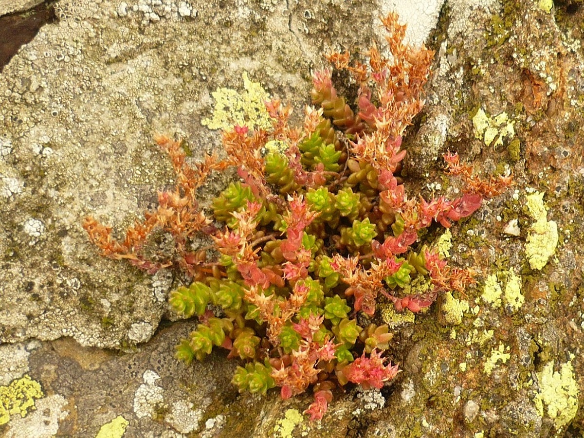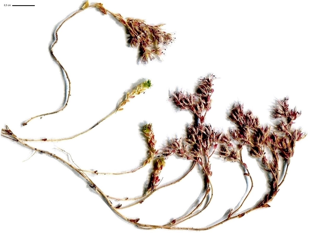 Ch – 0,5-1,5 dm – Petites feuilles ± rougeâtres charnues ovoïdes à éperon basal – Courte panicule de petites fleurs à 5 pétales aigus ± rosés – Carpelles étalés-dressés acuminés
