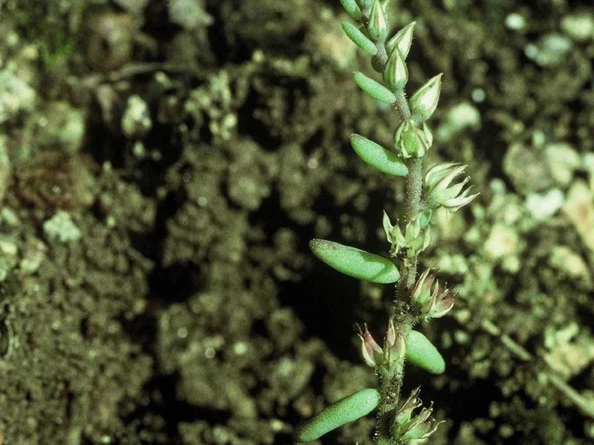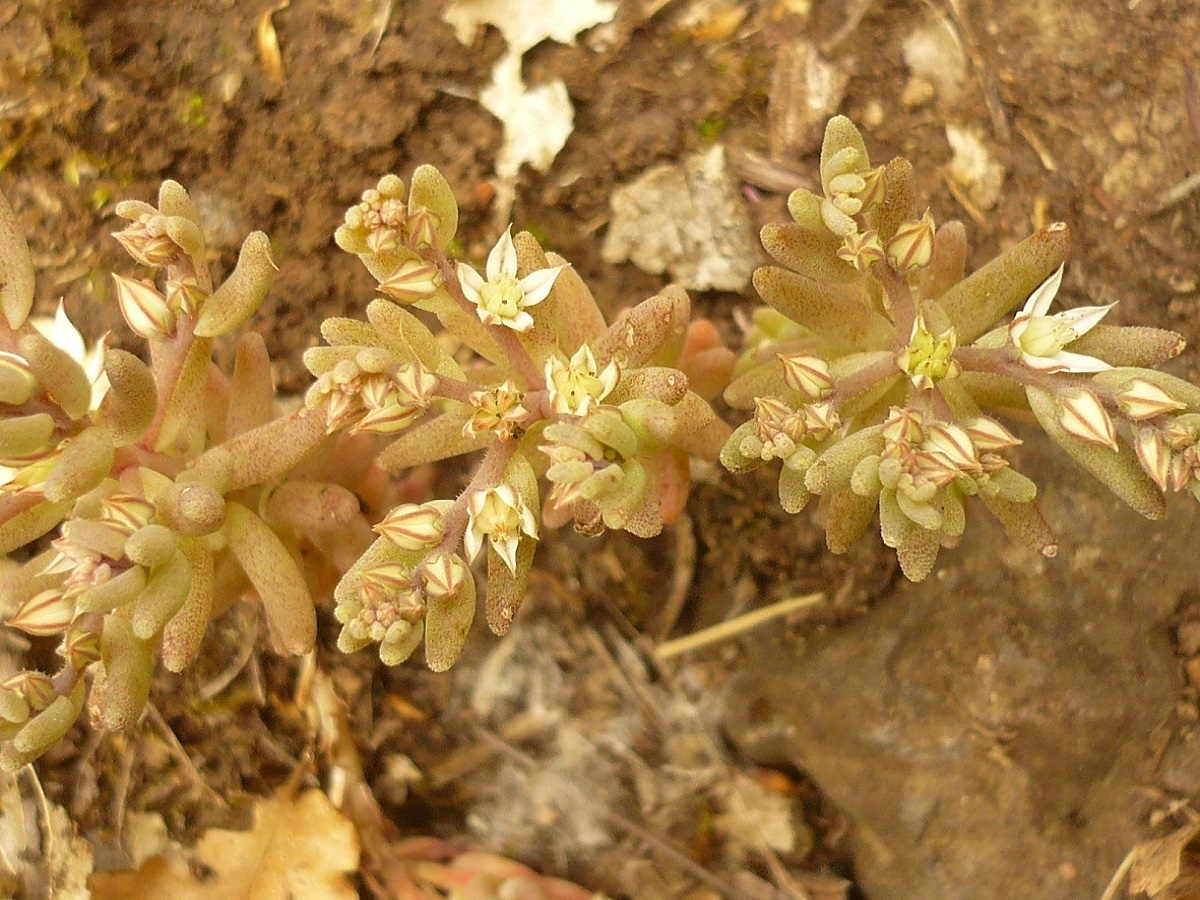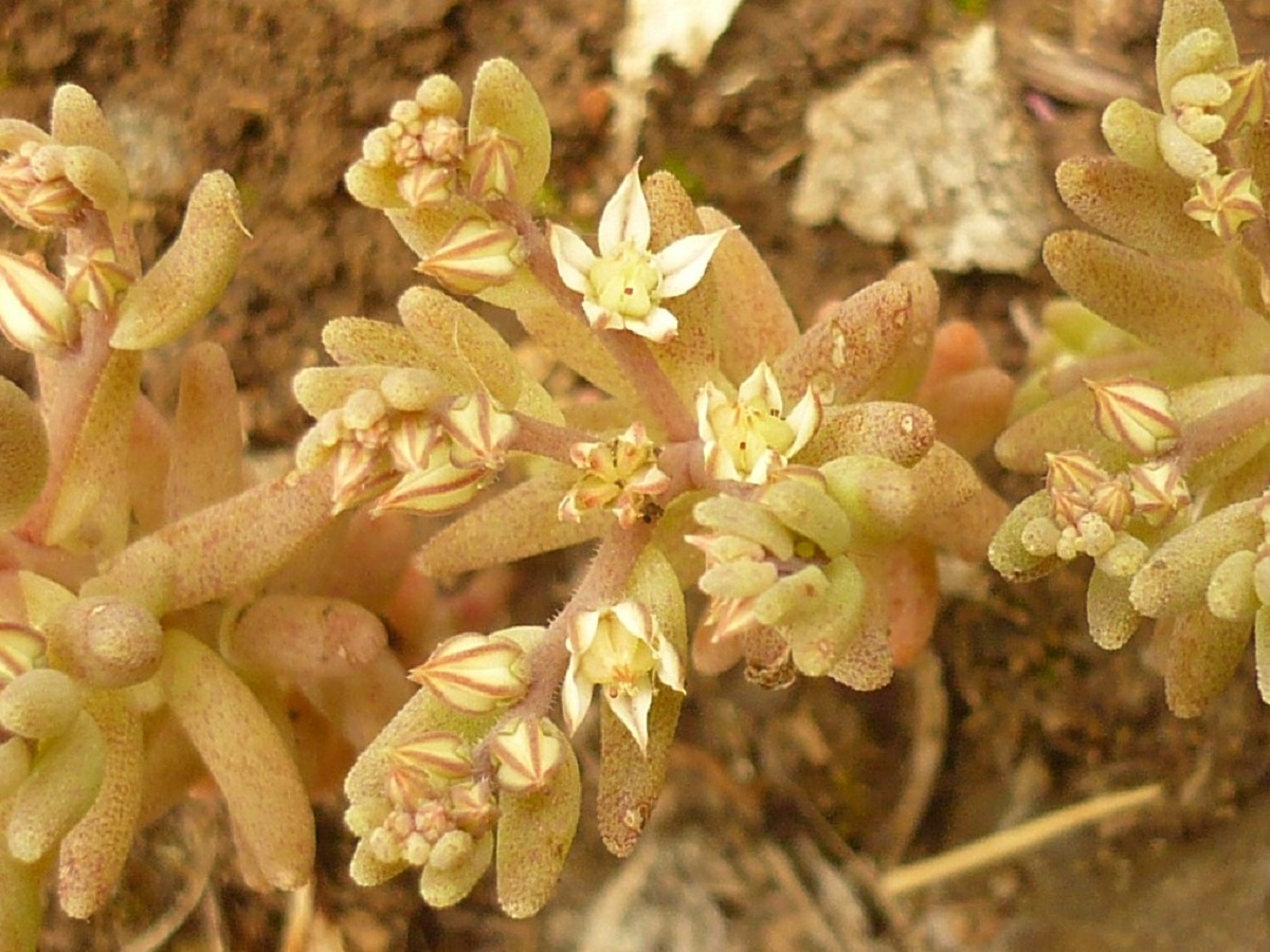 Th – 0,5-1,5 dm – Petites feuilles glauques ± rougeâtres, charnues, alternes, semi-cylindriques – Petites fleurs à 5 pétales blanc rosé acuminés, 5 étamines – Carpelles acuminés