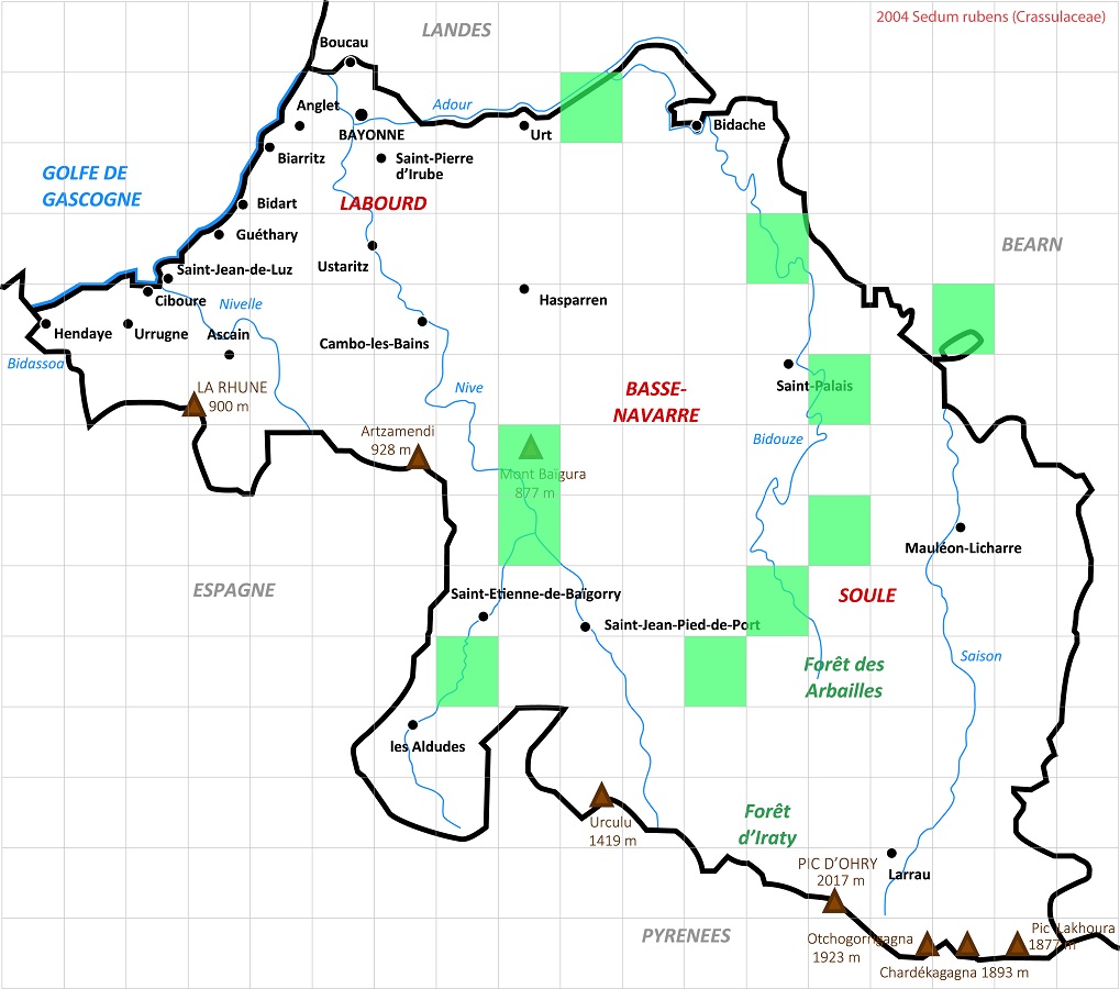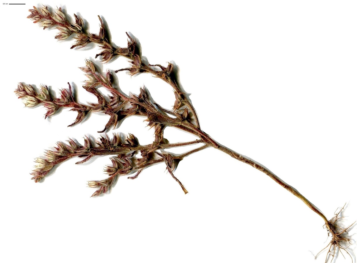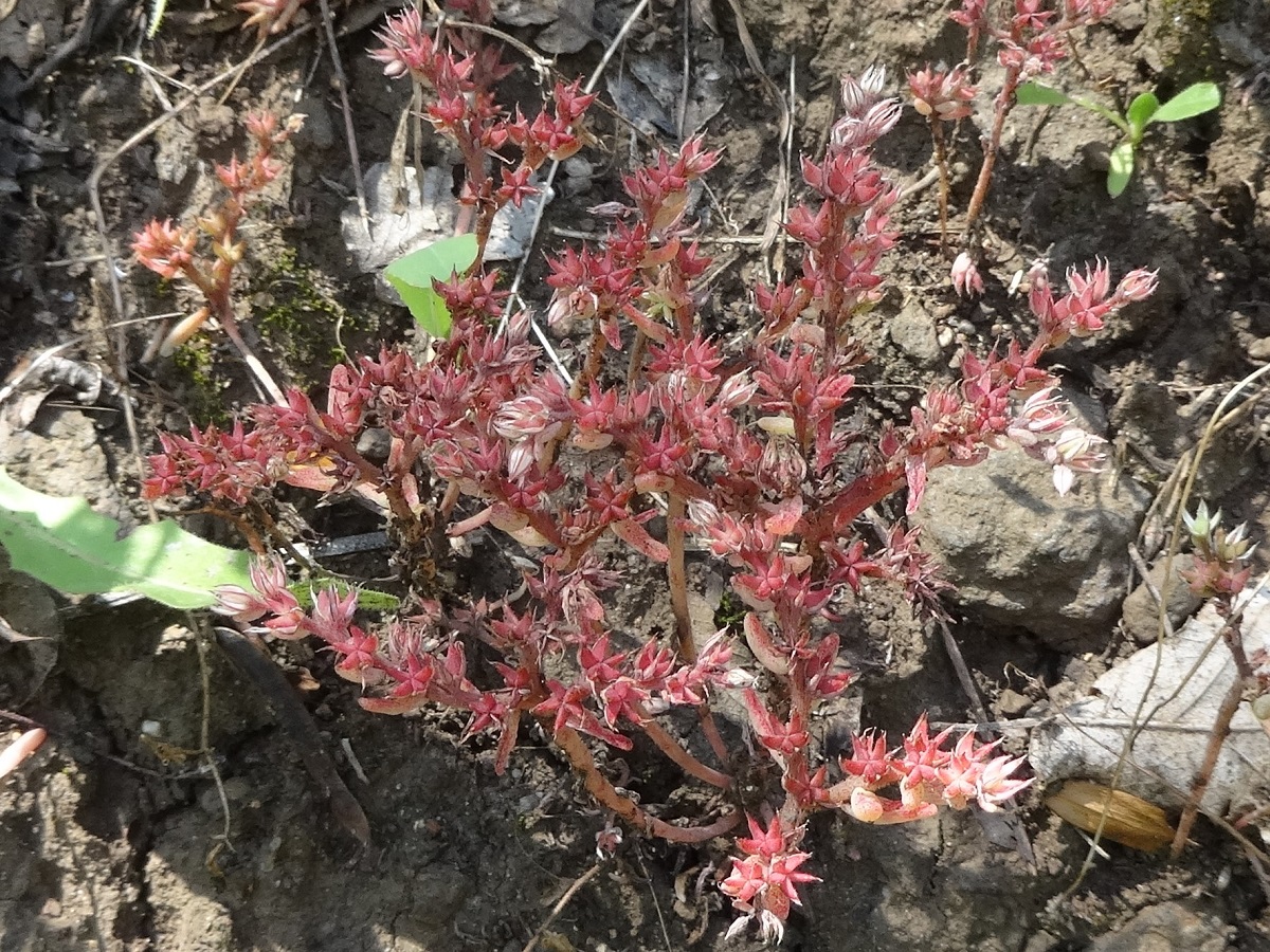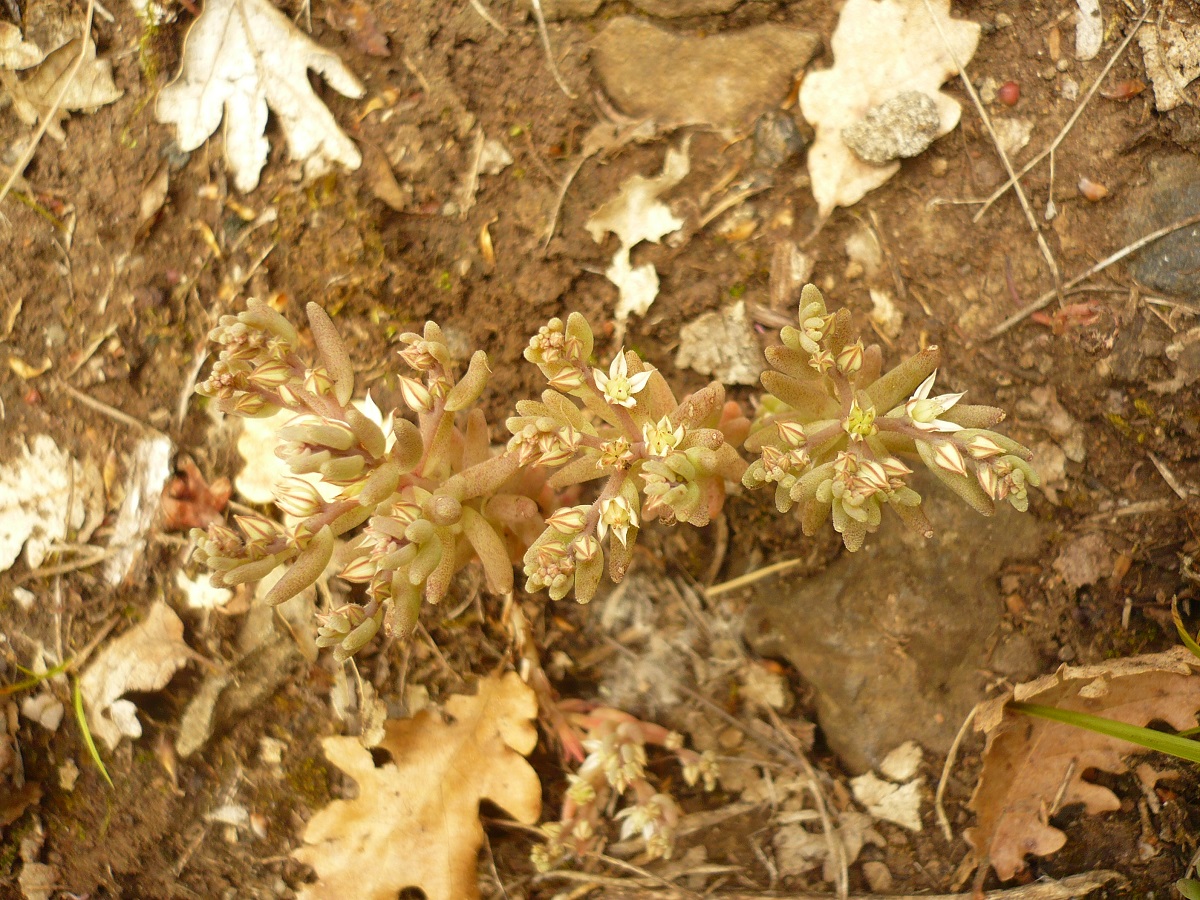 Th – 0,5-1,5 dm – Petites feuilles glauques ± rougeâtres, charnues, alternes, semi-cylindriques – Petites fleurs à 5 pétales blanc rosé acuminés, 5 étamines – Carpelles acuminés