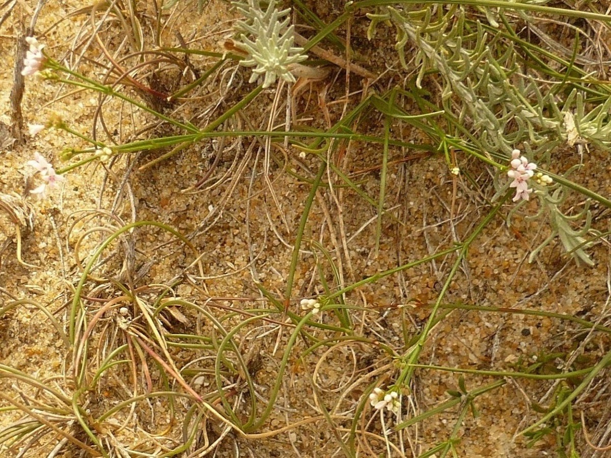 Hc/Ch – 2-4 dm – Stolons orangés, tige raide, entrenoeuds longs, « feuilles » L de 0,5-2 cm, par 4, étroites, ± révolutées – Inflorescence lâche, corolle de Ø ≃ 3 mm rose en entonnoir