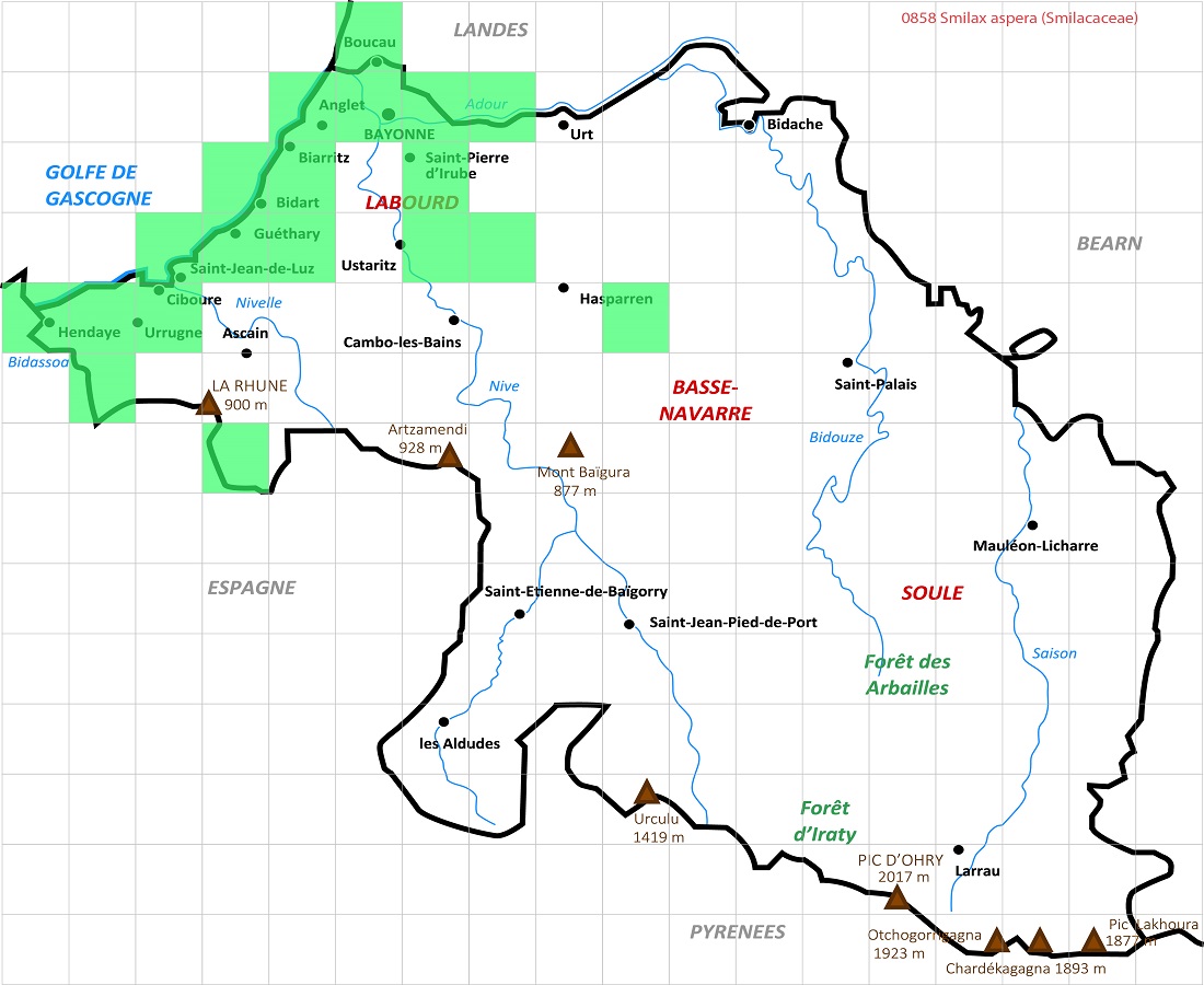 Nom Latin du taxon (Famille) Smilax aspera (Smilacaceae) - Synonymes Latins - nc Nom Français du taxon Salsepareille d'Europe - Autres Noms Français - Liseron épineux Nom en Euskara Endalaharra - Autres Noms en Euskara - Zarzaparrilla Identifiant 0858