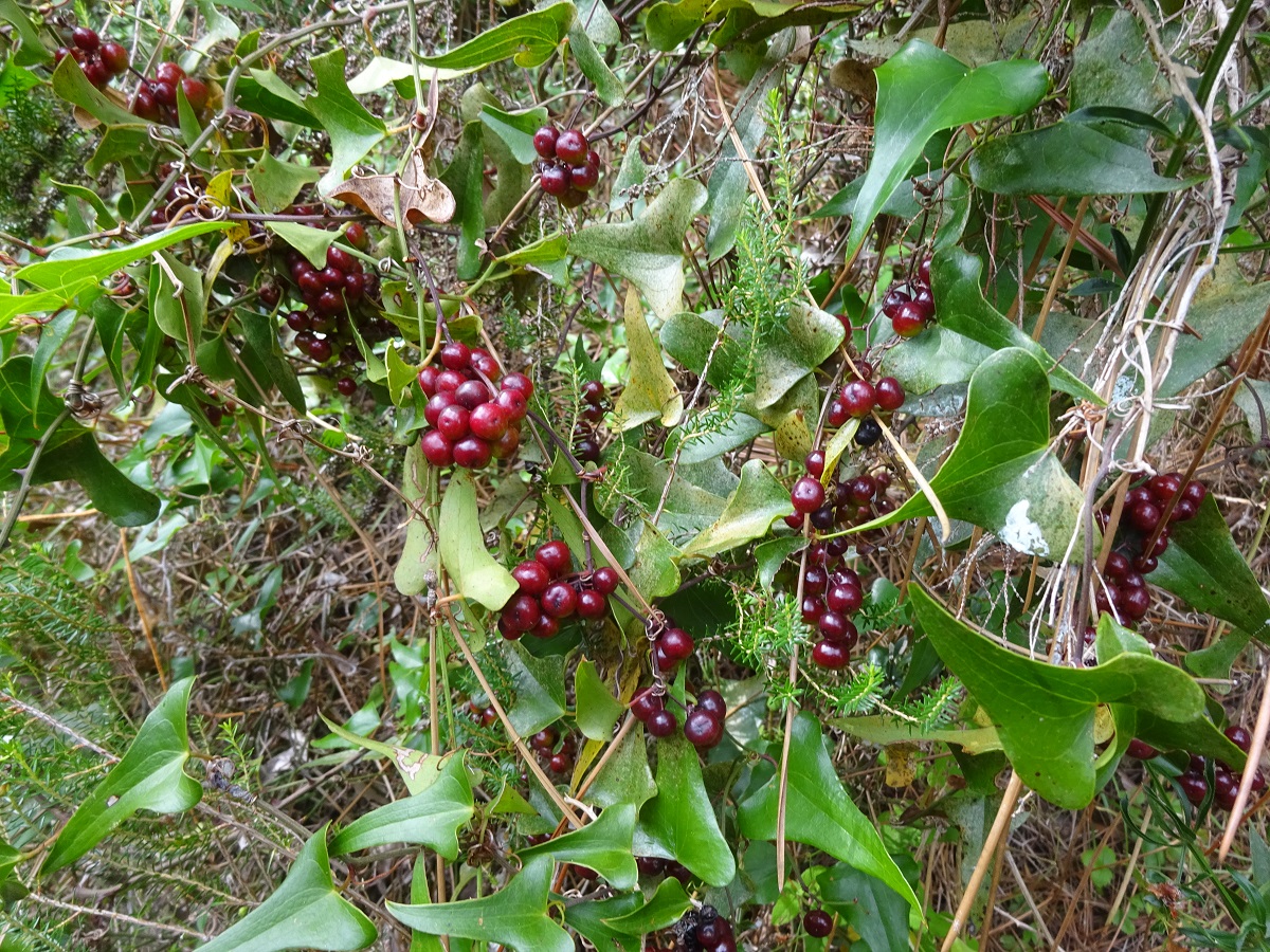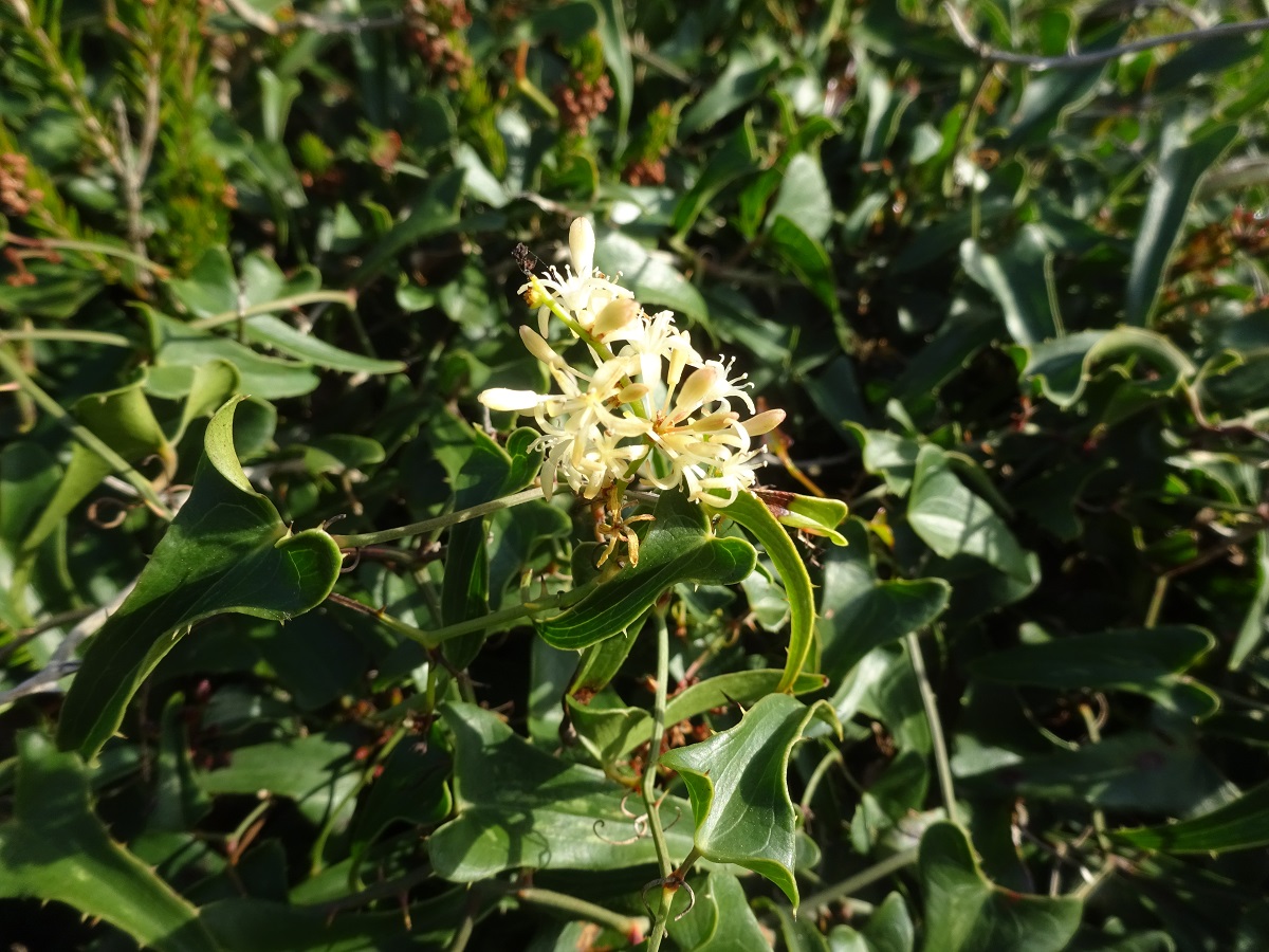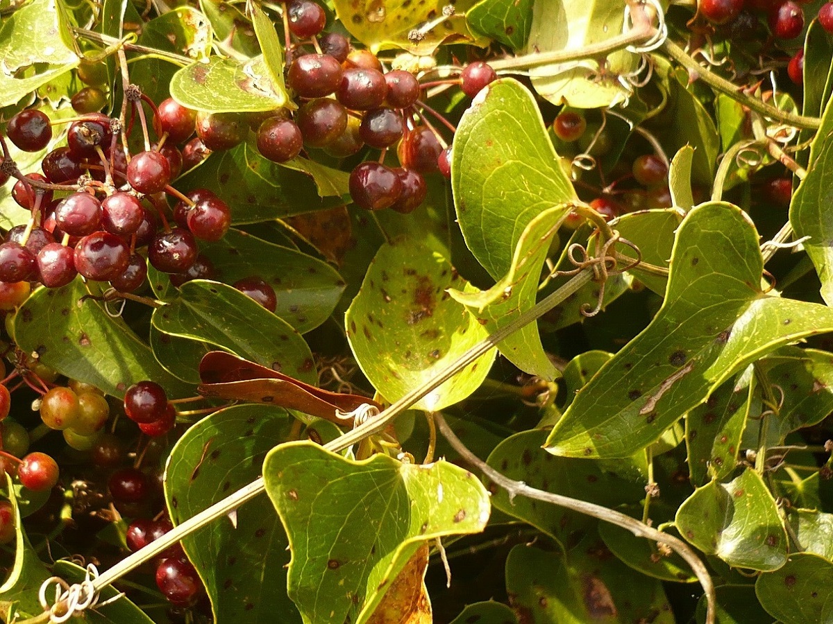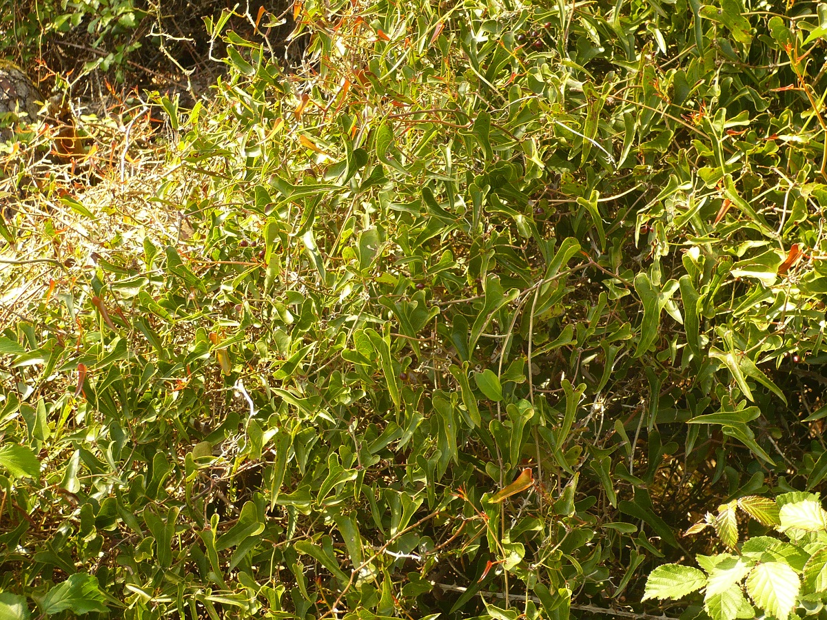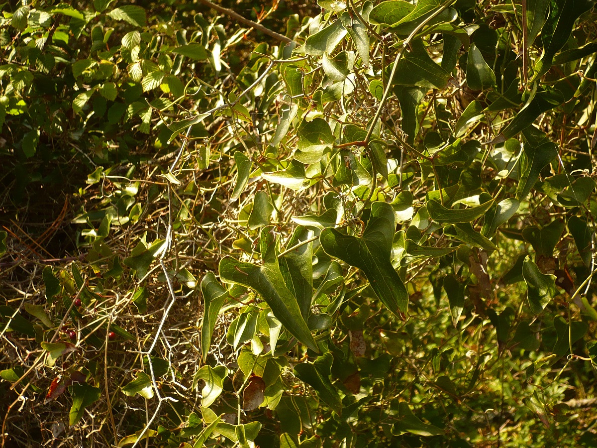 NPh L – 10-40 dm – Tige ligneuse, volubile, épineuse, feuilles aiguës en coeur, rugueuses-piquantes, persistantes – Fleurs jaunâtres, en grappes axillaires – Baie rouge-brun