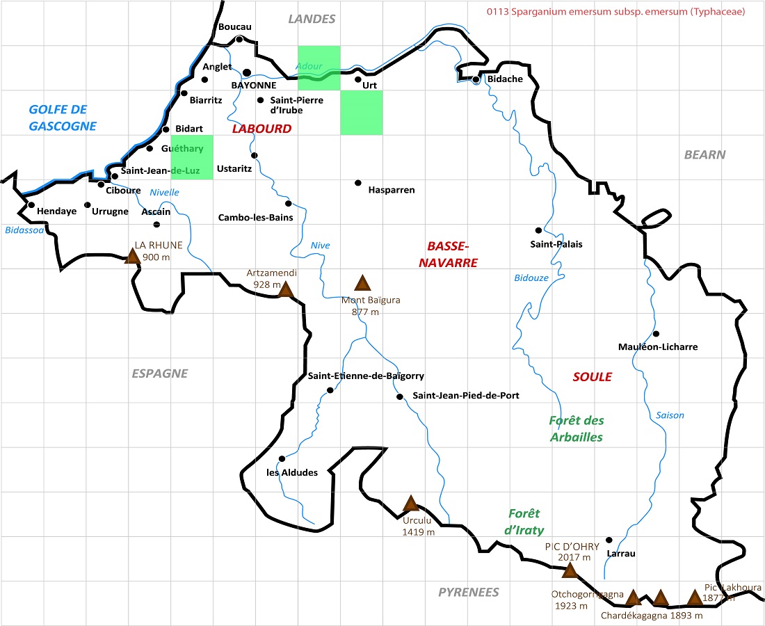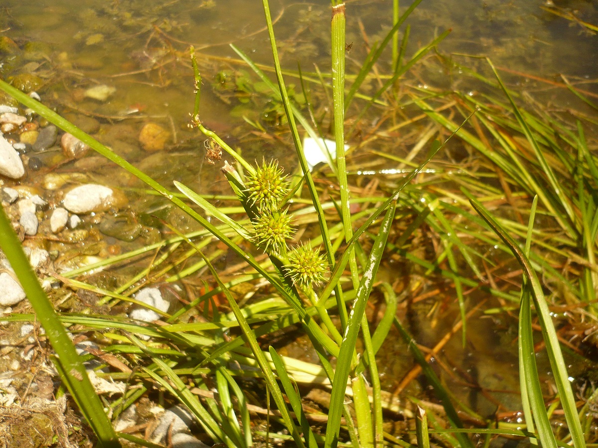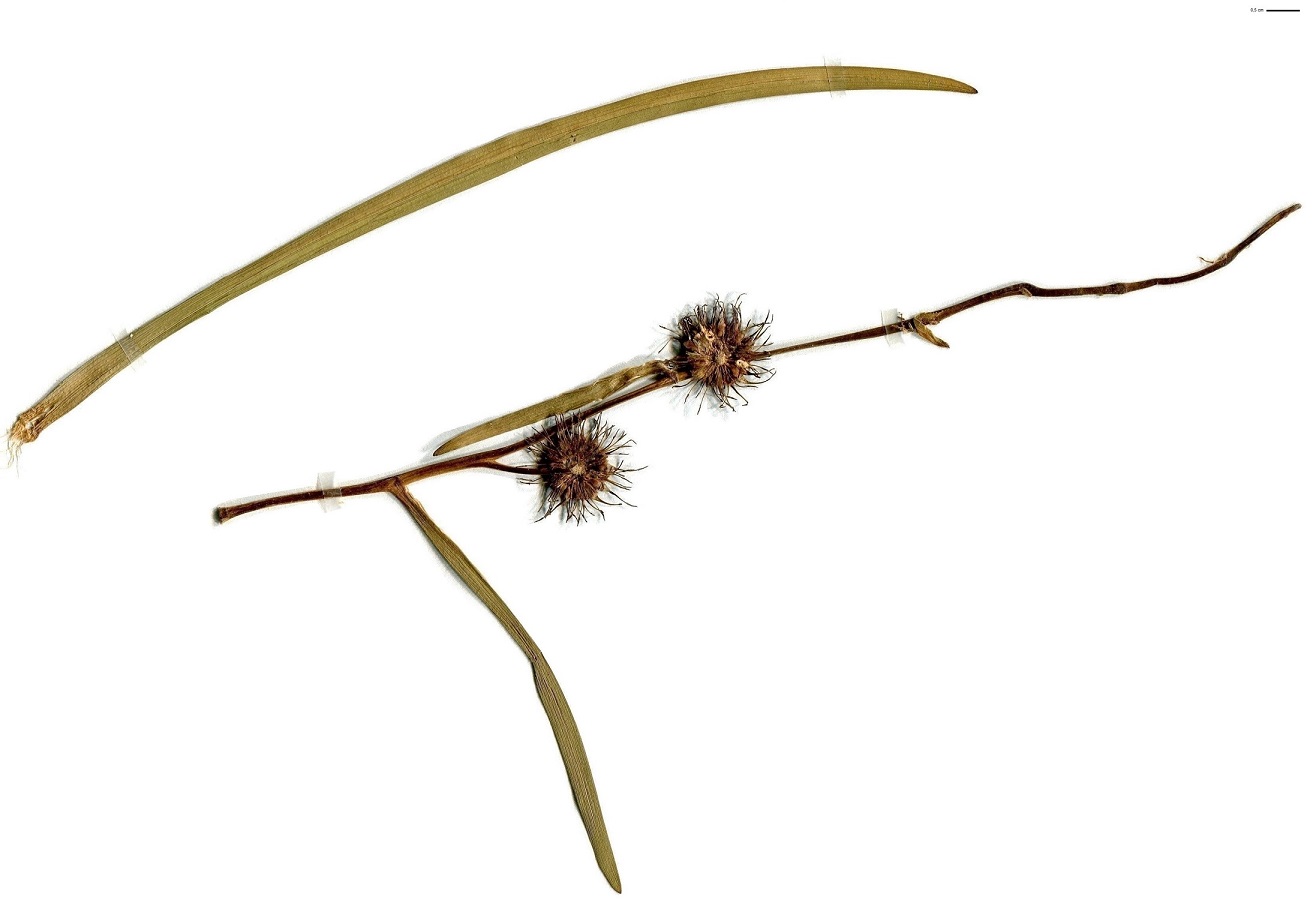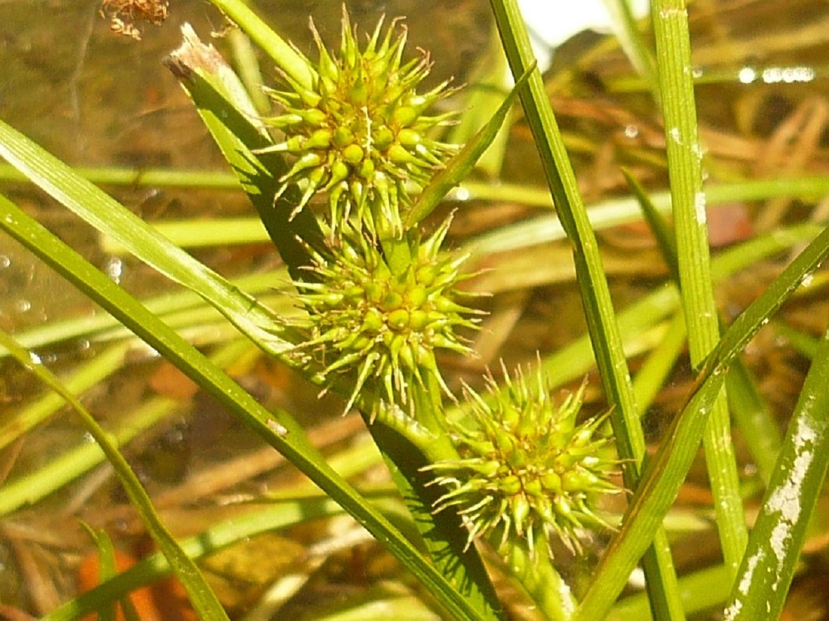 Hydr Hc – 4-12 dm – Feuilles émergées ou flottantes allongées assez fines, à sommet arrondi, à base triangulaire en coupe – Inflorescence simple à 3-4 capitules ♀ pédonculés