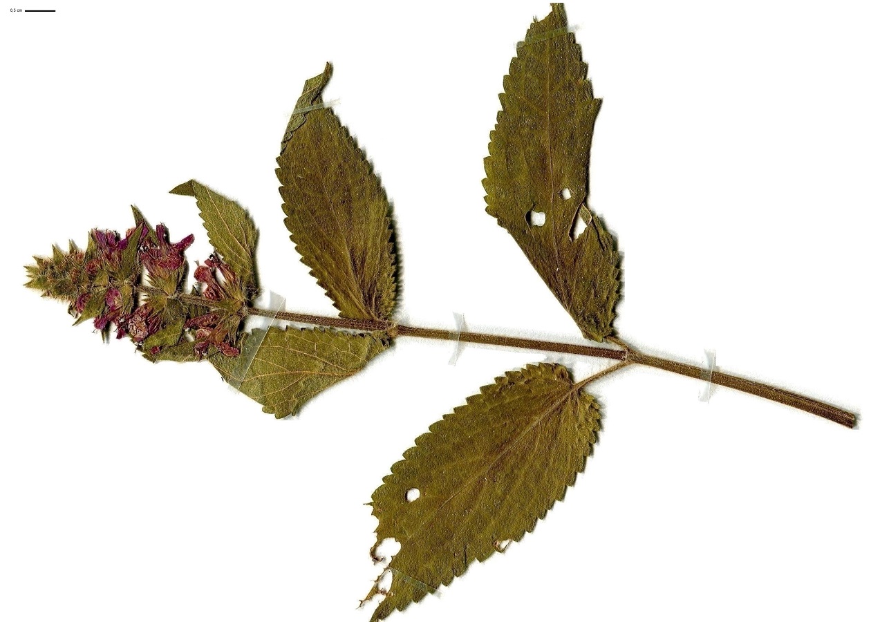 Hc – 4-8 dm – Feuilles L de 3-10 cm oblongues aiguës cordées, crénelées, ± pétiolées – Verticillastres en épi conique dressé, corolle bilabiée pourpre ± foncé L de 13-18 mm