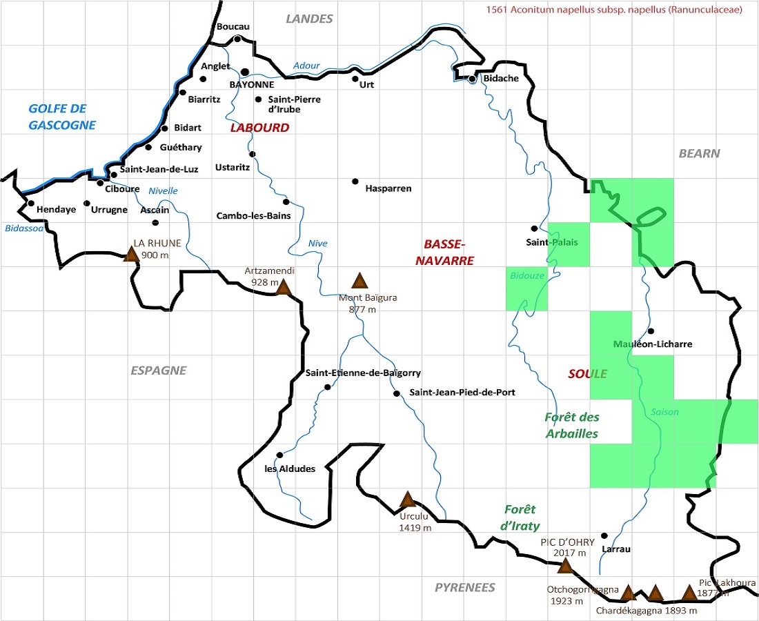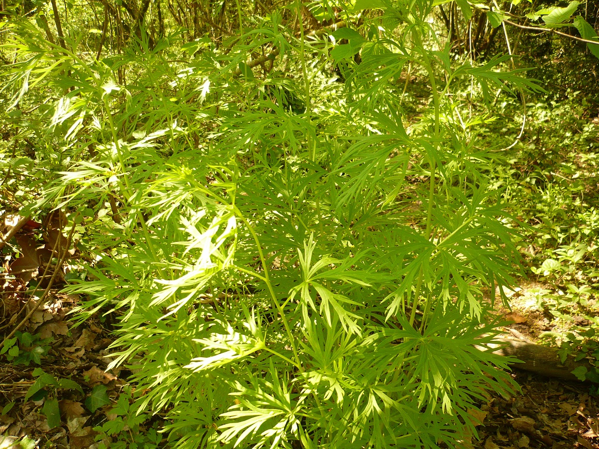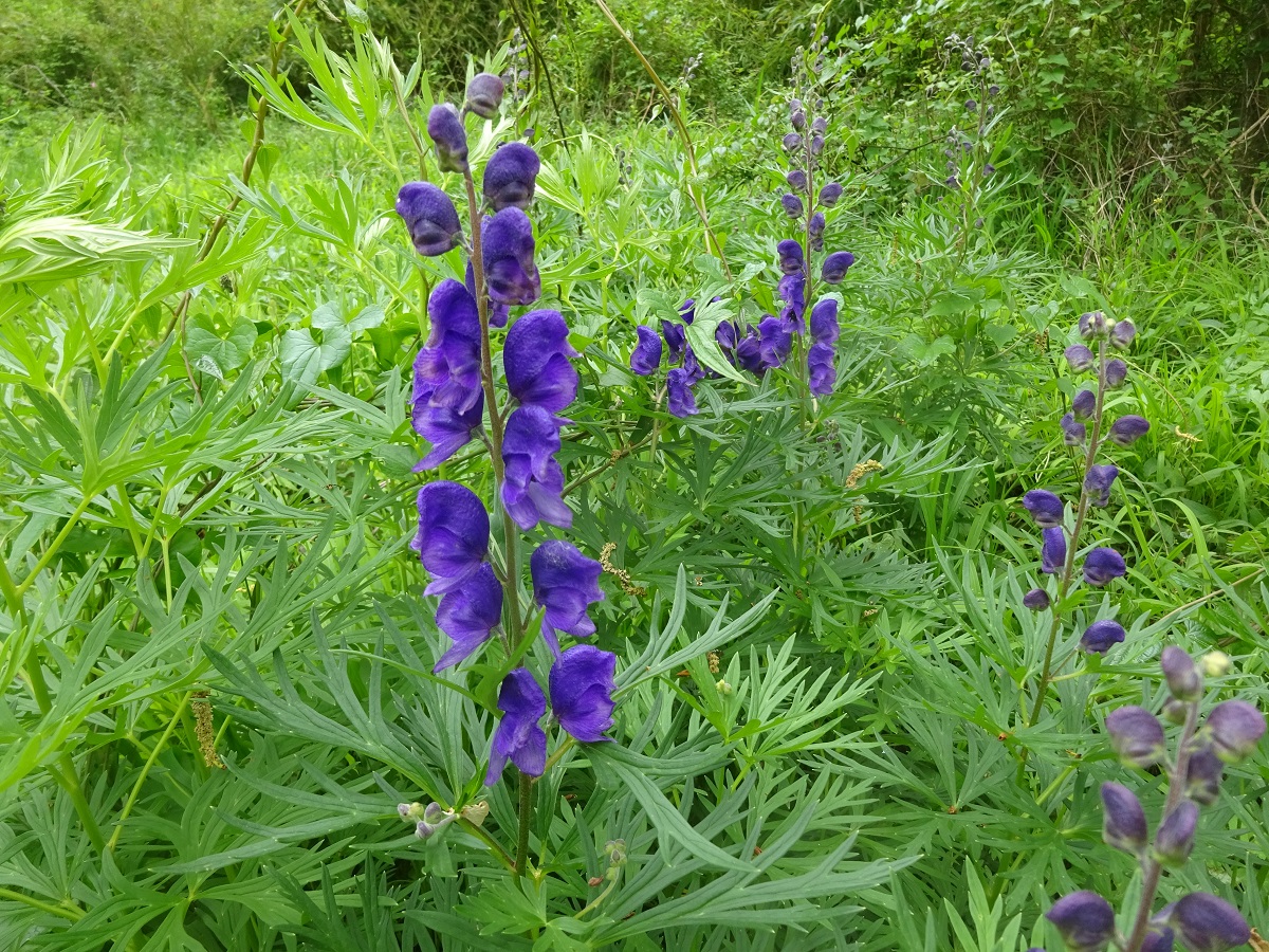 G à tubercule – 5-15 dm – Feuilles basales divisées 5 fois jusqu’au pétiole en lobes étroits, incisés-lancéolés – Grappe lâche de grandes fleurs bleu-violet à casque aussi large que long