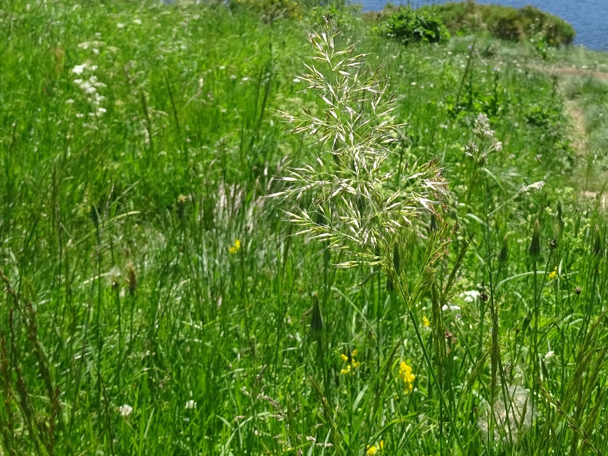 Hc – 4-8 dm – Feuilles planes à bord cilié, ligule courte, tronquée – Panicule fournie, contractée puis étalée, vert-jaunâtre soyeuse, à fins épillets terminés en arêtes coudées