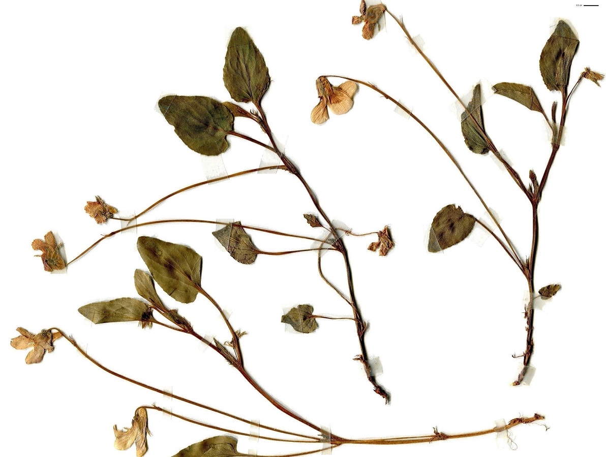 Hc – 1-3 dm – Feuilles axillaires, sans rosette basale, ovales ± cordées, crénelées, stipules ± dentées – Fleurs azurées à éperon épais assez court, ± jaunâtre