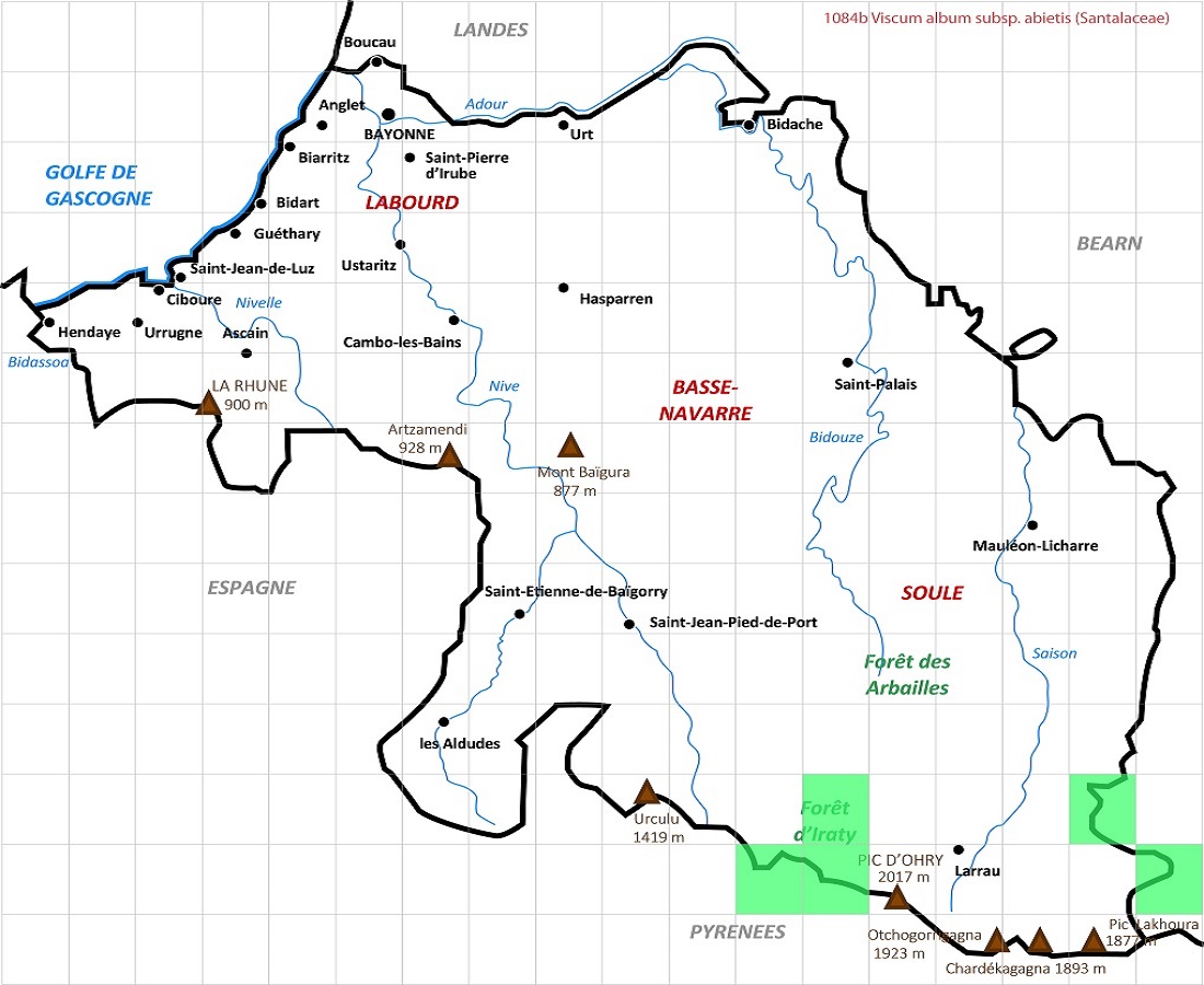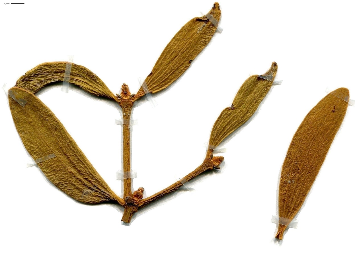 Ch Spar – 4-8 dm – Sur sapin, feuilles assez grandes oblongues, vertes, épaisses, coriaces – Petites fleurs jaunâtres – Baies pyriformes blanches, graines à faces convexes