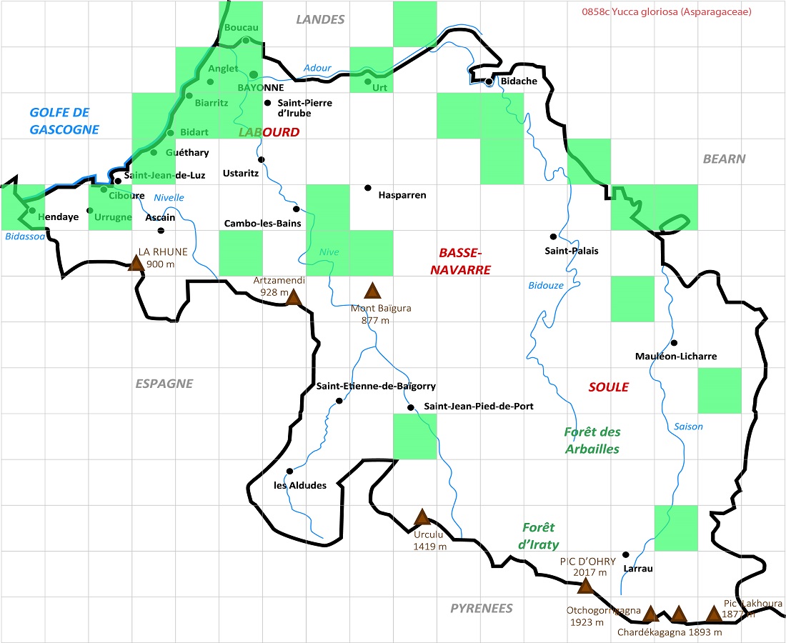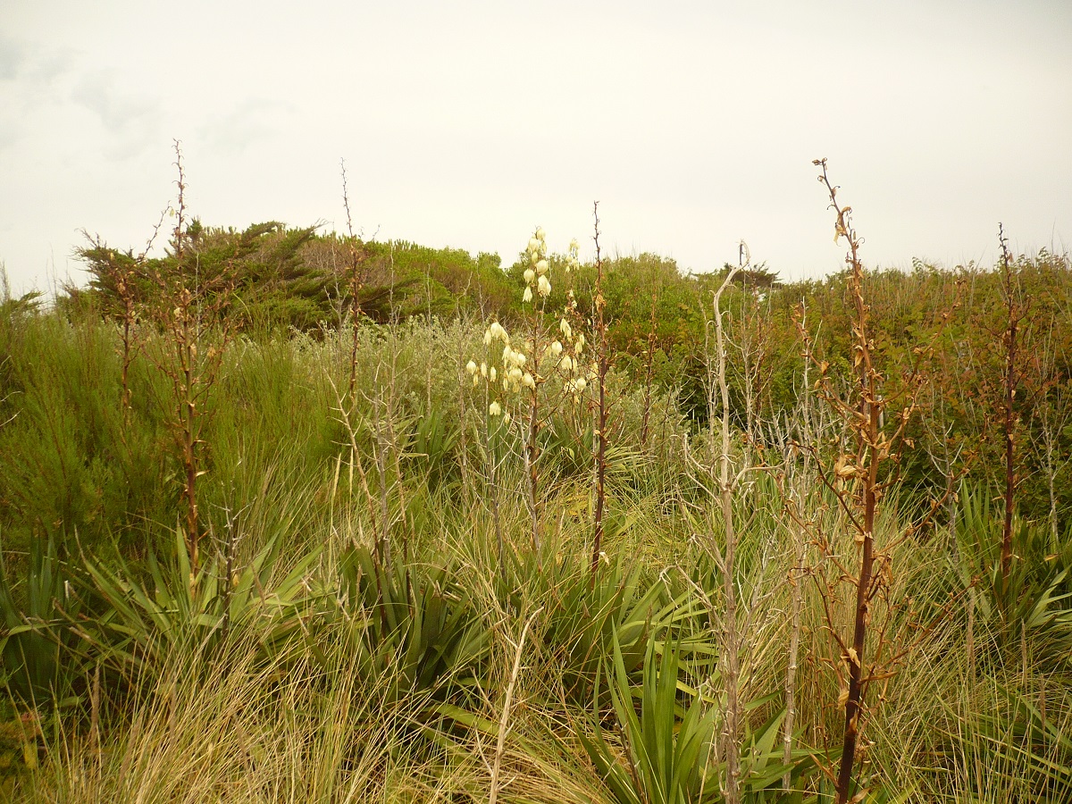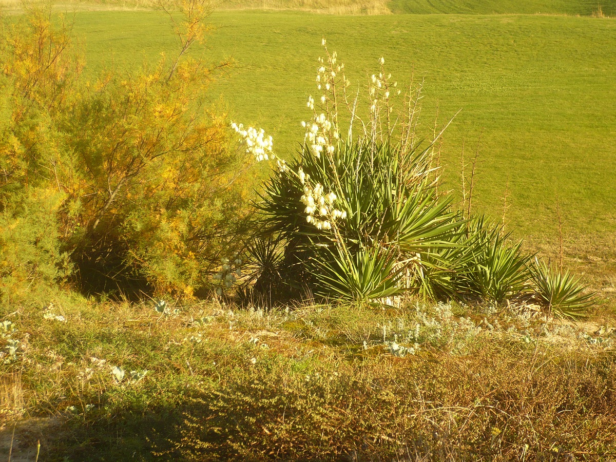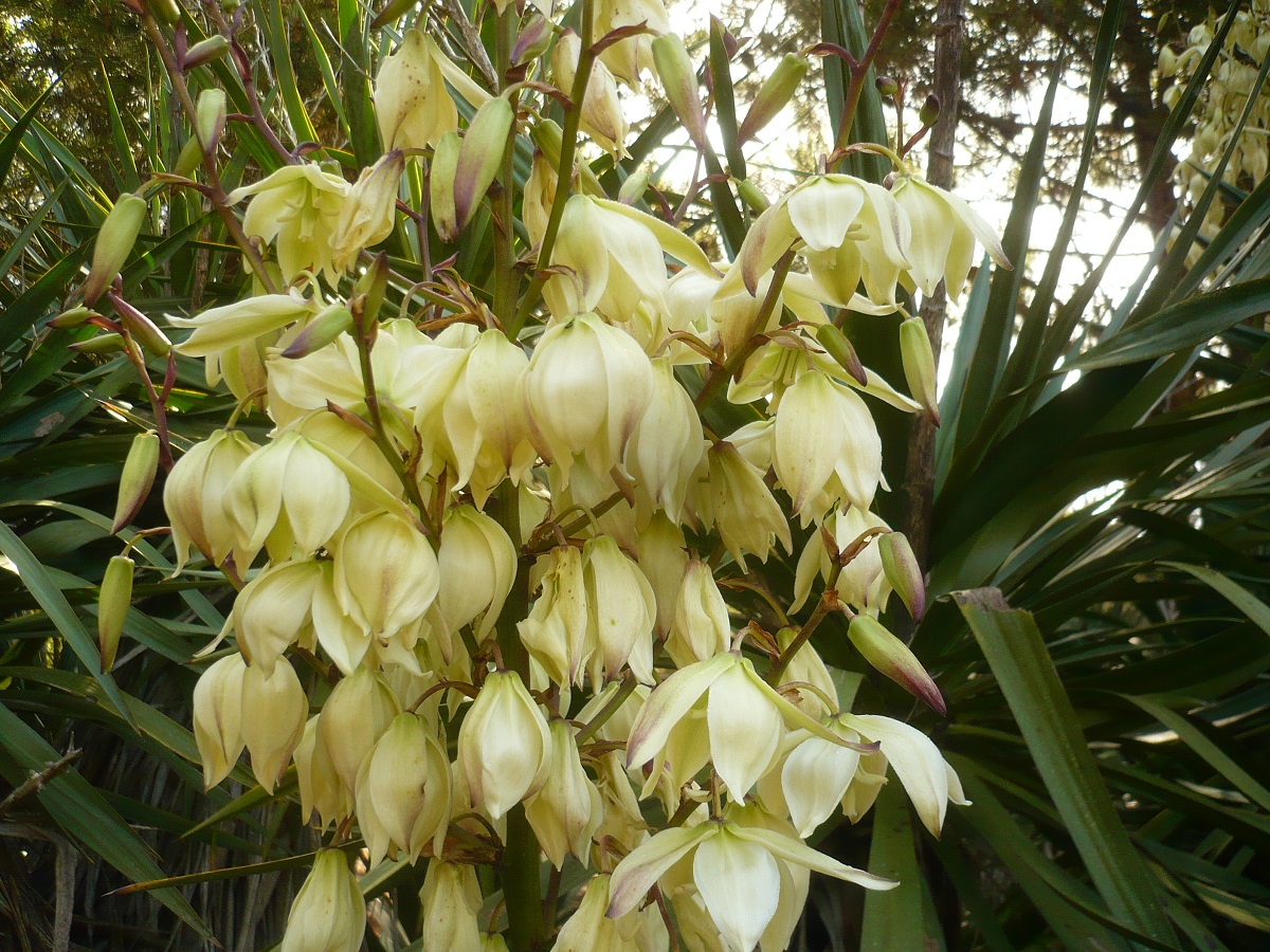 NPh – 1-2,5 m – Feuilles en rosette persistante, longues, planes, charnues, rigides, à apex très piquant – Panicules élevées de grandes fleurs blanches en cloche pendante