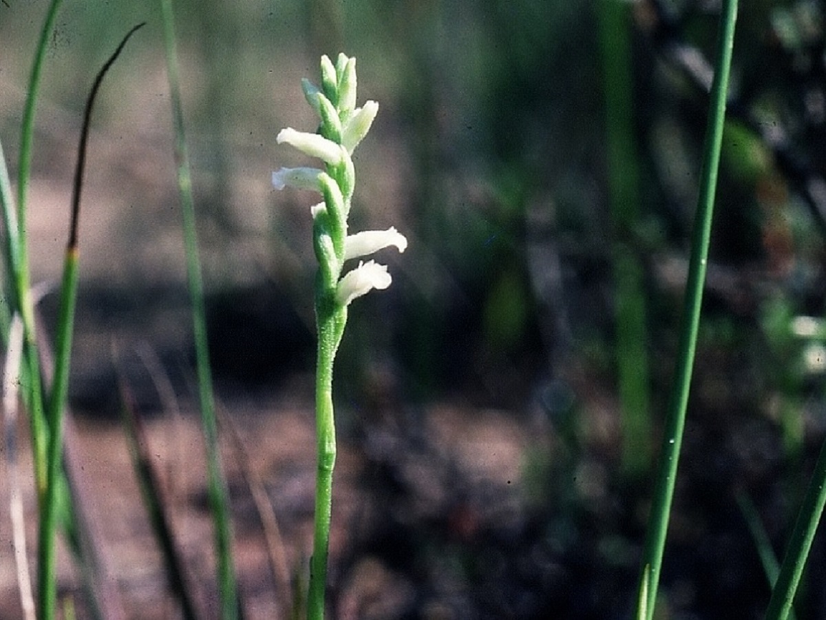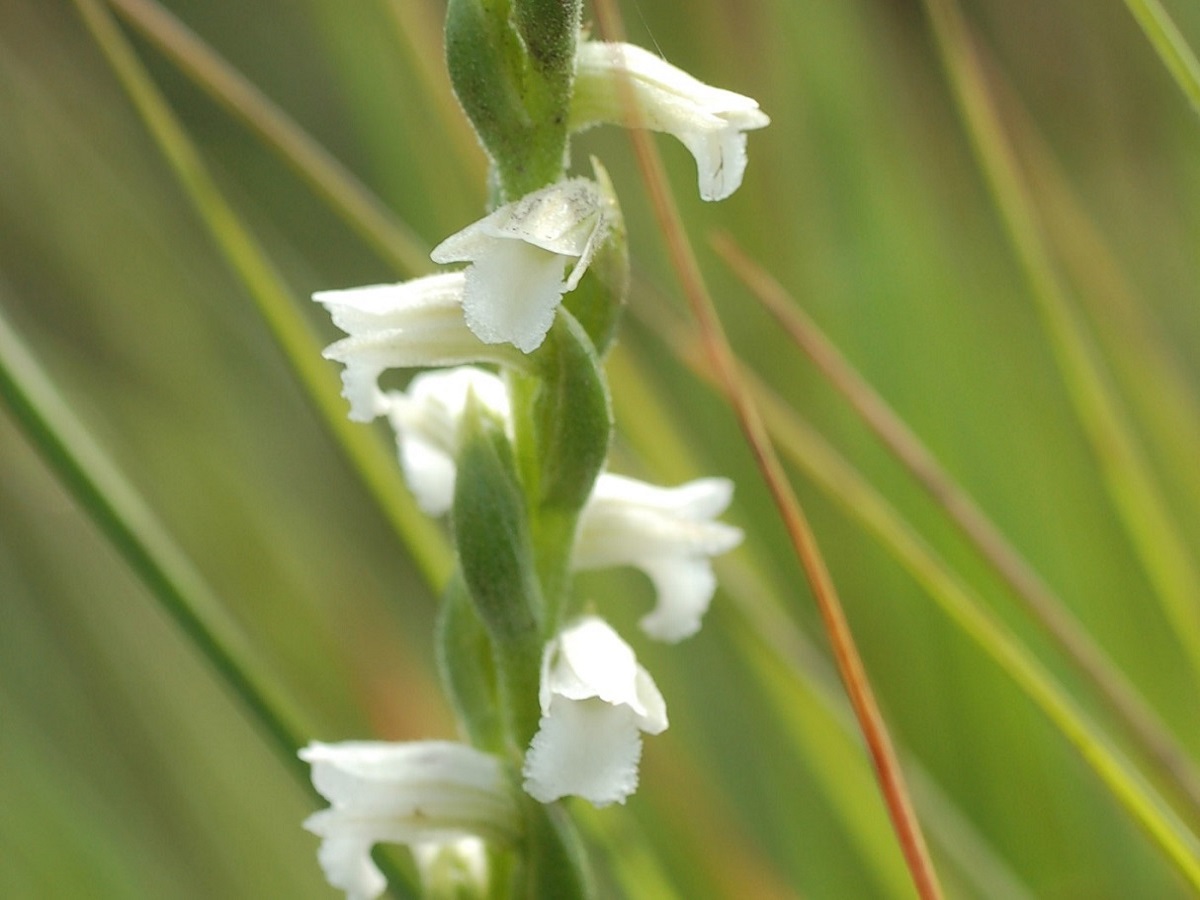 G à bulbe – 1-3 dm – Rosette de feuilles oblongues dressées, les > appliquées – Épi spiralé de fleurs de L 5-7 mm peu odorantes entièrement blanches à labelle frangé, sans éperon