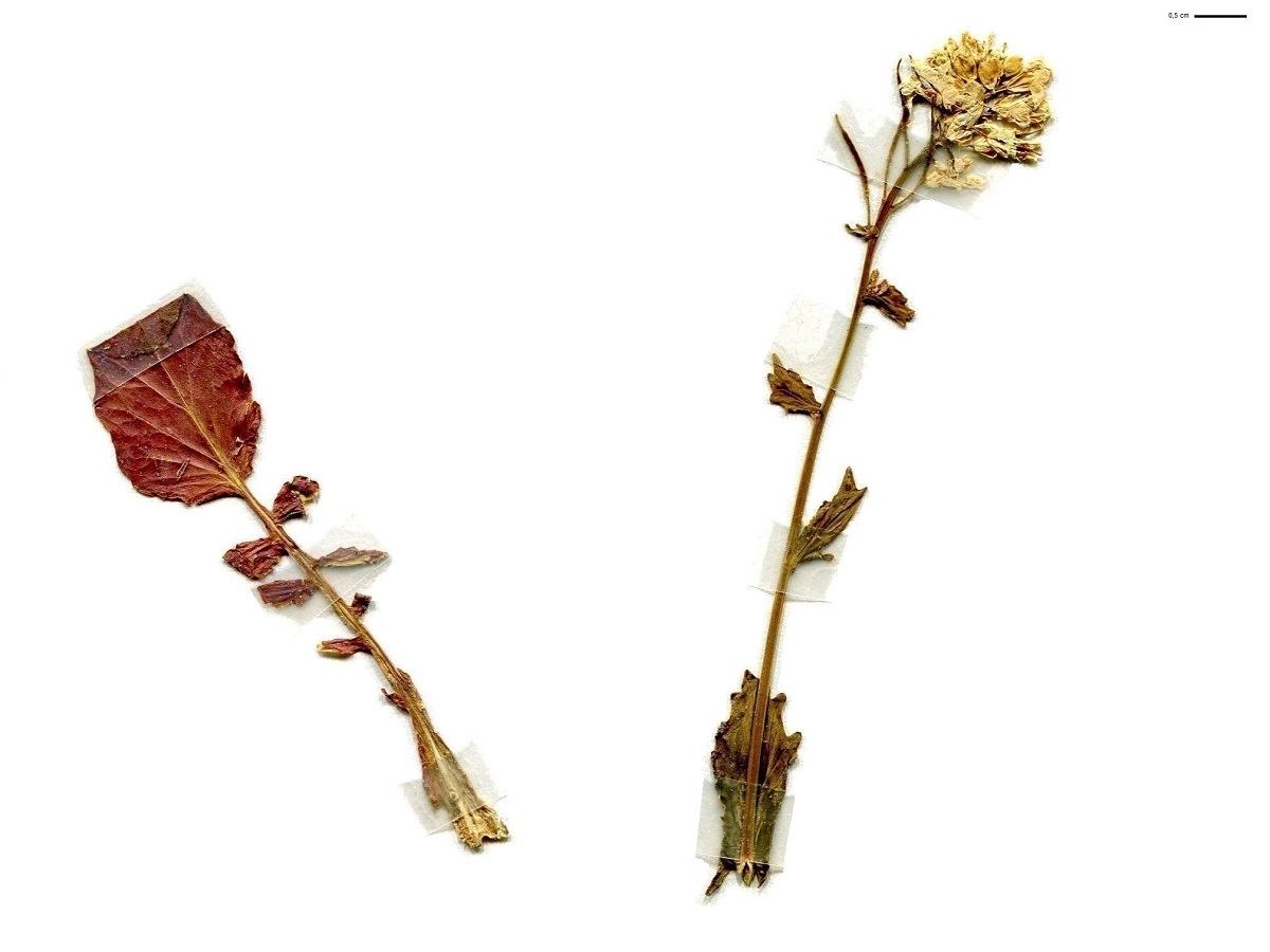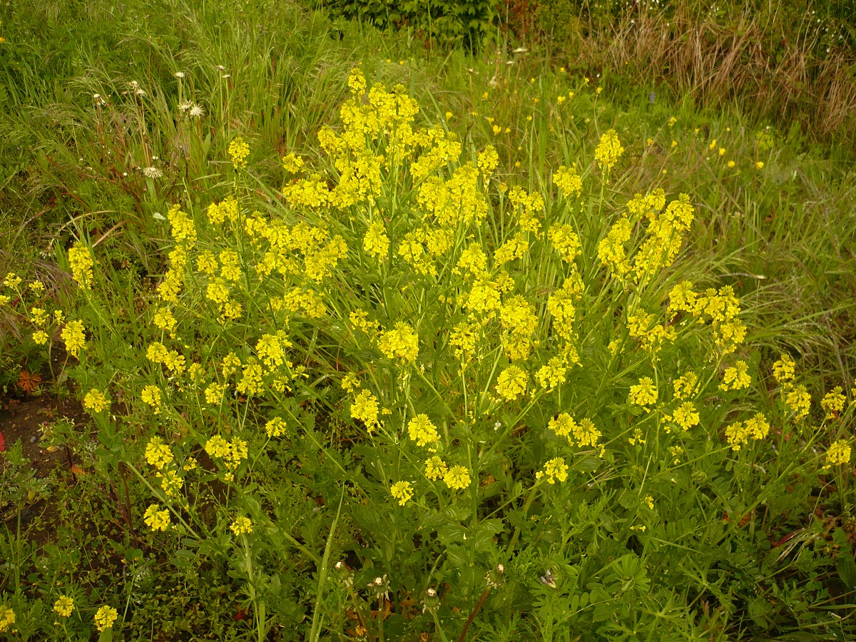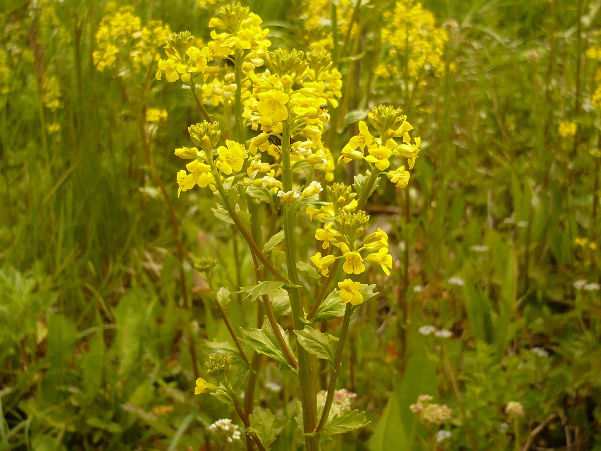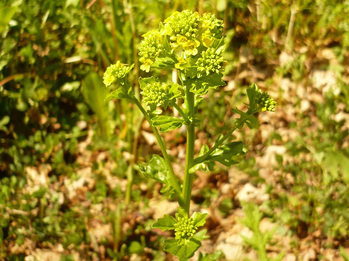 Hc – 3-8 dm – Robuste, feuilles < lyrées à grand lobe terminal et autres lobes ovales, les > dentées – Grappes denses de fleurs jaunes – Siliques courtes écartées à bec de L 2-3 mm