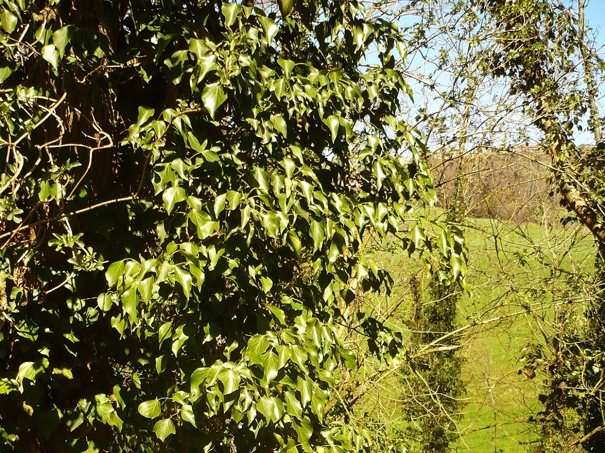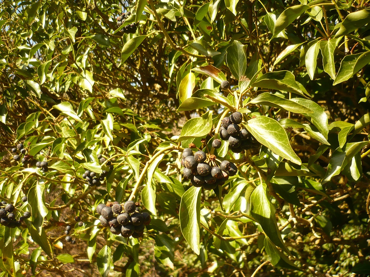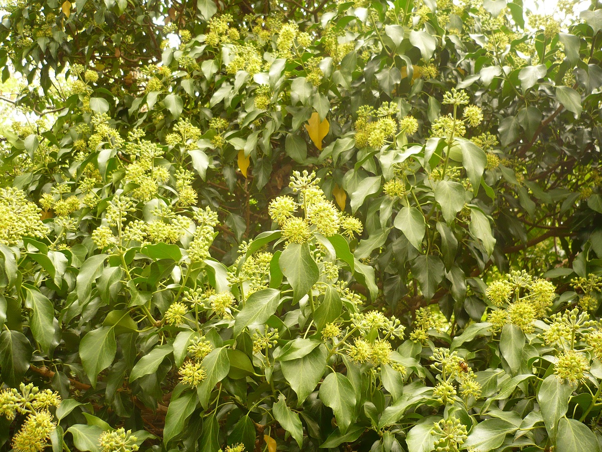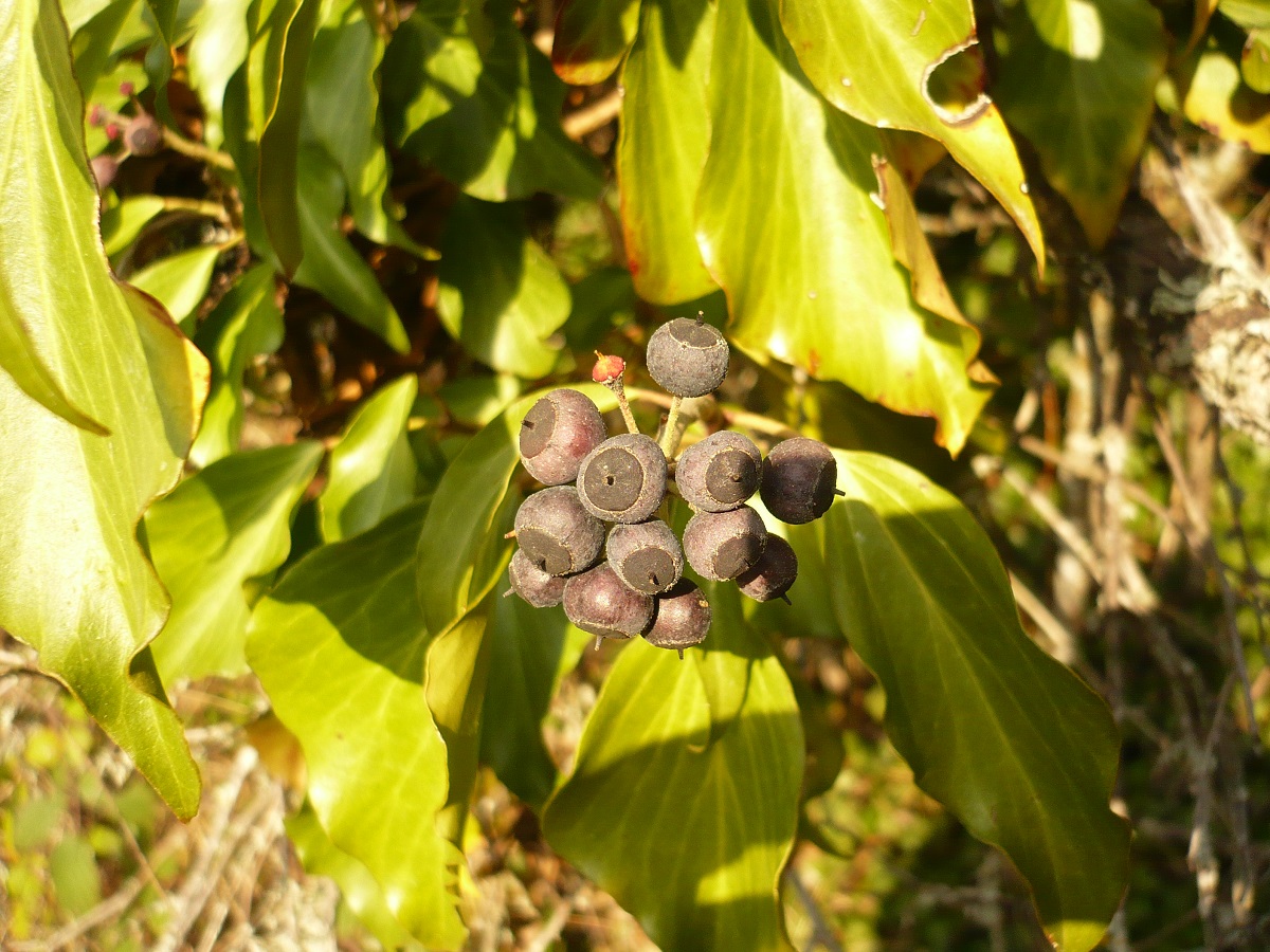 Ph L – 3-20 m – Liane, feuilles de L 4-8 cm ovales aiguës à 3-5 lobes, luisantes, vert foncé, persistantes – Fleurs verdâtres en ombelles sphériques – Fruit noir de Ø ≃ 8 mm à 2-3 graines