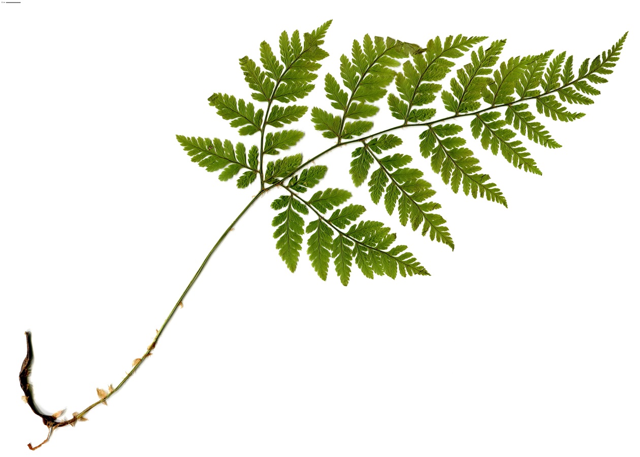 Hc – 4-8 dm – Limbe assez fin, triangulaire 3 fois divisé, pennes basales dissymétriques, écailles du pétiole clairsemées, marron clair uniforme – Sores bruns, ronds