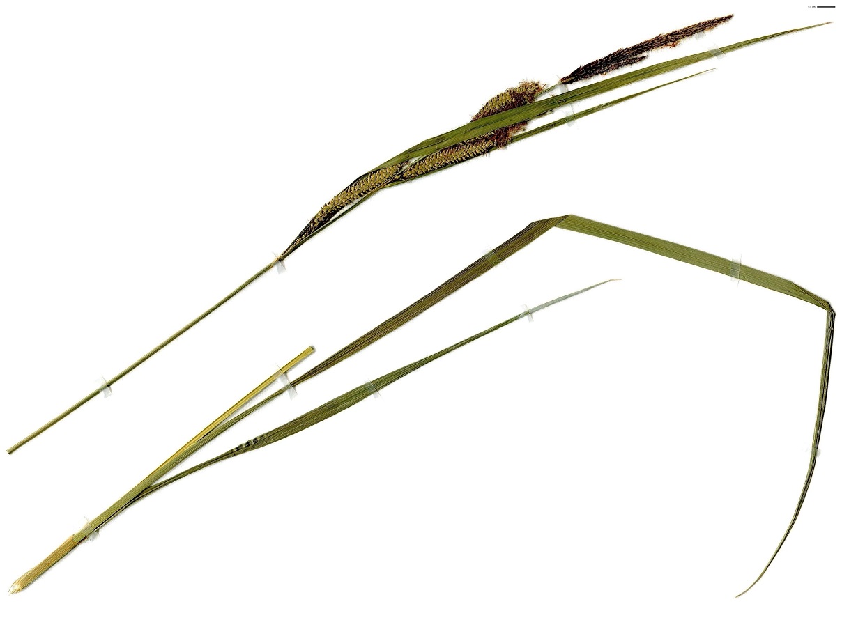 G à rhizome – 4-12 dm – Feuilles larges de 7-10 mm – 2-3 Épis > ♂, 3-4 épis ♀ L de 3-10 cm, écailles brun vert, bractée < longue, 2 stigmates – Utricule de L ≃ 4 mm vert, aplati à bec court
