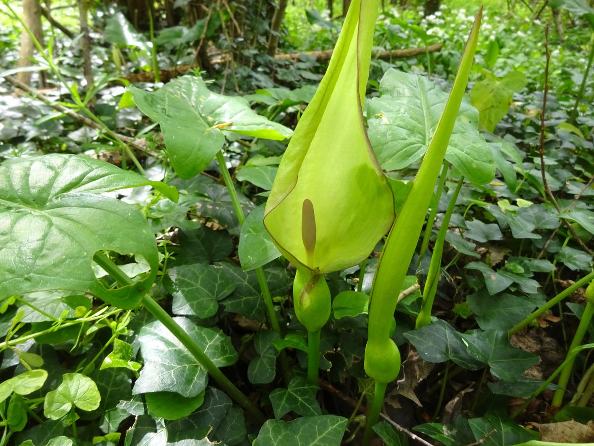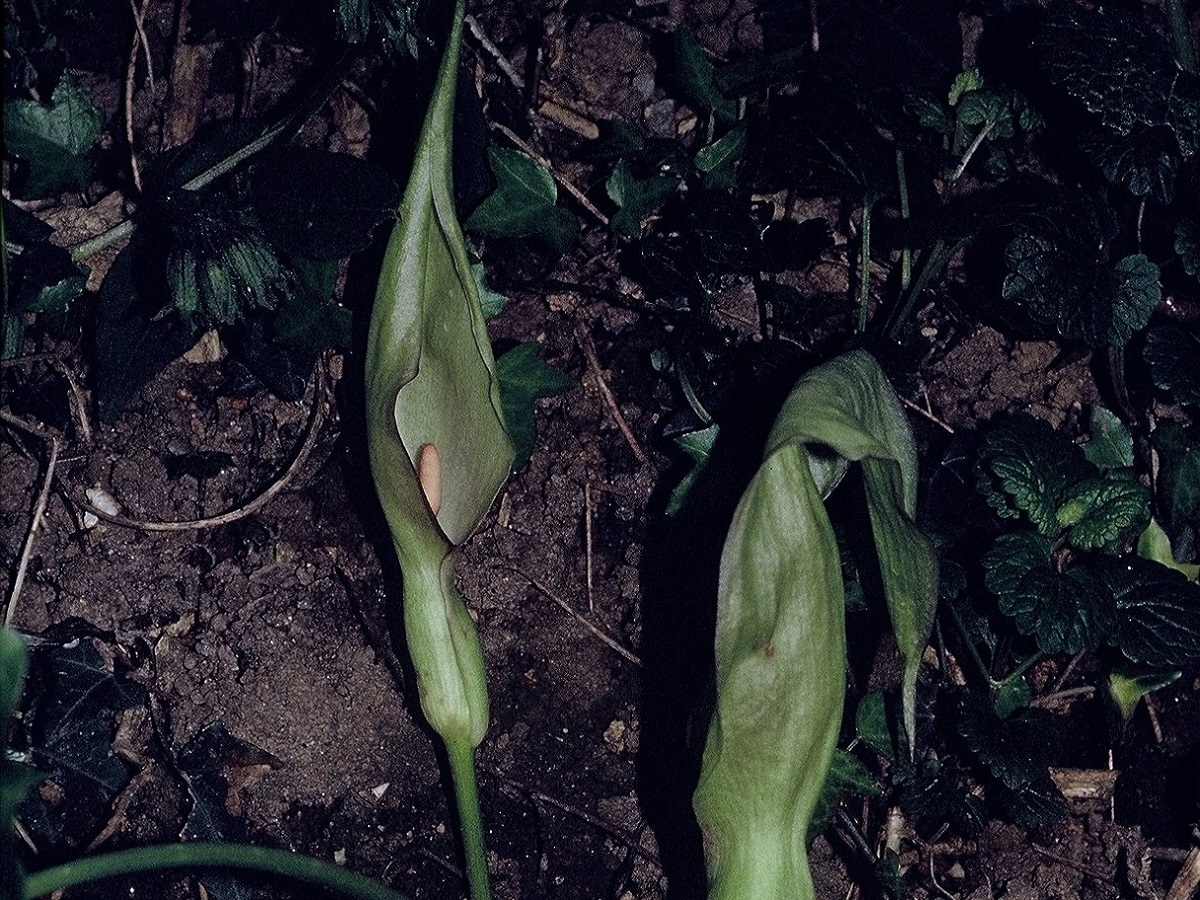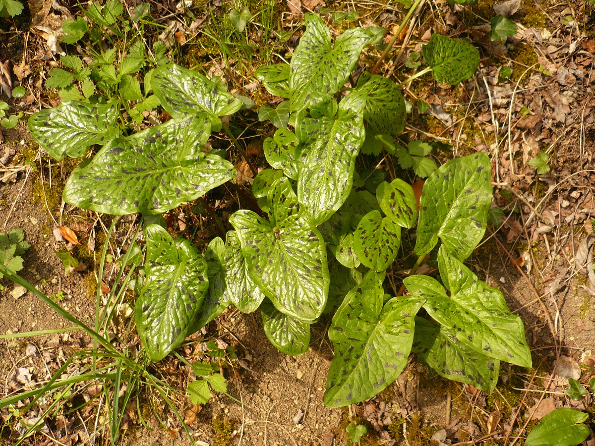 G à tubercule – 2-4 dm – Feuilles printanières ± hastées, ± maculées de noir, pétiolées – Spathe livide, spadice en massue violacé – Baies rouges, en épi cylindrique dense de L ≃ 5 cm
