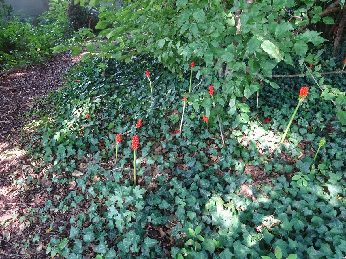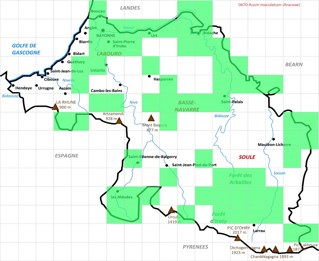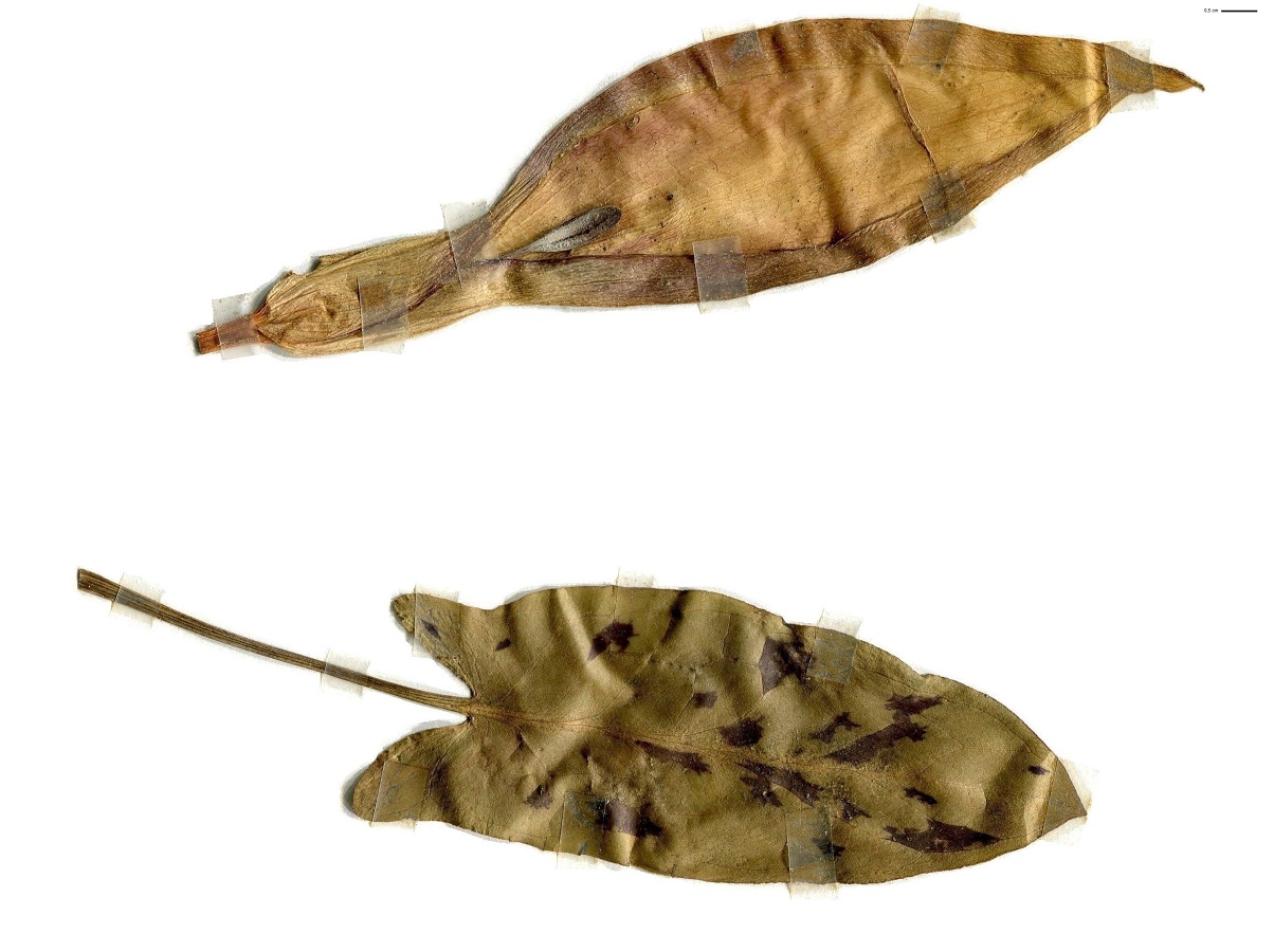 G à tubercule – 2-4 dm – Feuilles printanières ± hastées, ± maculées de noir, pétiolées – Spathe livide, spadice en massue violacé – Baies rouges, en épi cylindrique dense de L ≃ 5 cm