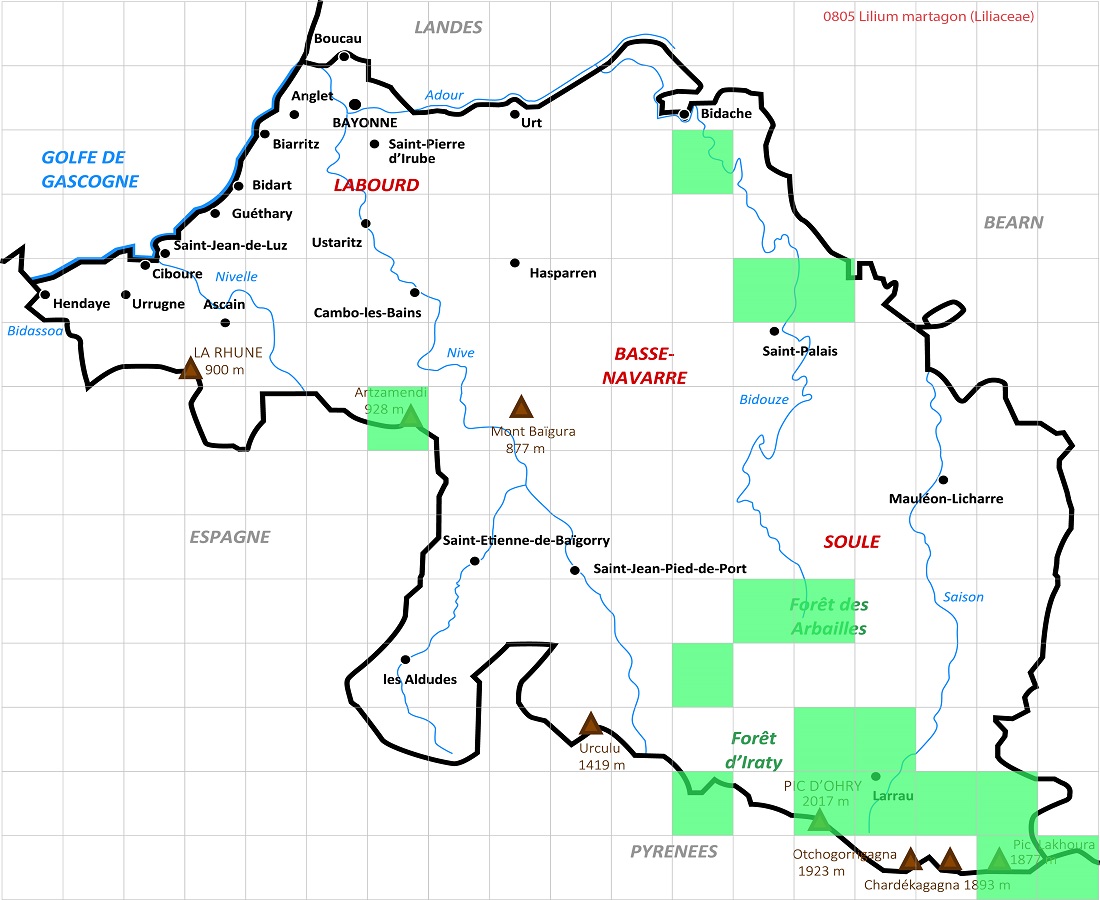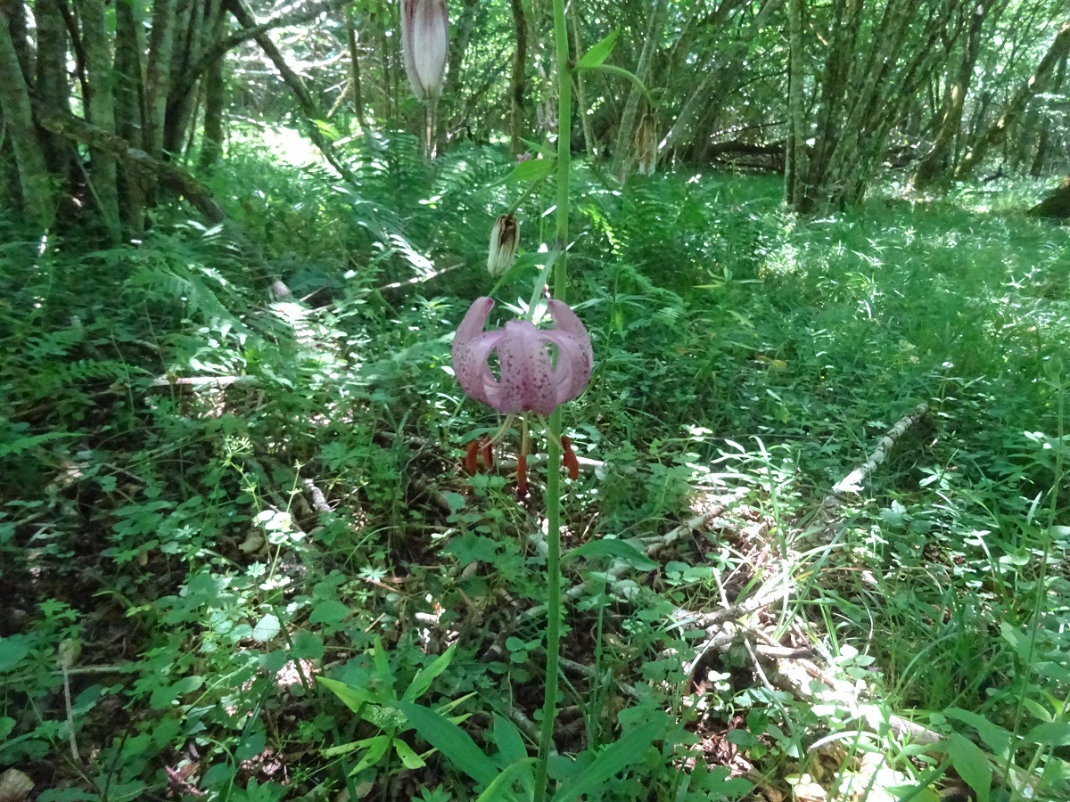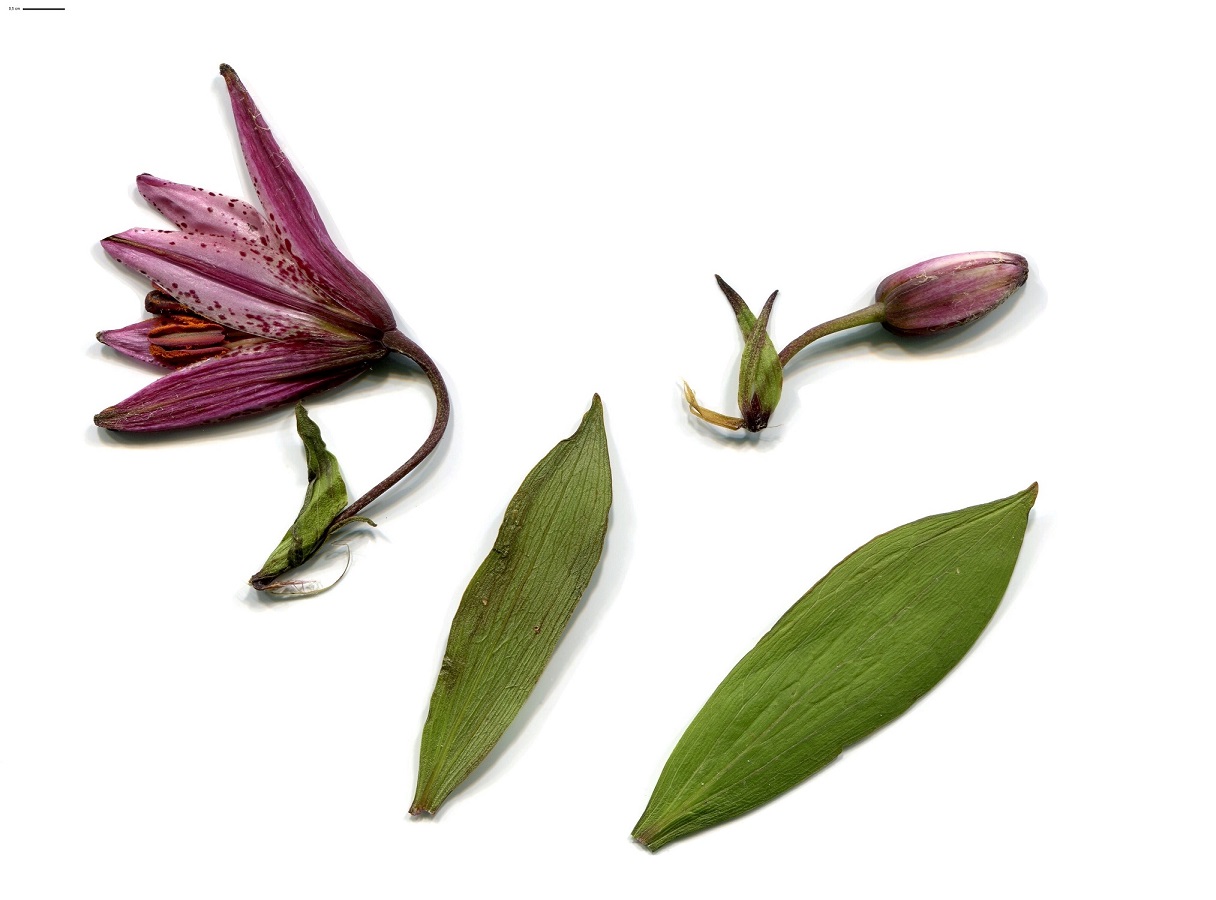 G à bulbe – 5-15 dm – Feuilles elliptiques ± verticillées par 5-10 – Racème de belles fleurs de Ø 4-5 cm pendantes à 6 tépales rose-violacé ponctués, récurvés, étamines rouge orangé