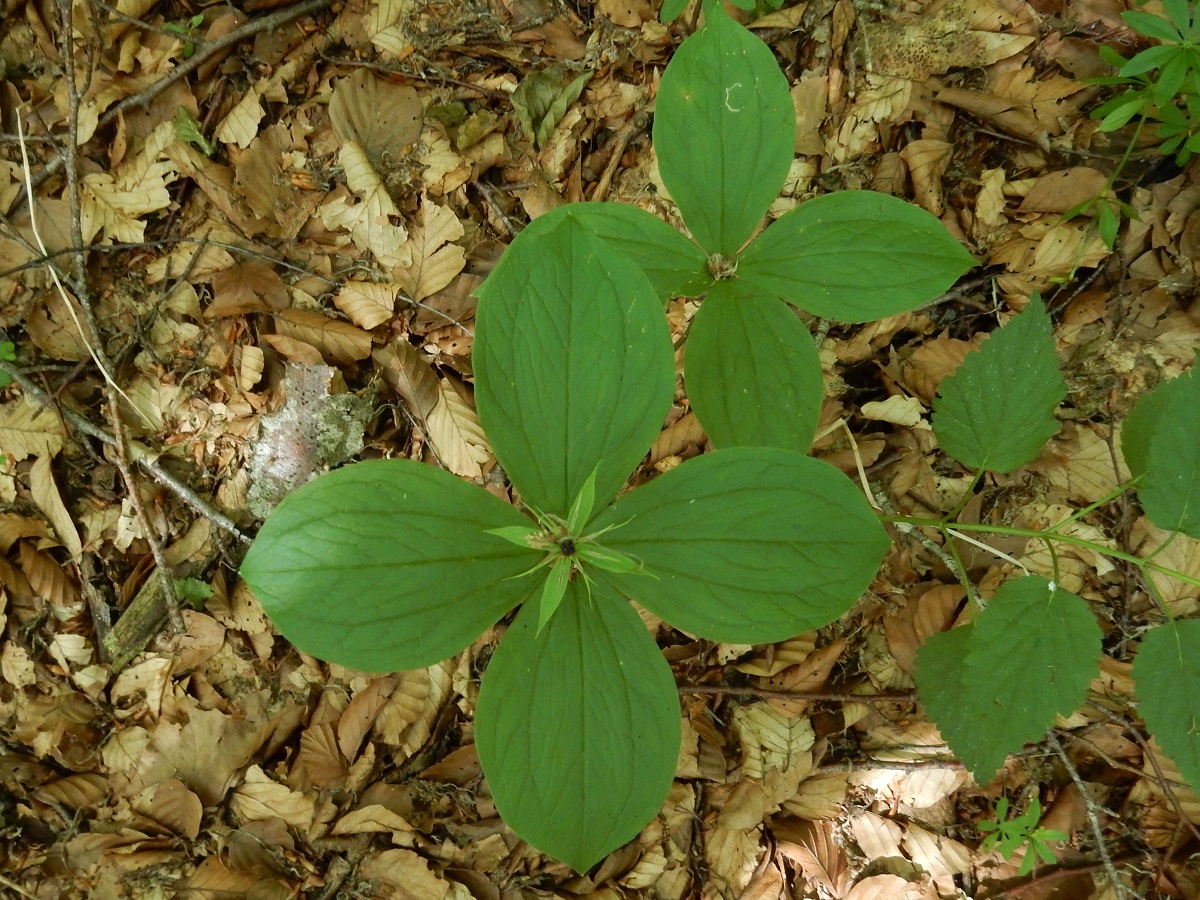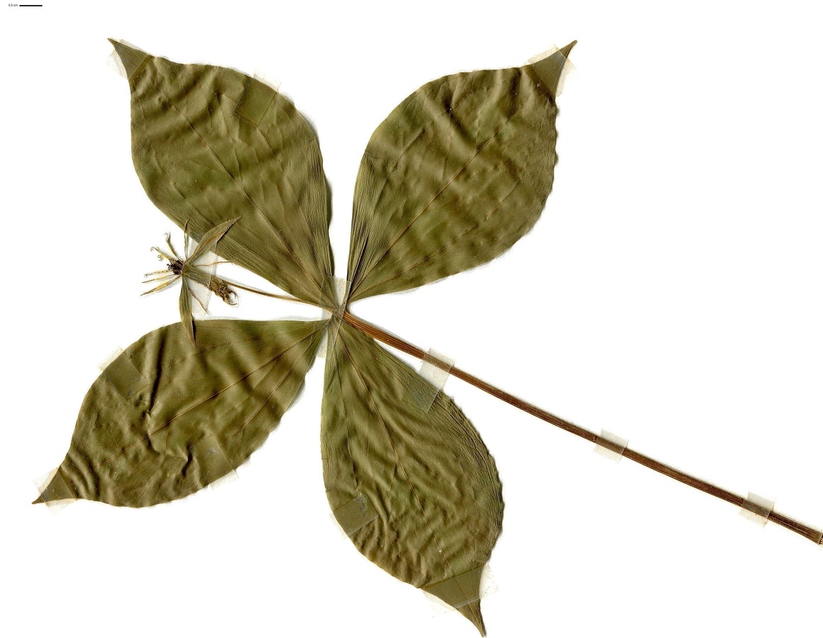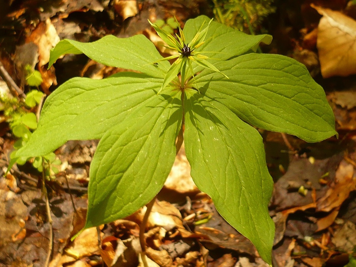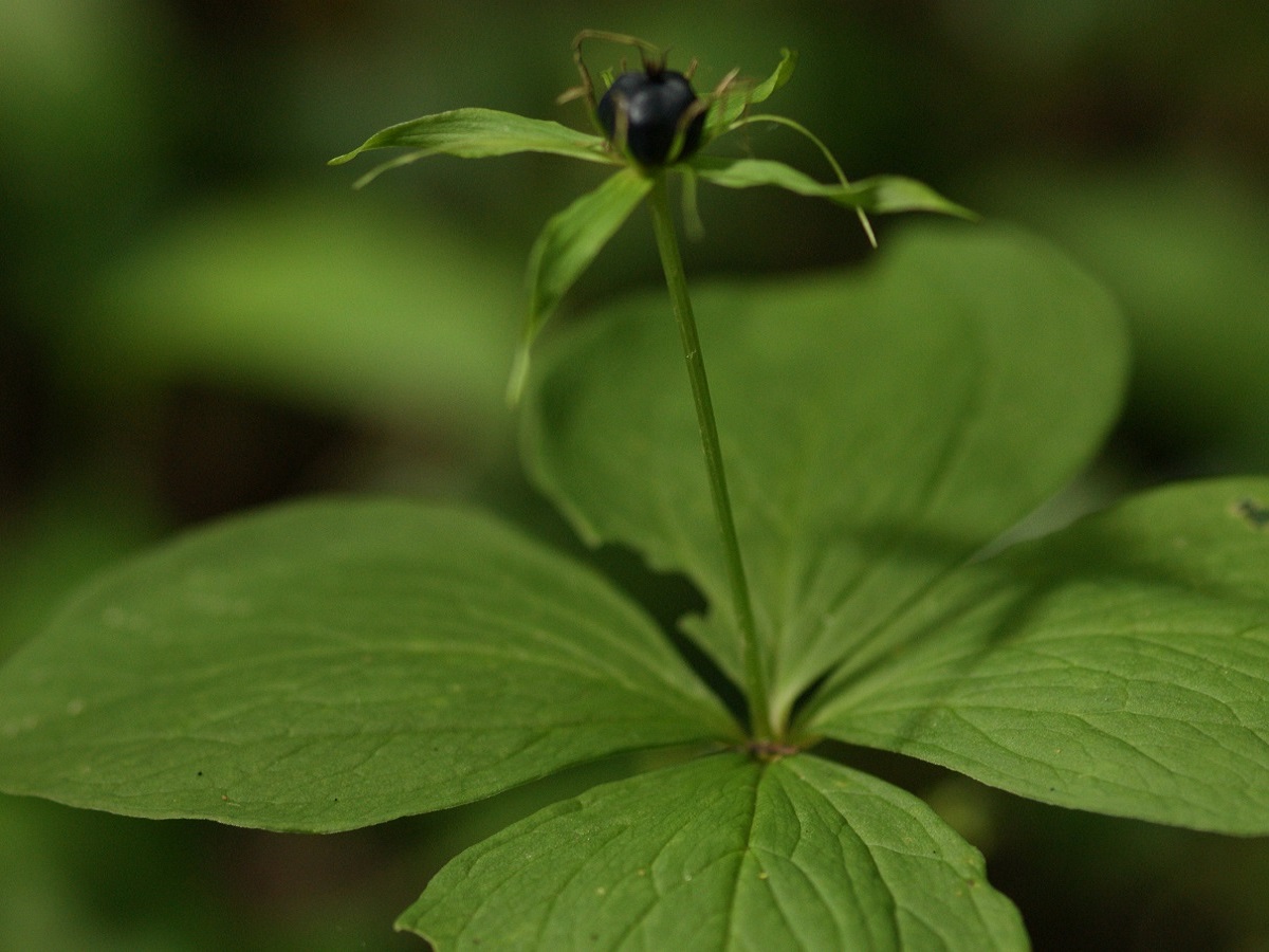 G à rhizome – 2-4 dm – Feuilles 4(-6), verticillées, ovales-aiguës – Fleur de Ø 2-3 cm teminale solitaire, verdâtre, à 4 tépales et 4 sépales en alêne étalés – Baie globuleuse noire